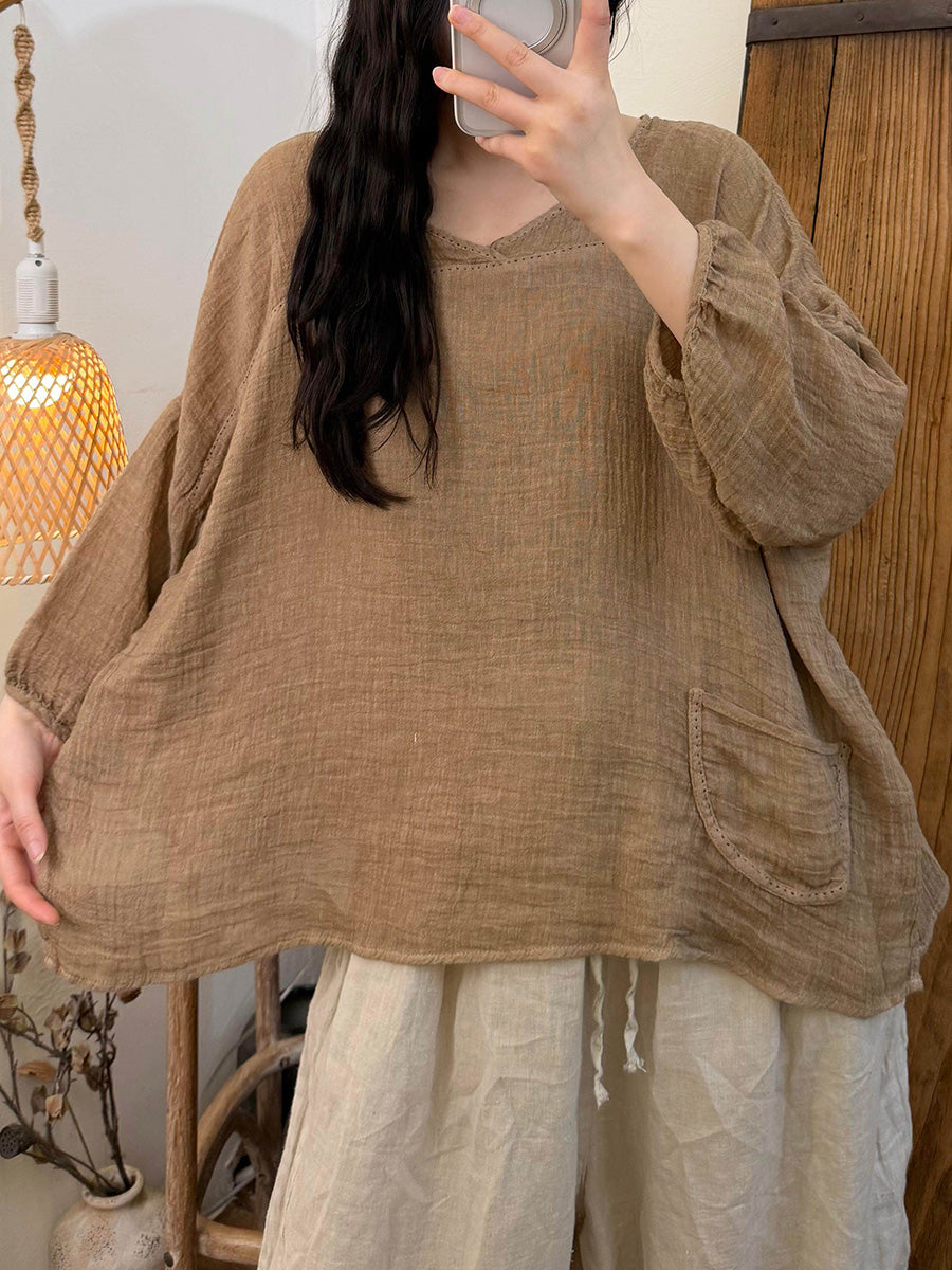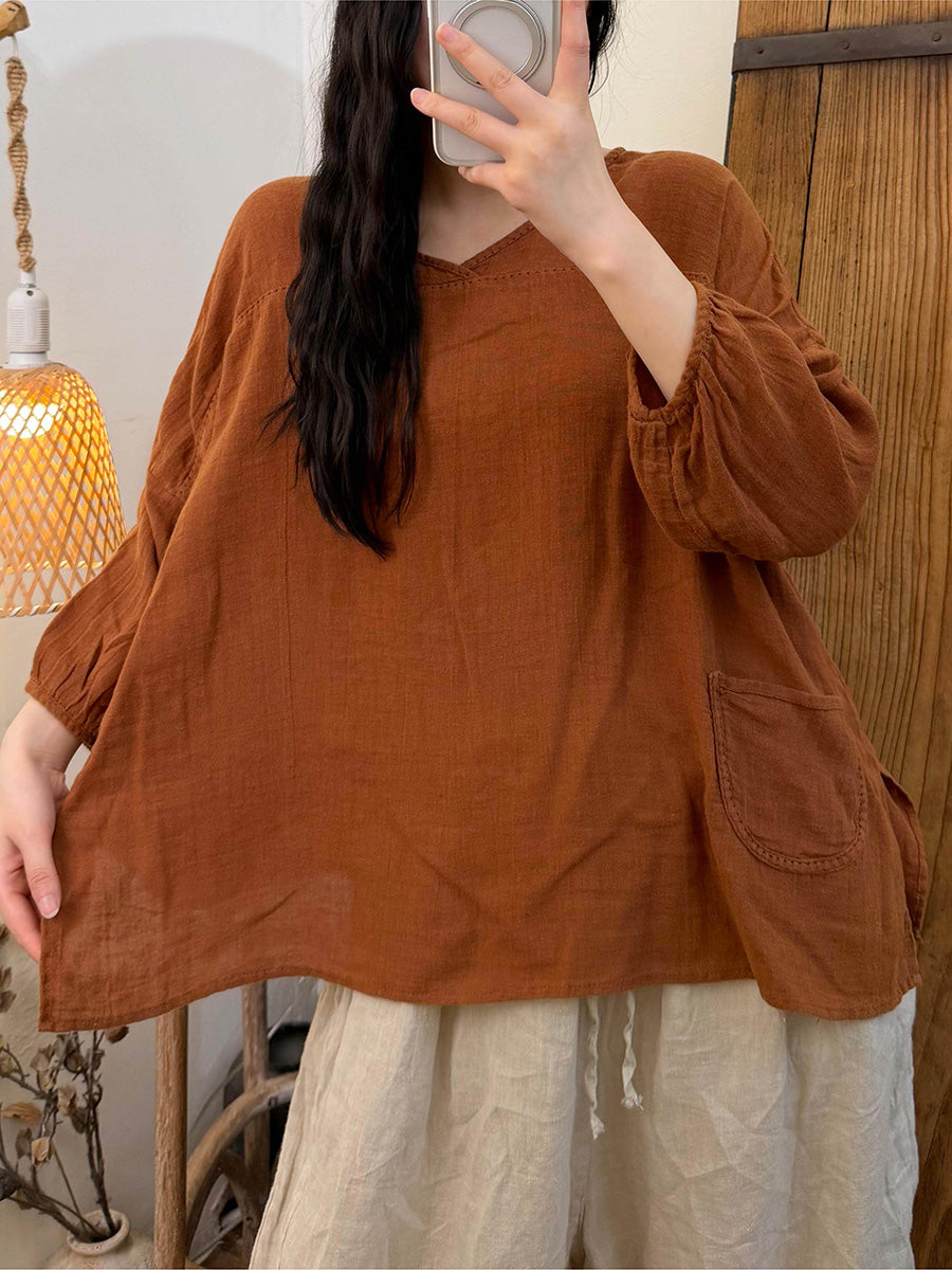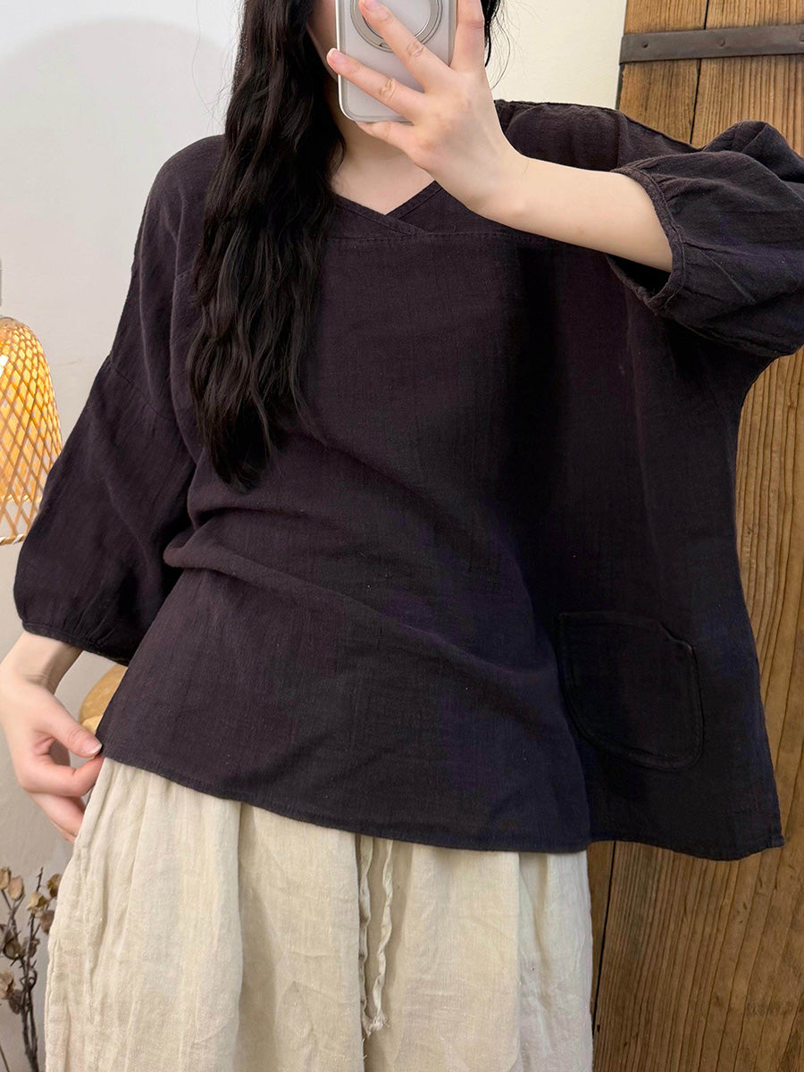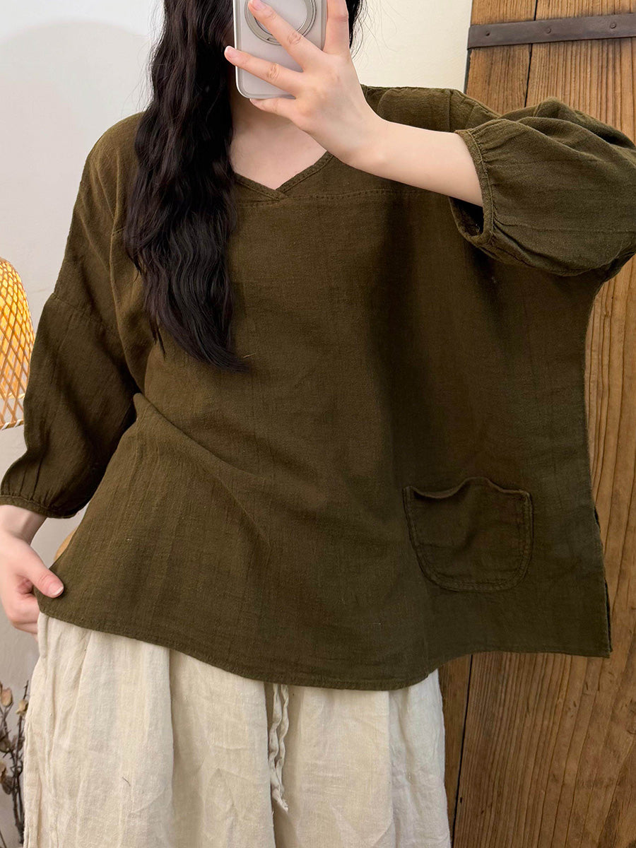 Blusa de lino de color liso con cuello en V para mujer, ideal para el verano.