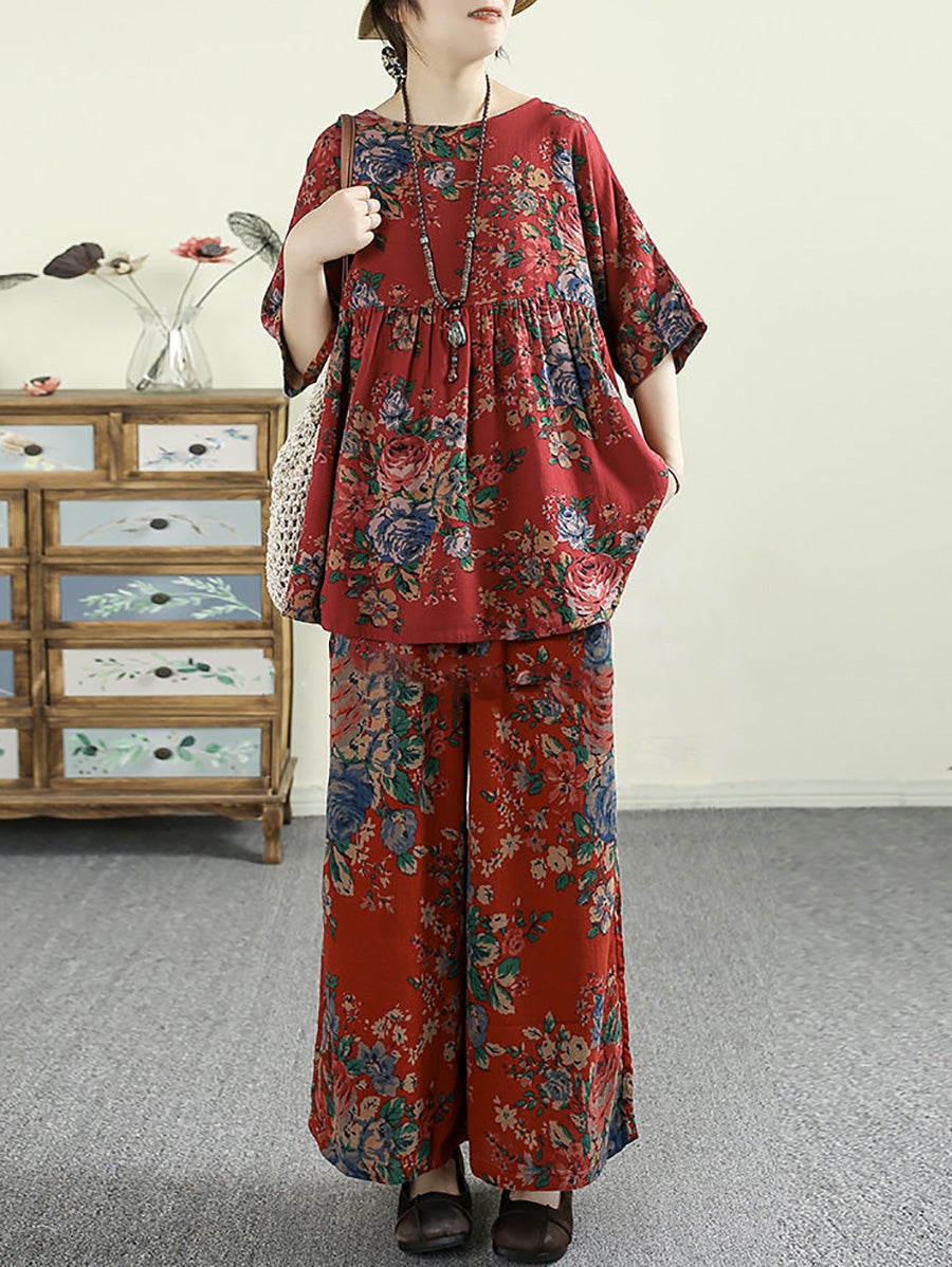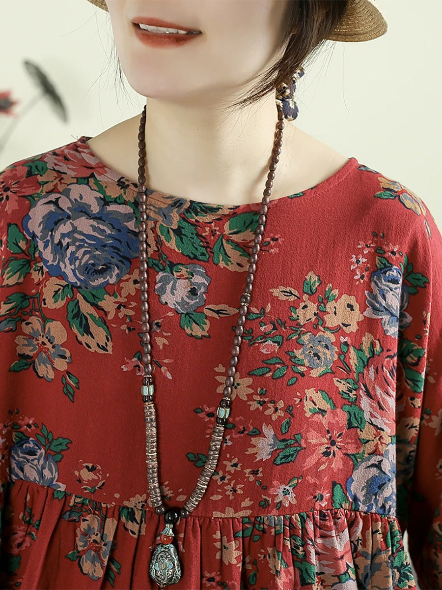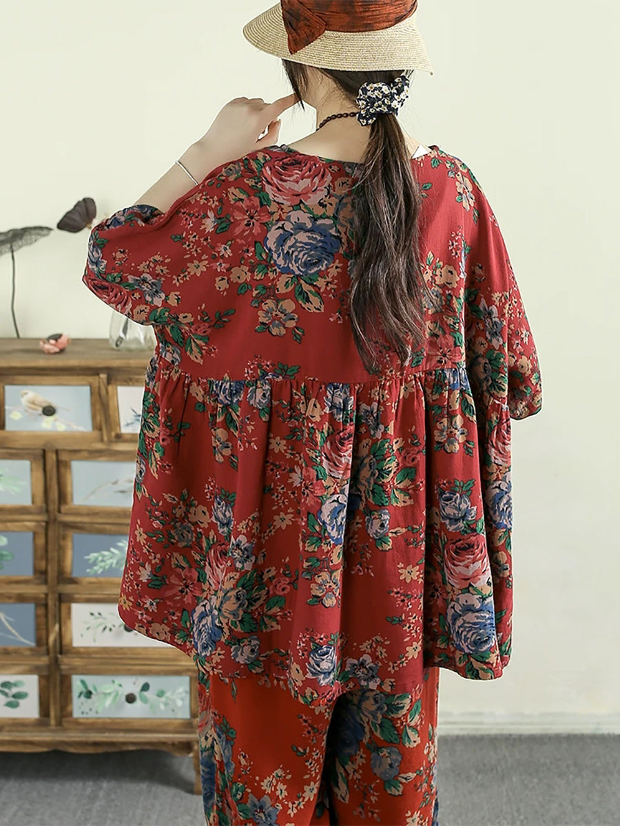 Blusa de verano para mujer, estilo retro floral, 100 % algodón, con cuello redondo