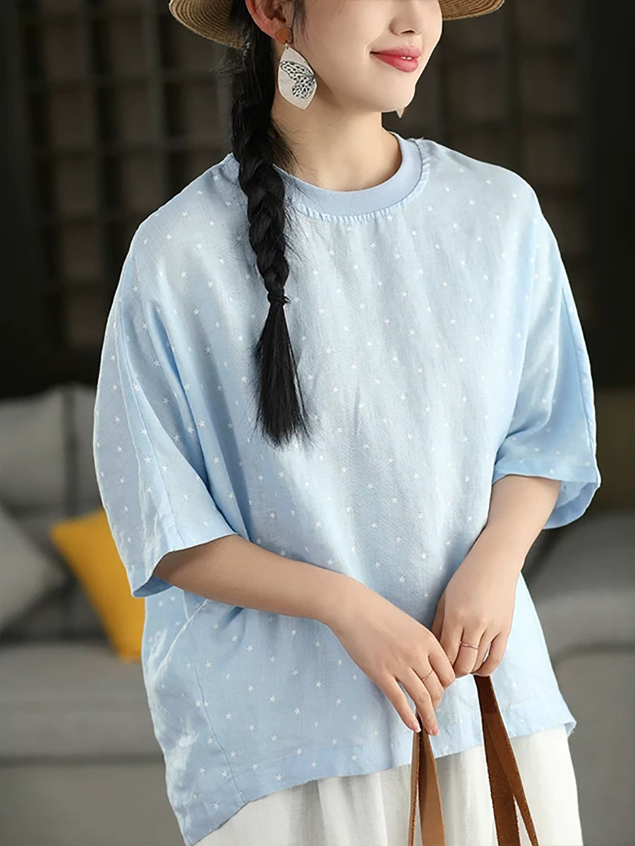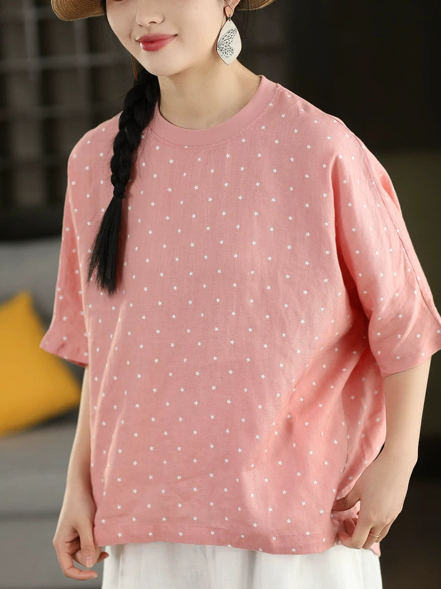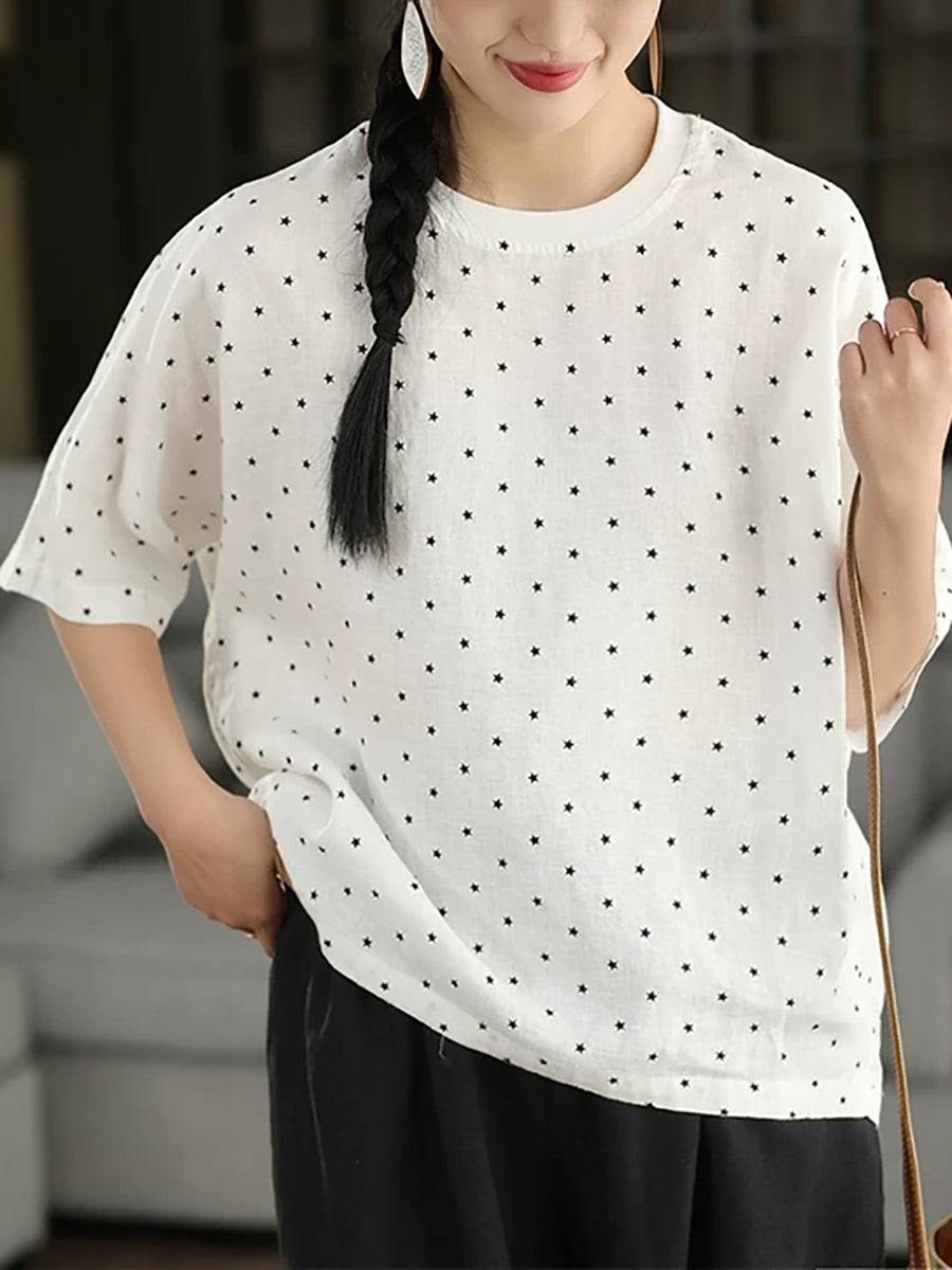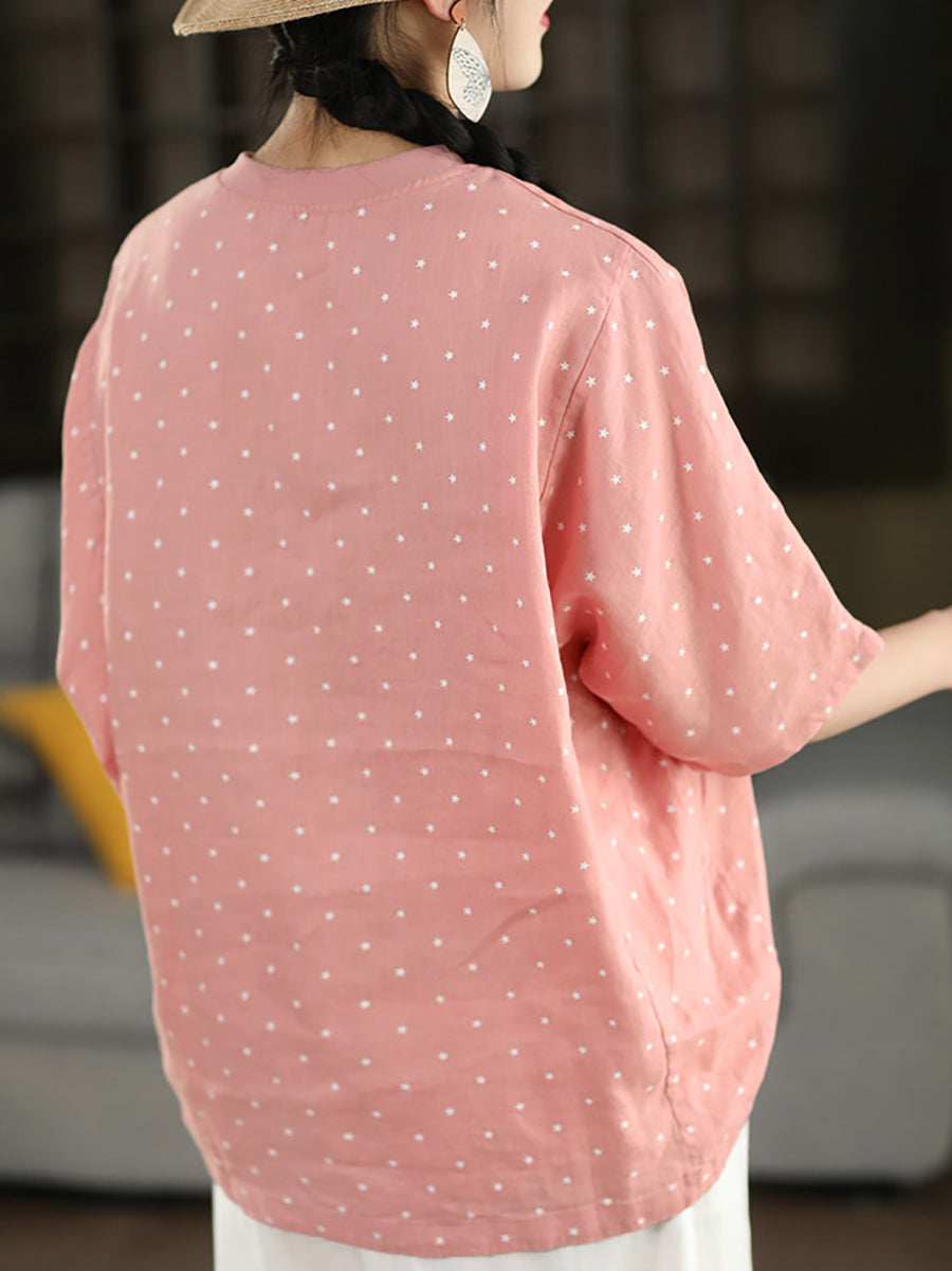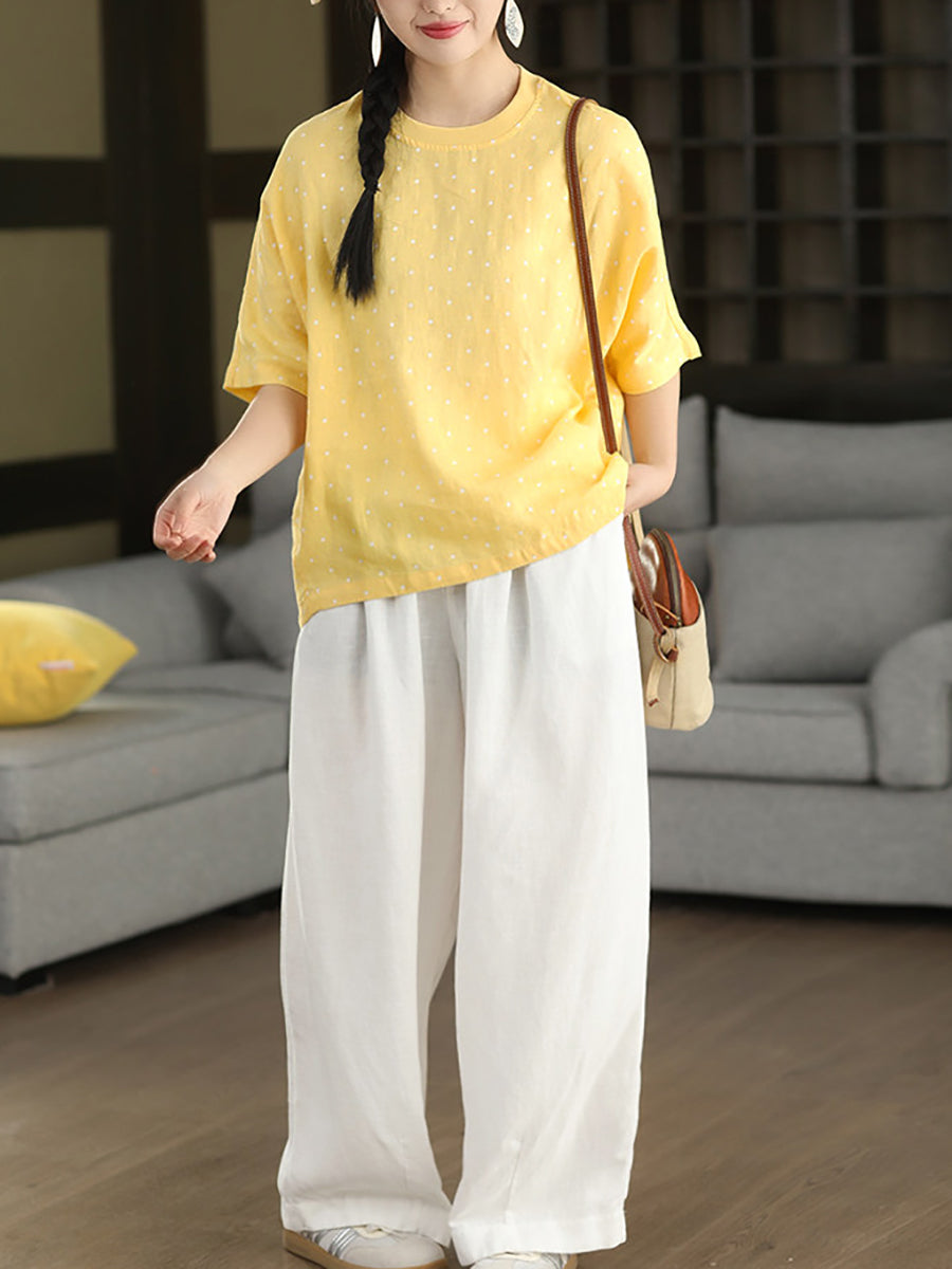Chemisier d'été à pois artistiques pour femme, col rond, 100 % lin