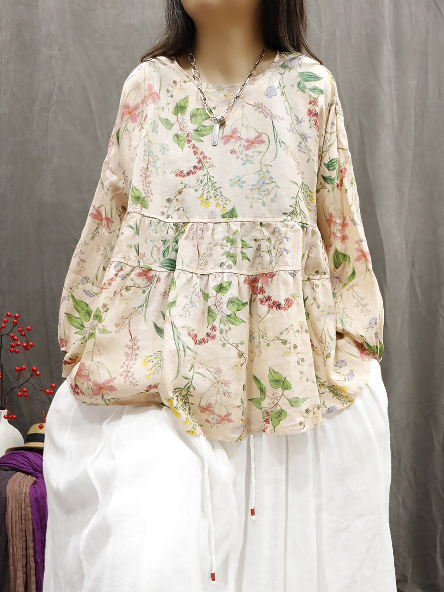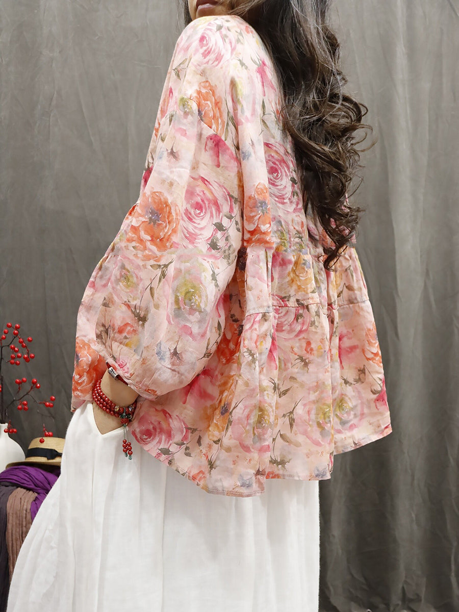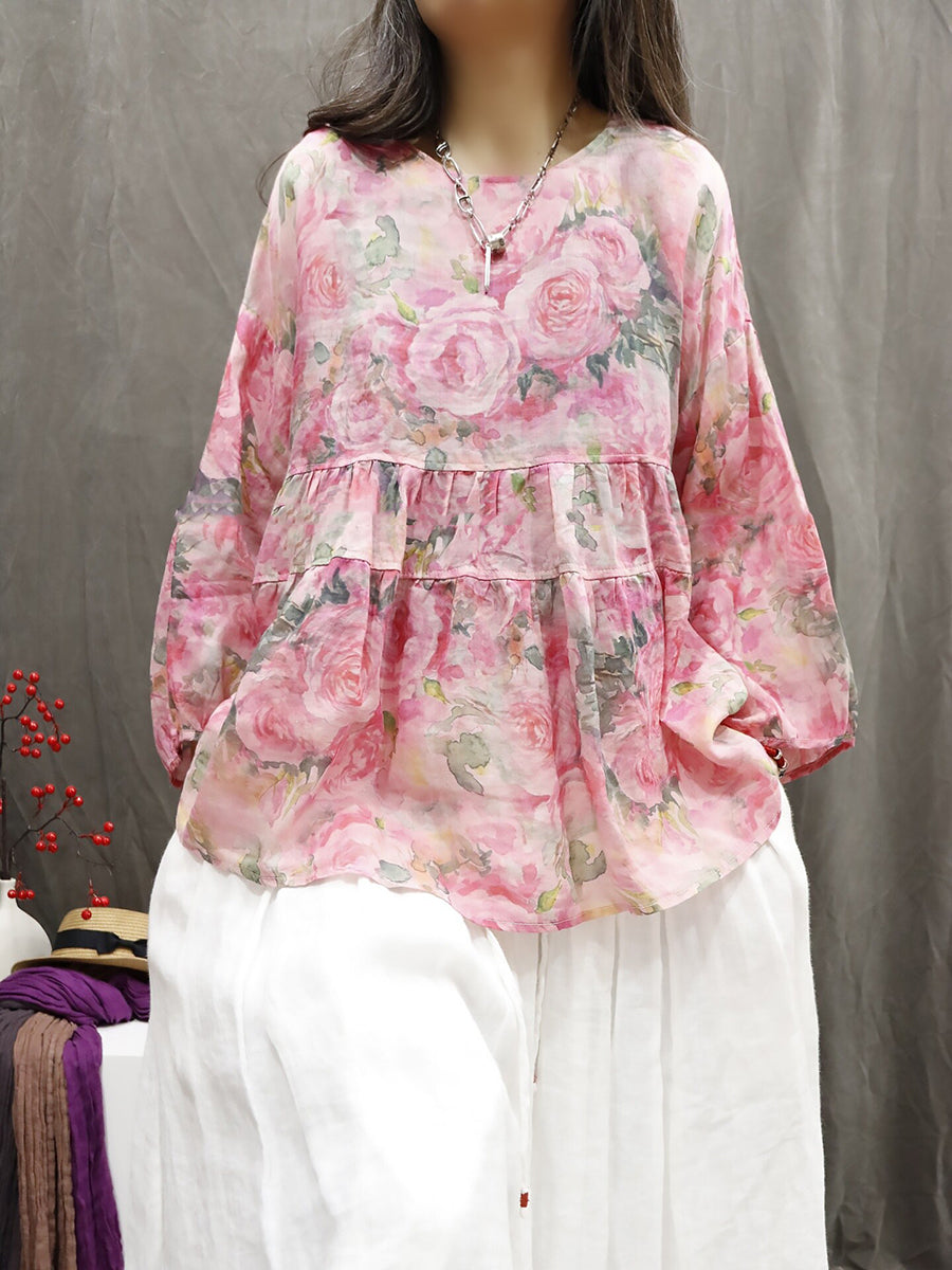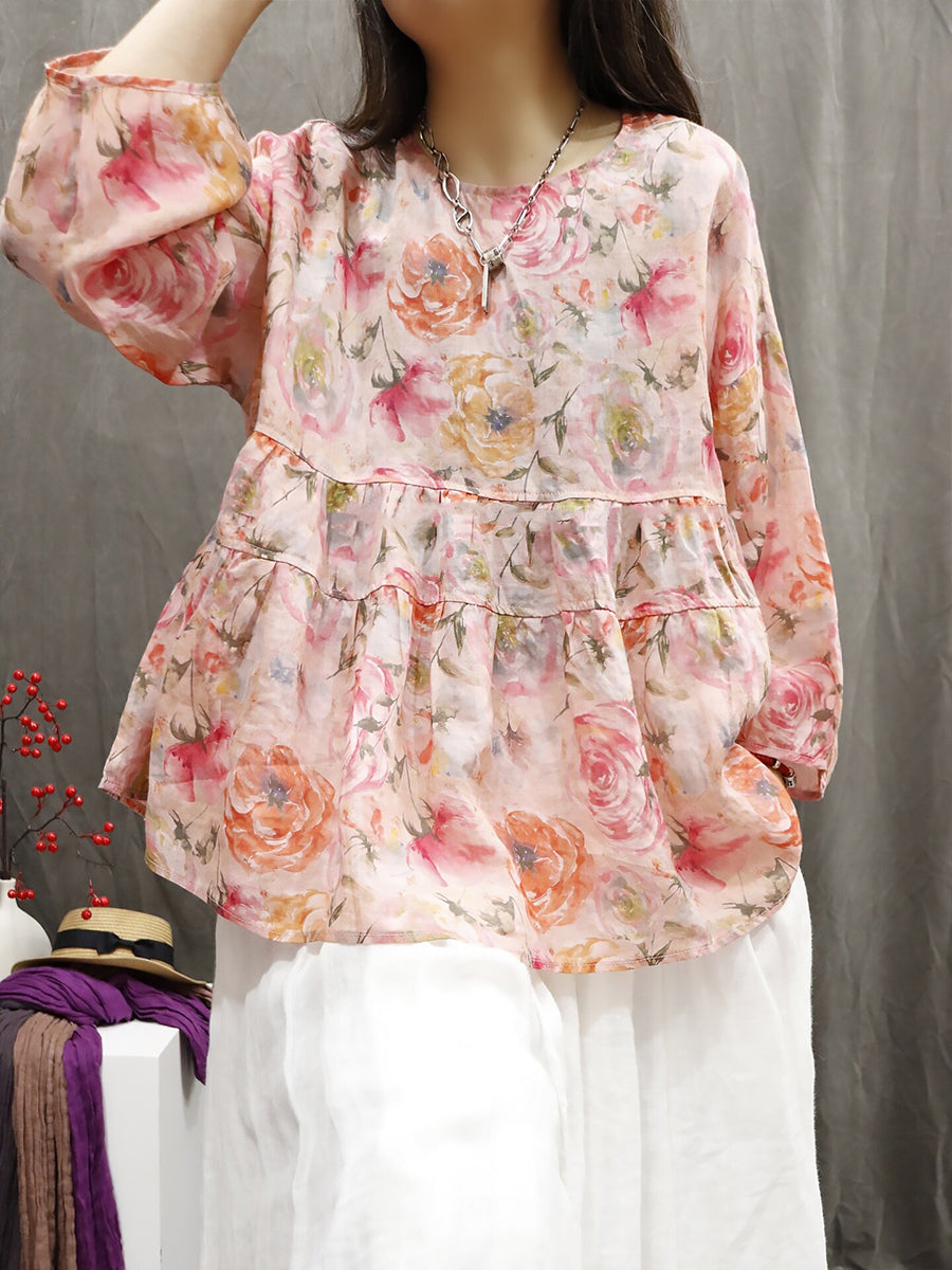 Chemise d'été pour femme à col rond et imprimé floral artistique 100% ramie
