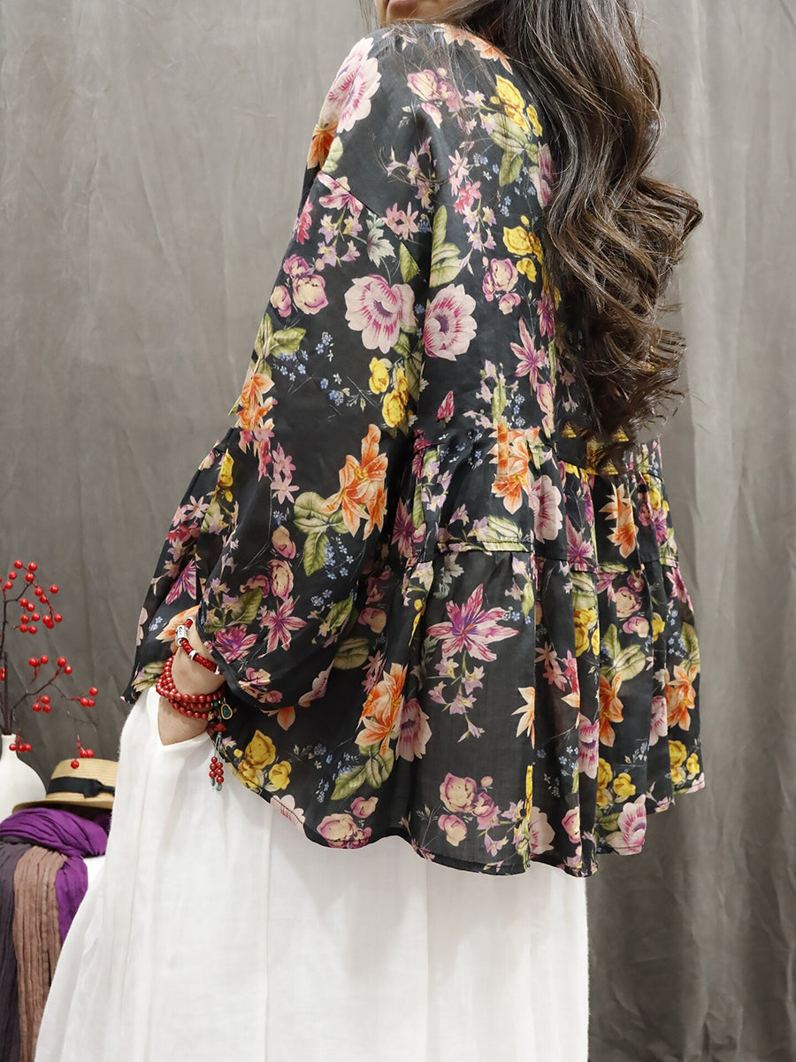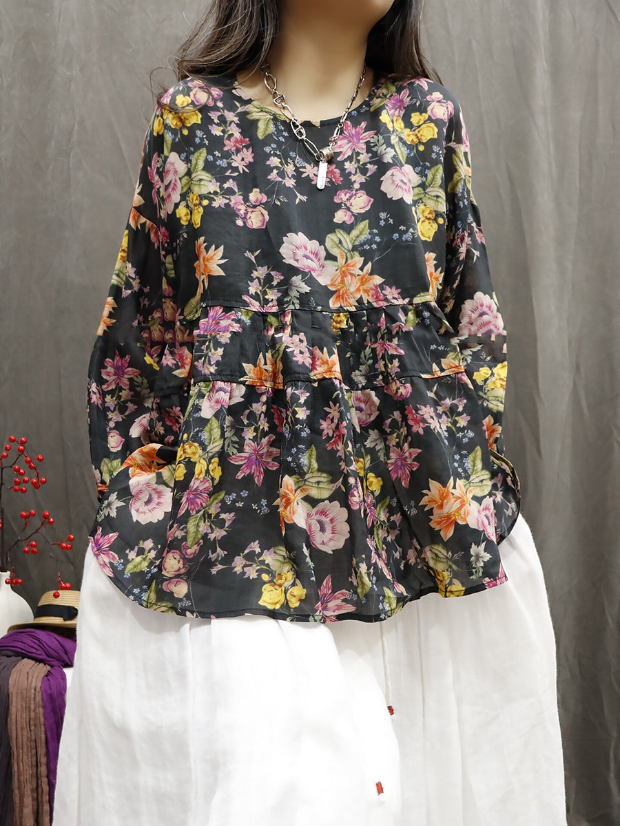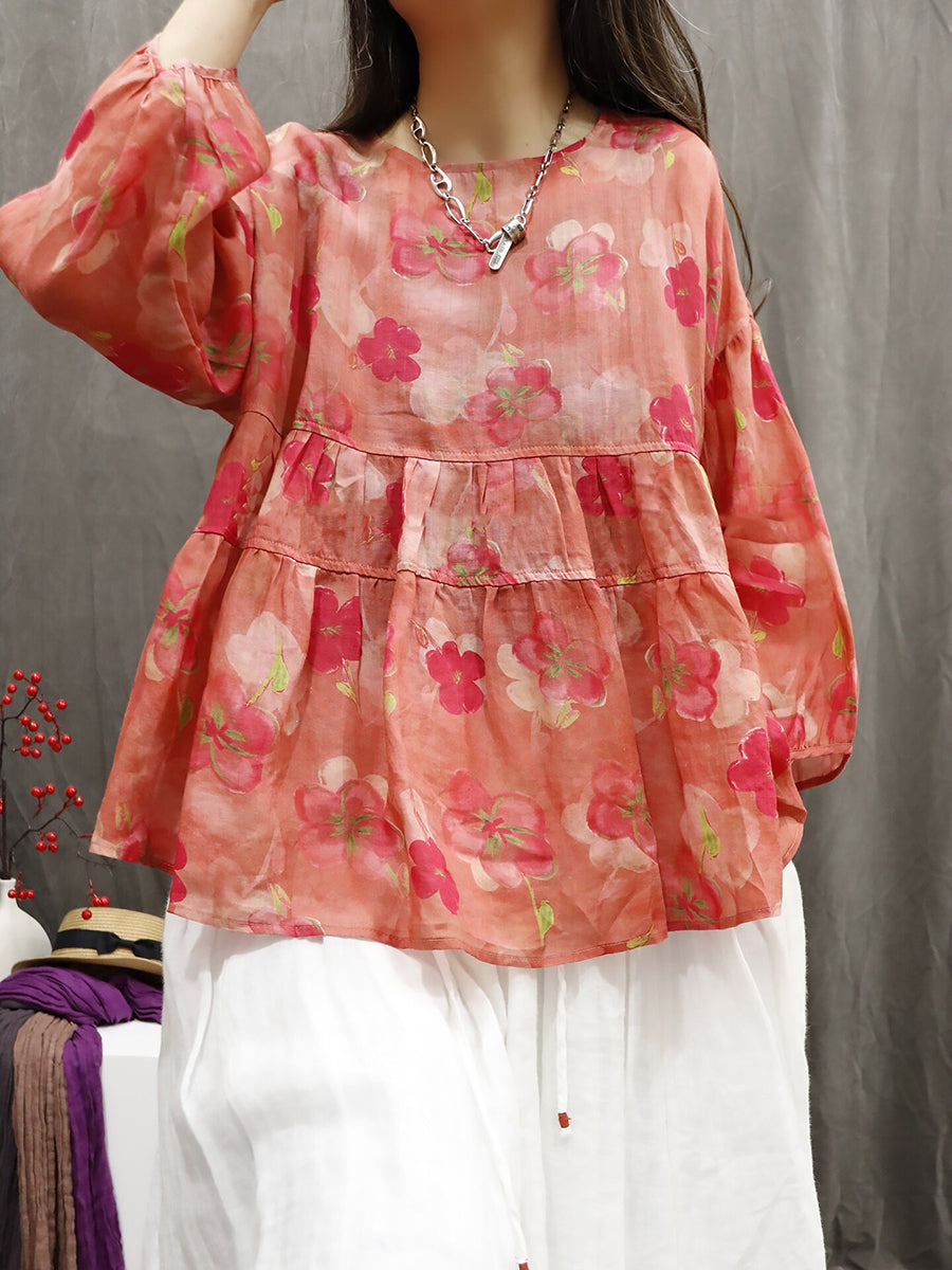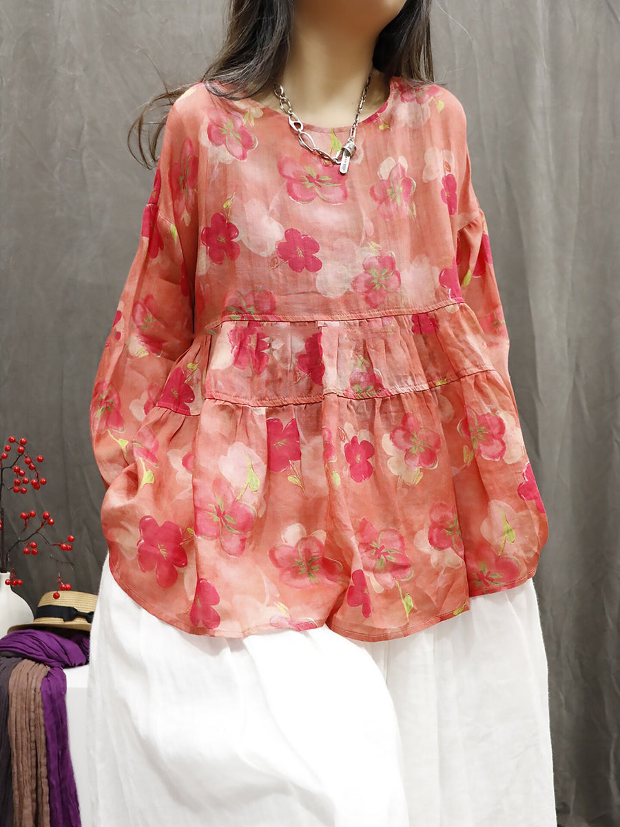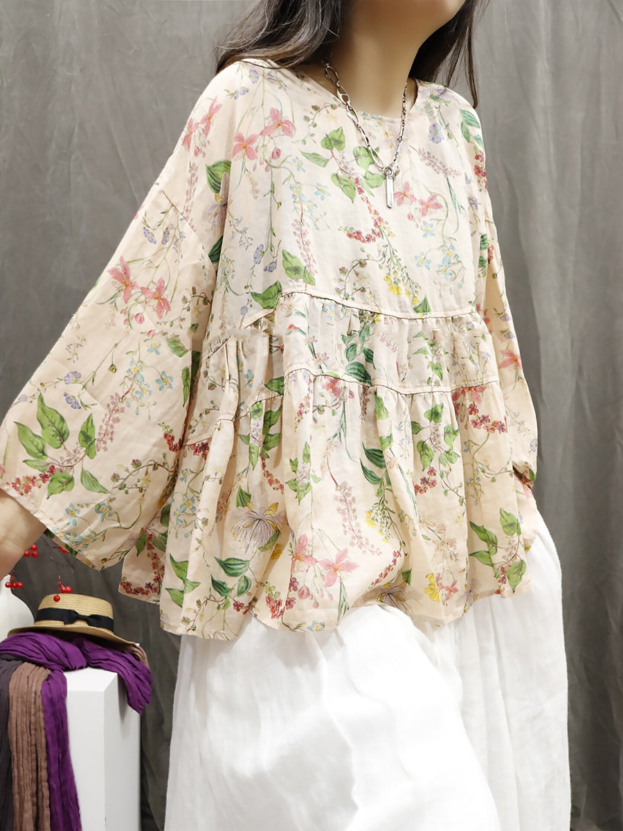 Chemise d'été pour femme à col rond et imprimé floral artistique 100% ramie