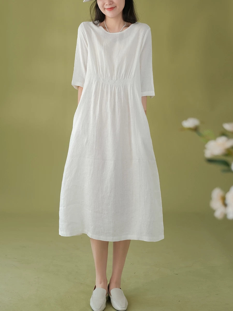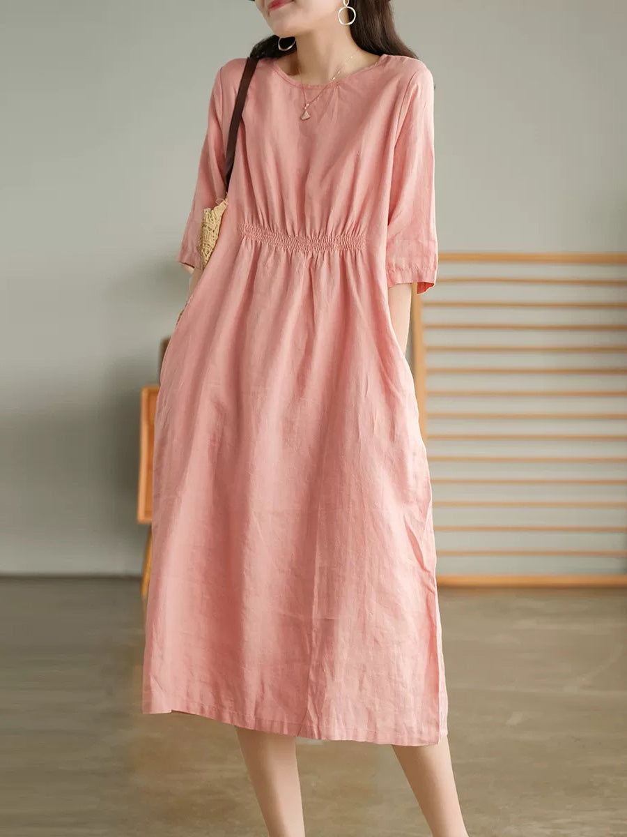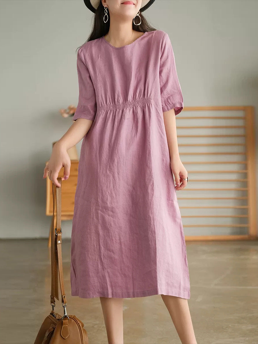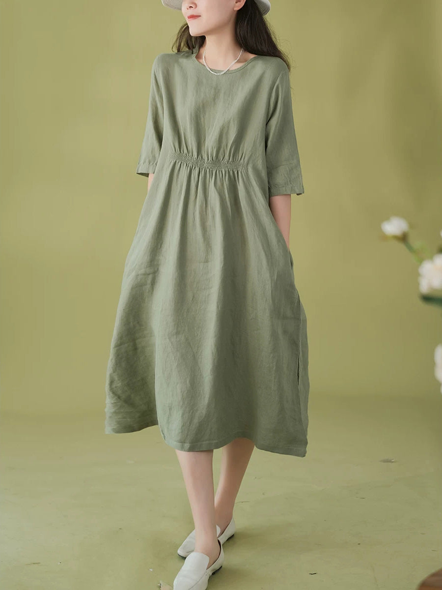 Robe d'été pour femme, style artistique, couleur unie, col rond, 100 % lin