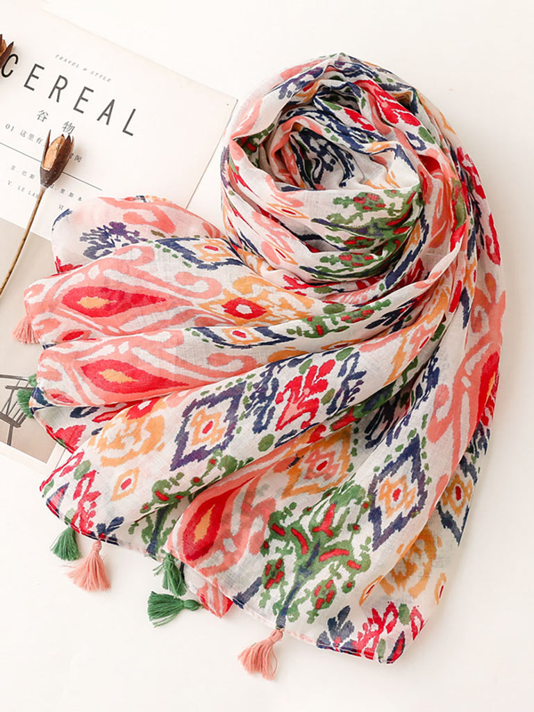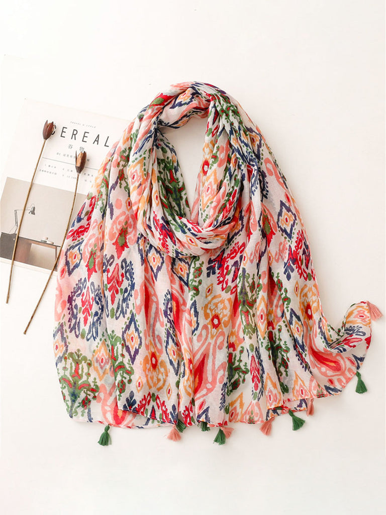 Cette écharpe à pampilles imprimée multicolore pour femme présente un élégant motif floral qui fera ressortir votre tenue. L'écharpe est faite de tissu polyester durable et doux. Cette écharpe peut être portée comme accessoire de mode ou comme article pratique.
