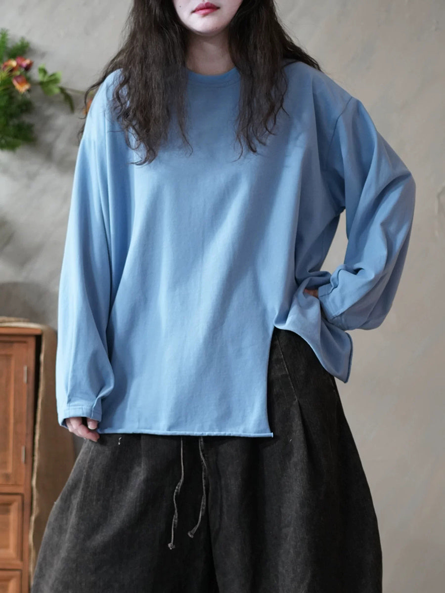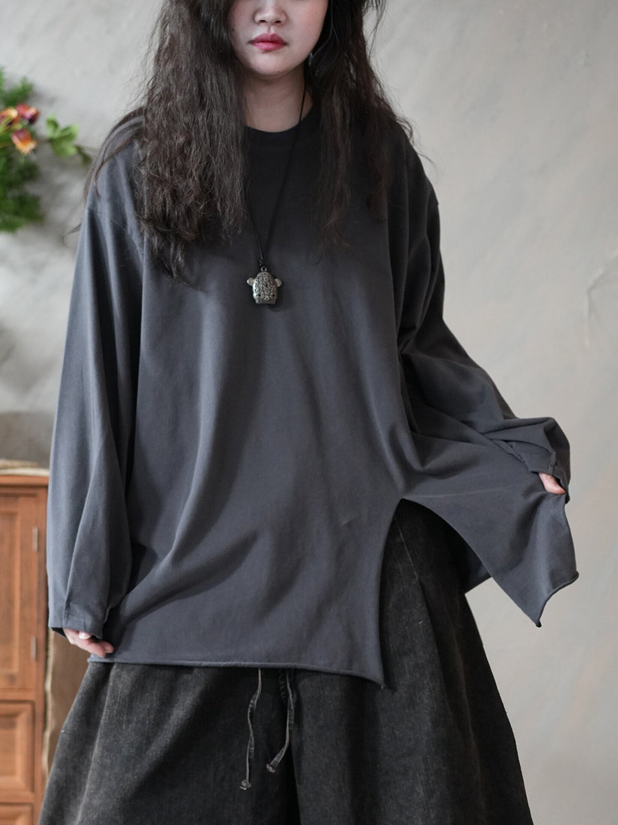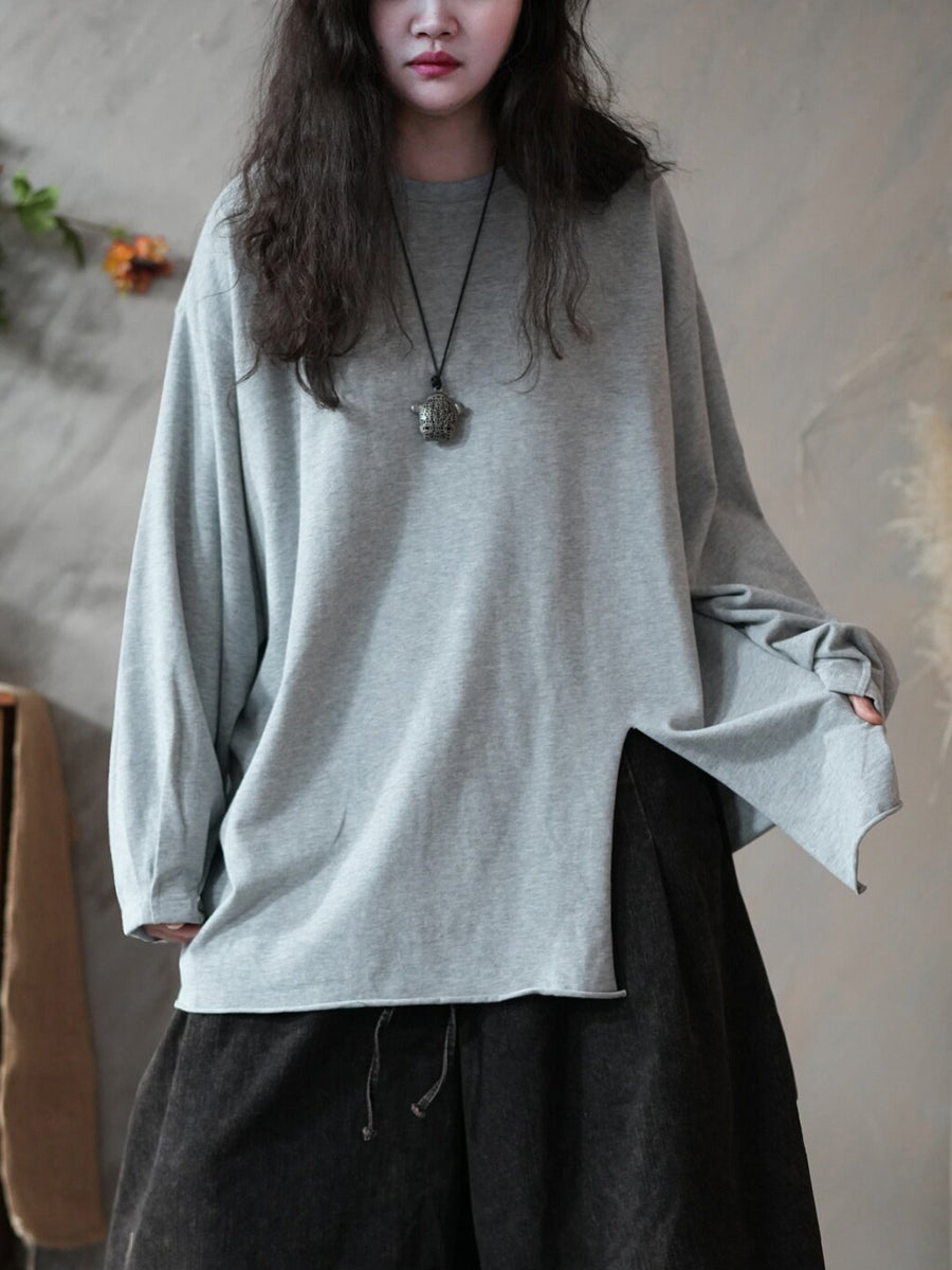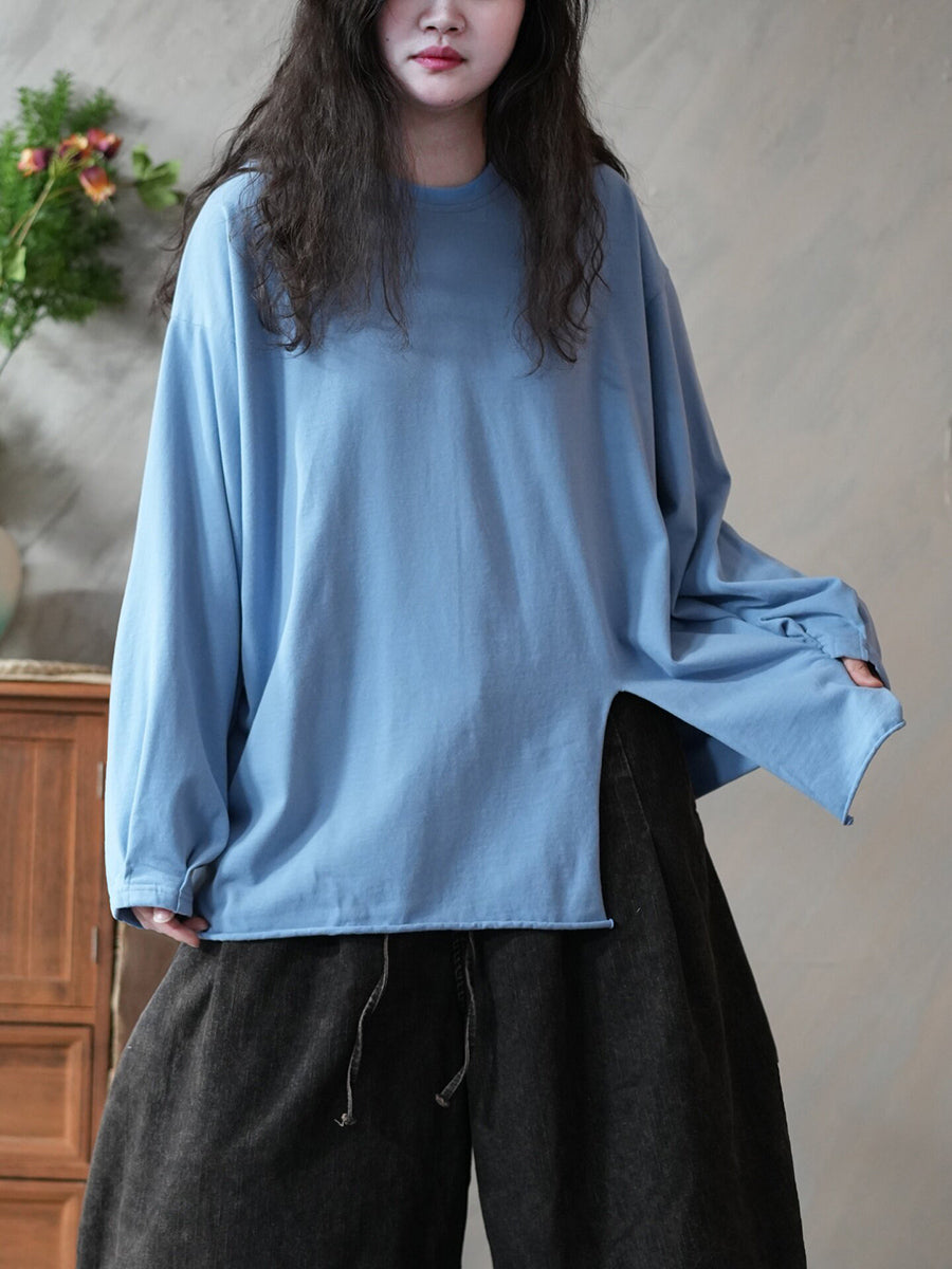 Chemisier printanier artistique pour femme, couleur unie, ourlet fendu, col rond