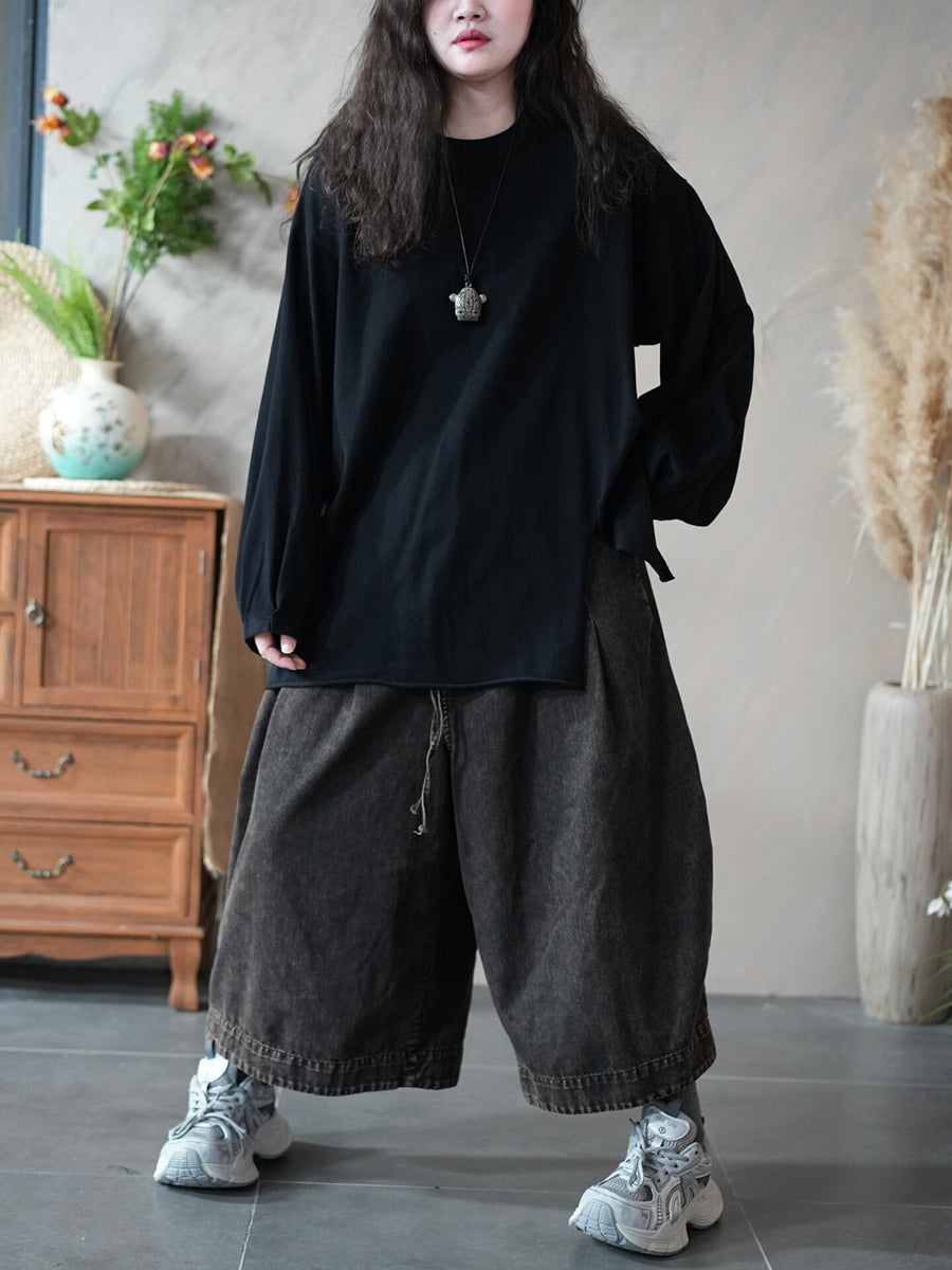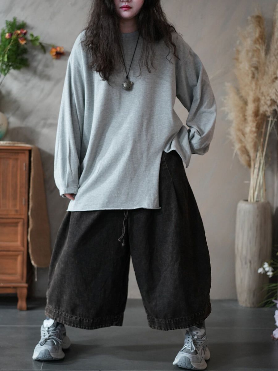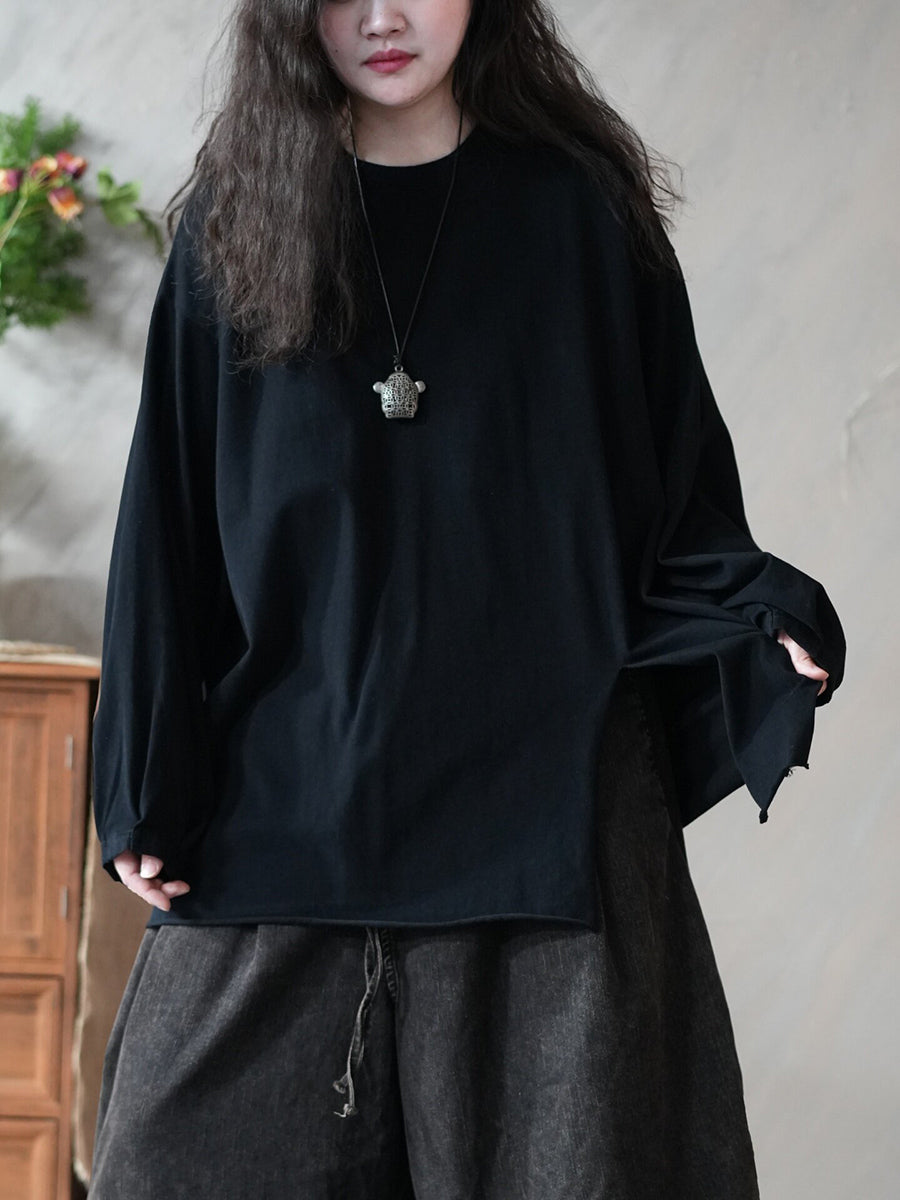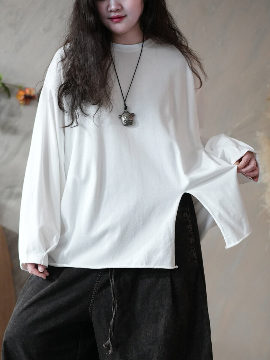 Chemisier printanier artistique pour femme, couleur unie, ourlet fendu, col rond