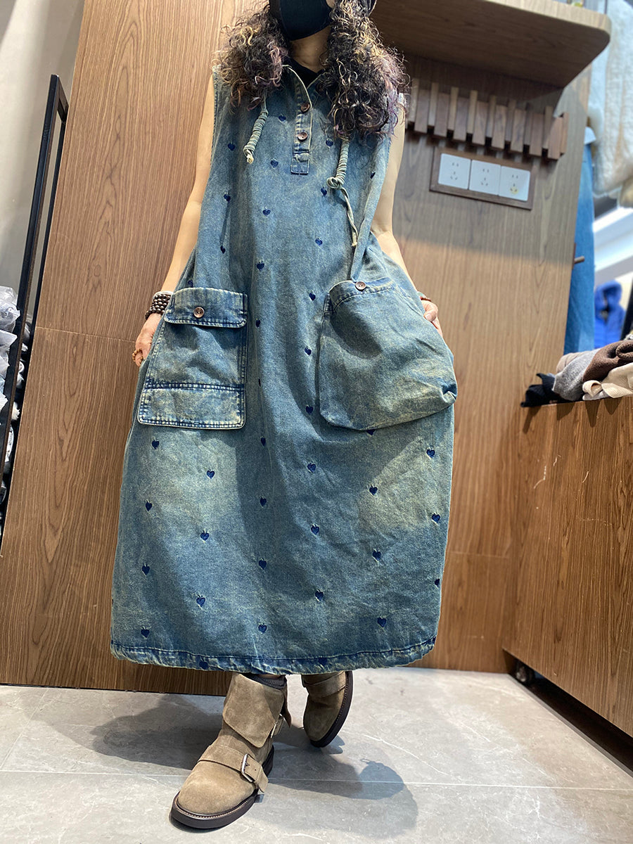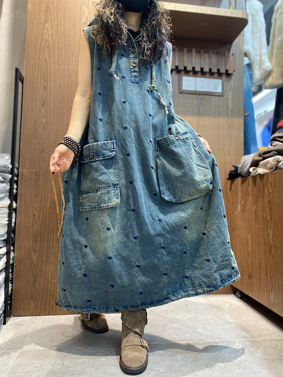 Robe sans manches en jean à capuche brodée de cœurs pour femme