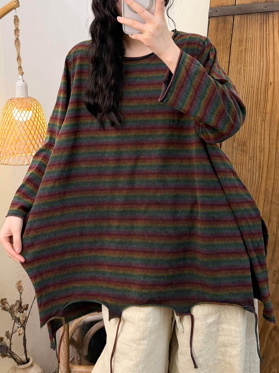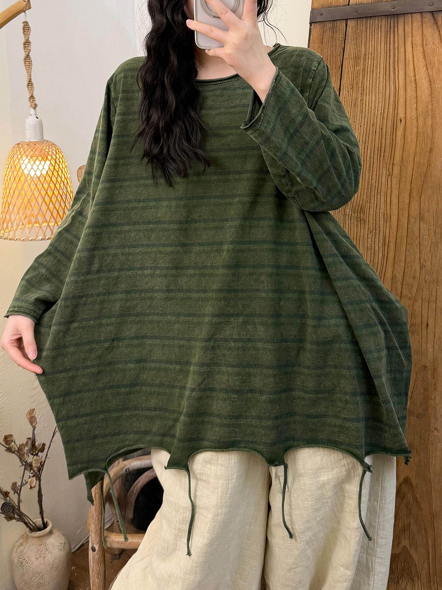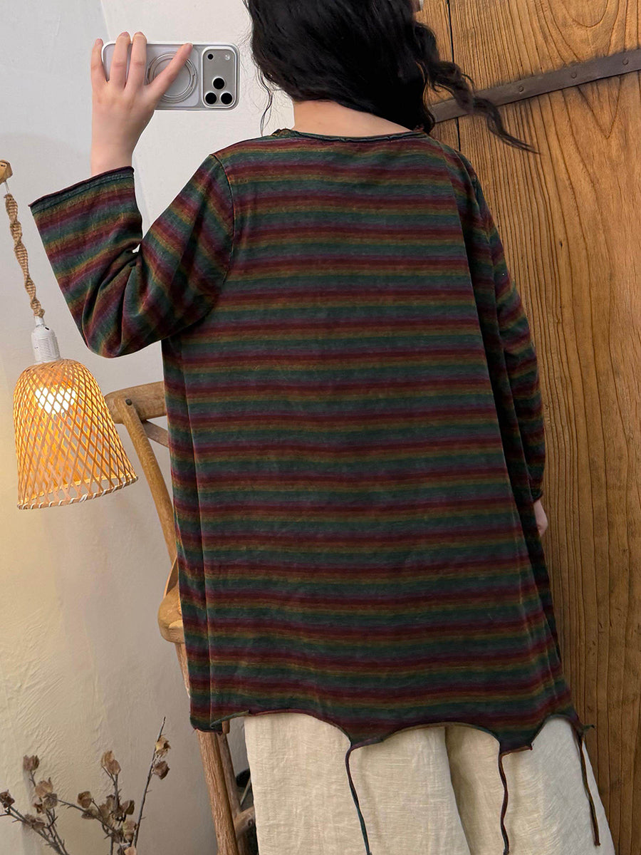 Chemisier à rayures rétro printanières en coton à ourlet à pompons et col rond pour femme