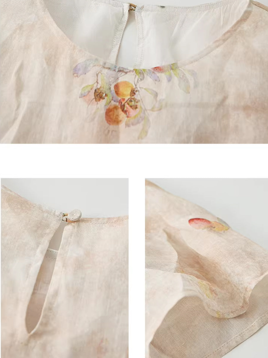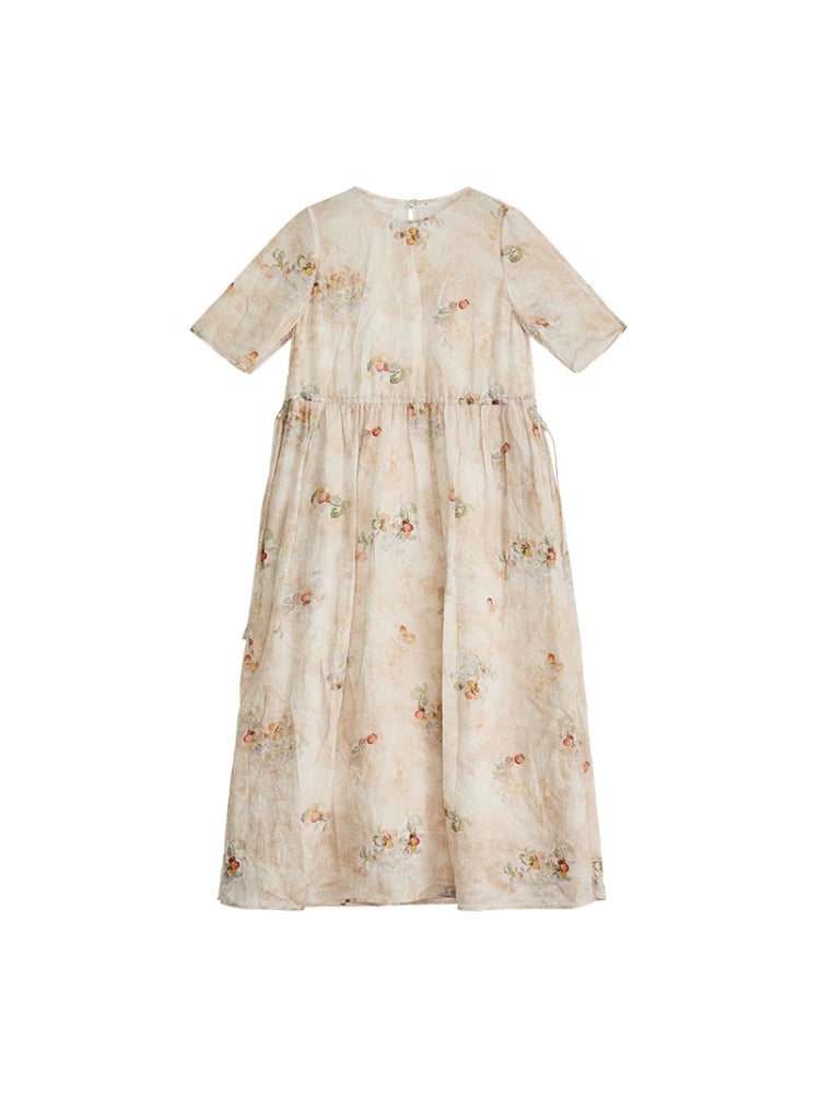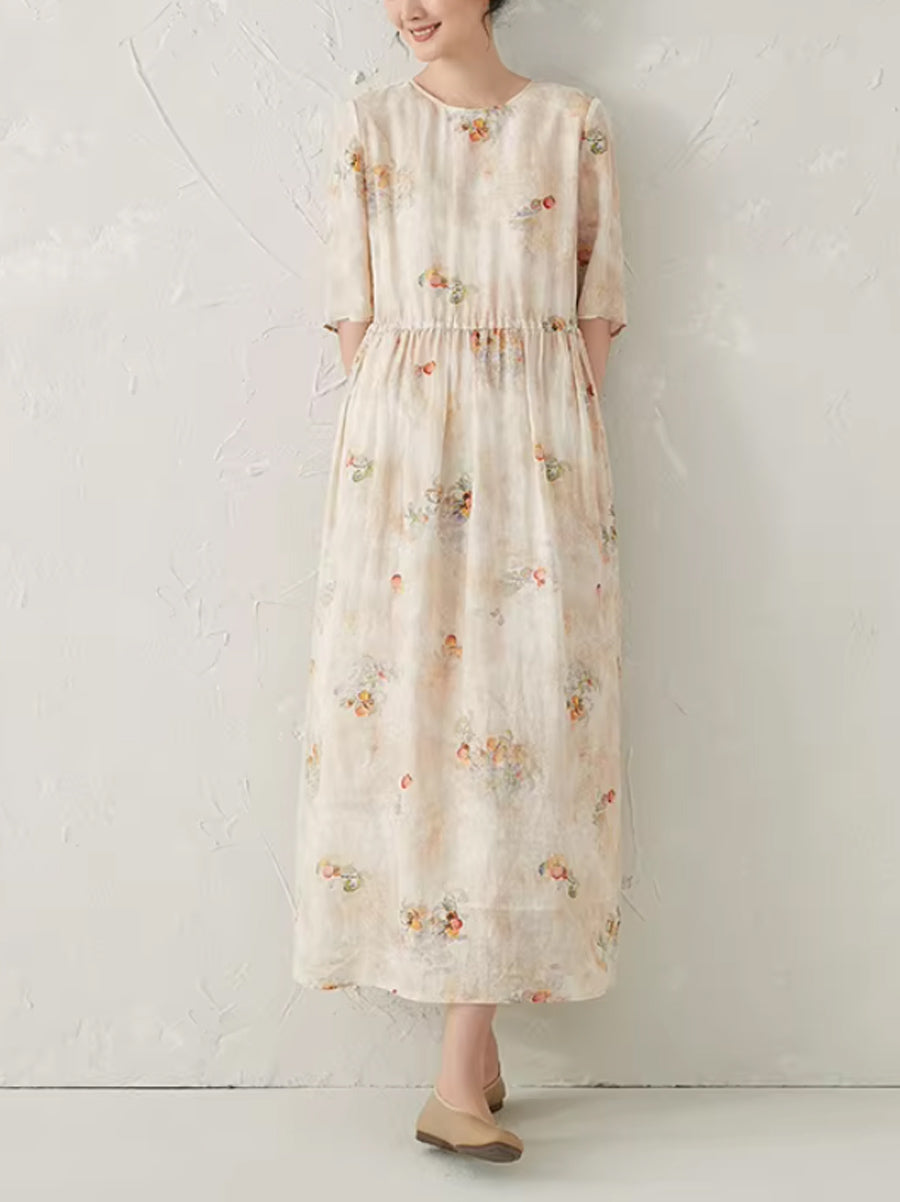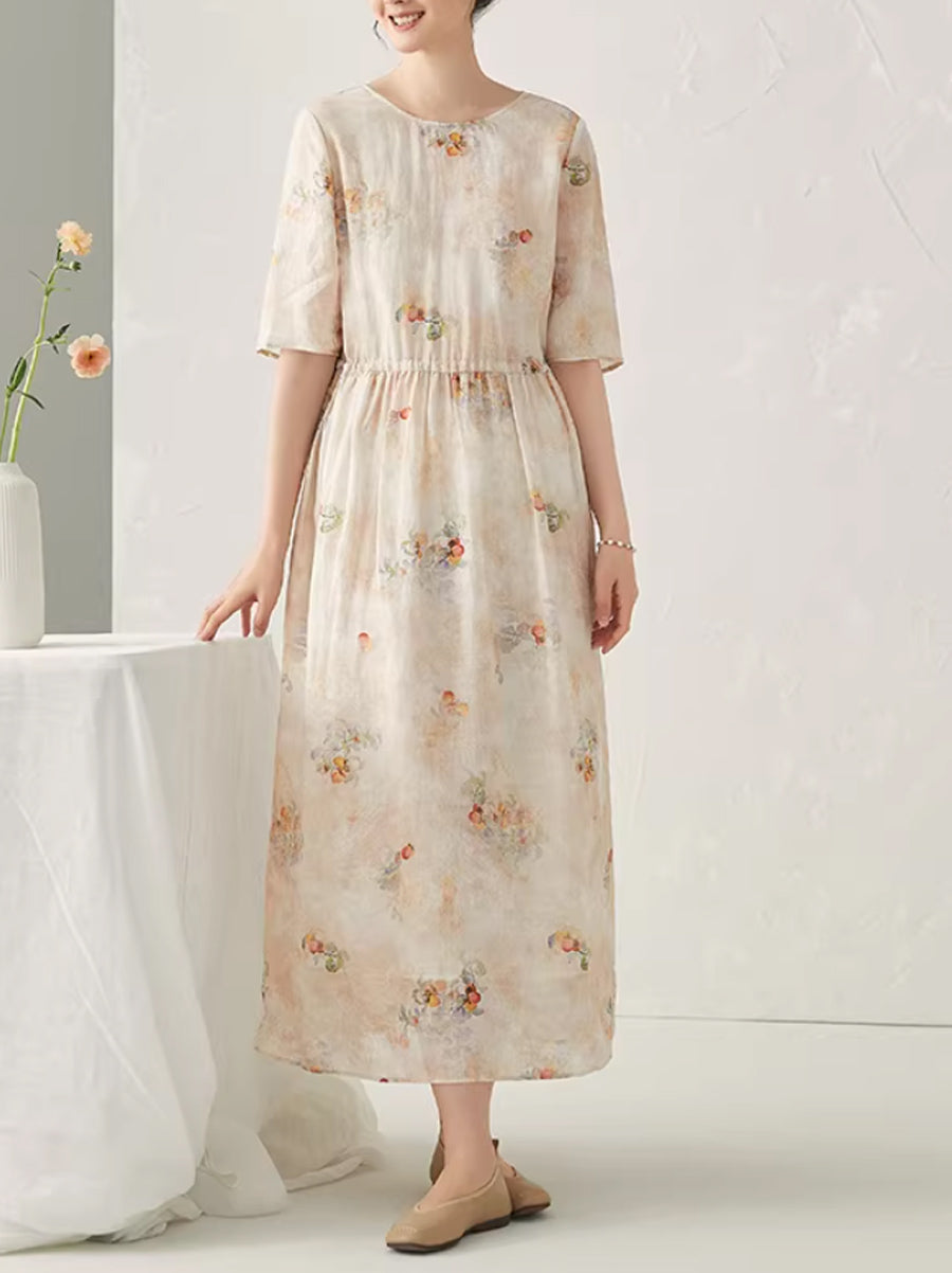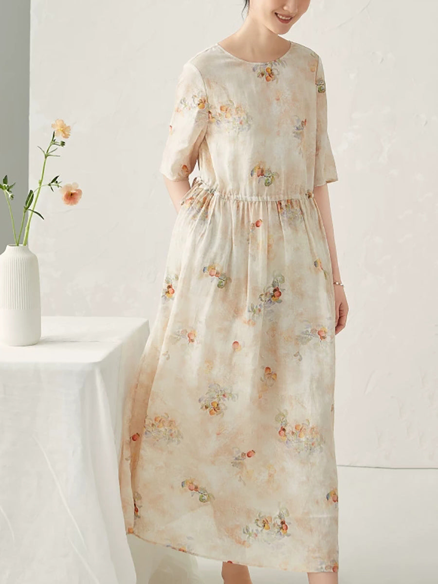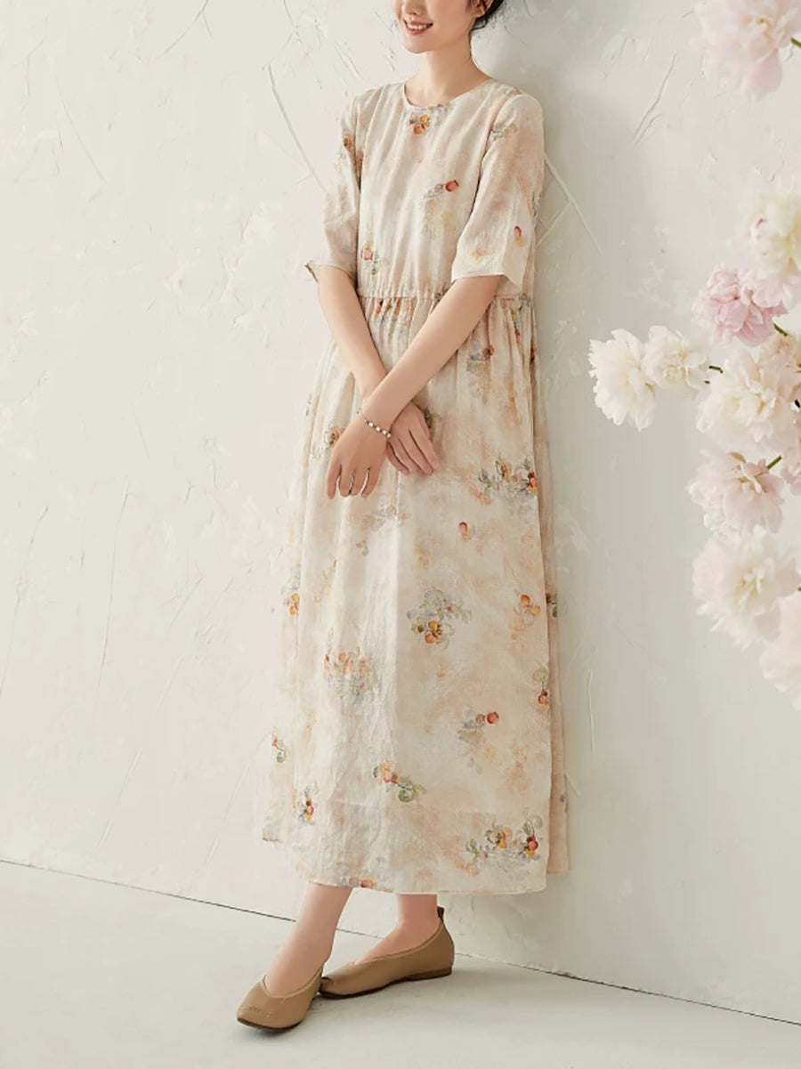 Robe d'été à fleurs artistiques pour femme, 100 % ramie, col rond
