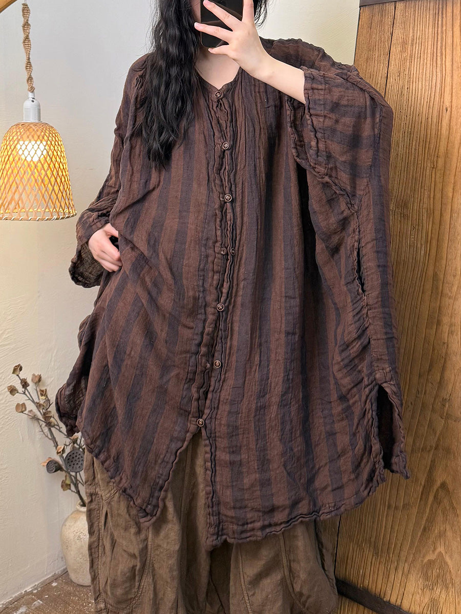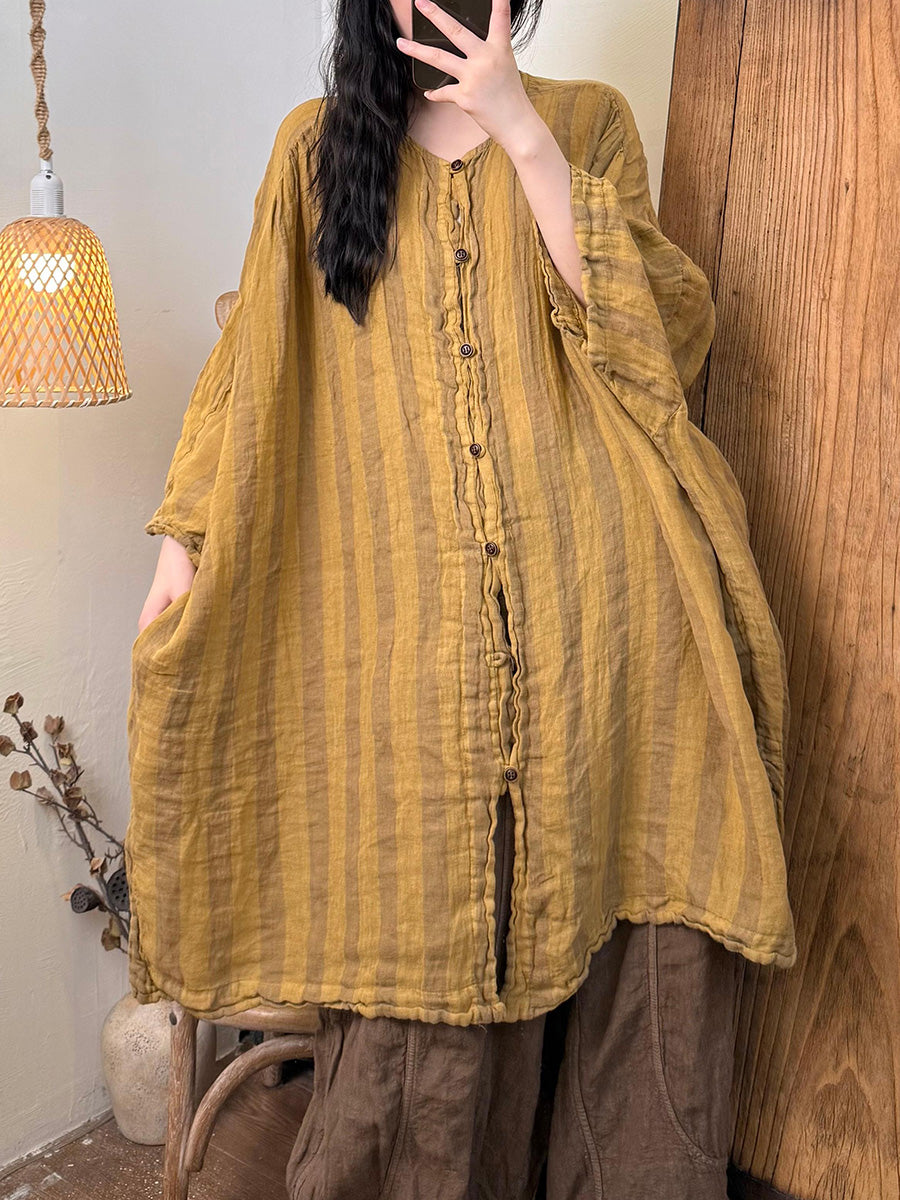 Chemise d'été en lin à rayures rétro et col rond pour femme