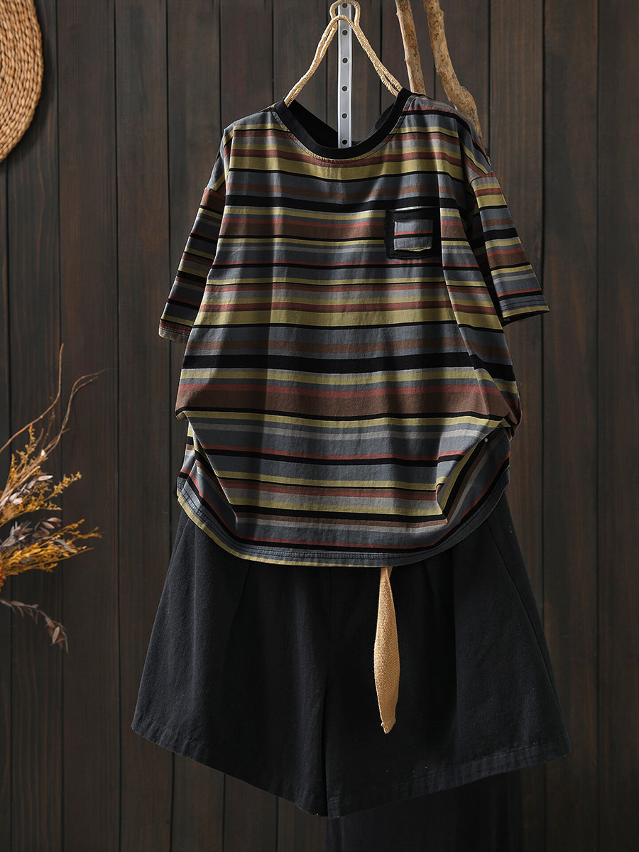 חולצת O-צוואר כותנה עם פסים לקיץ לנשים
