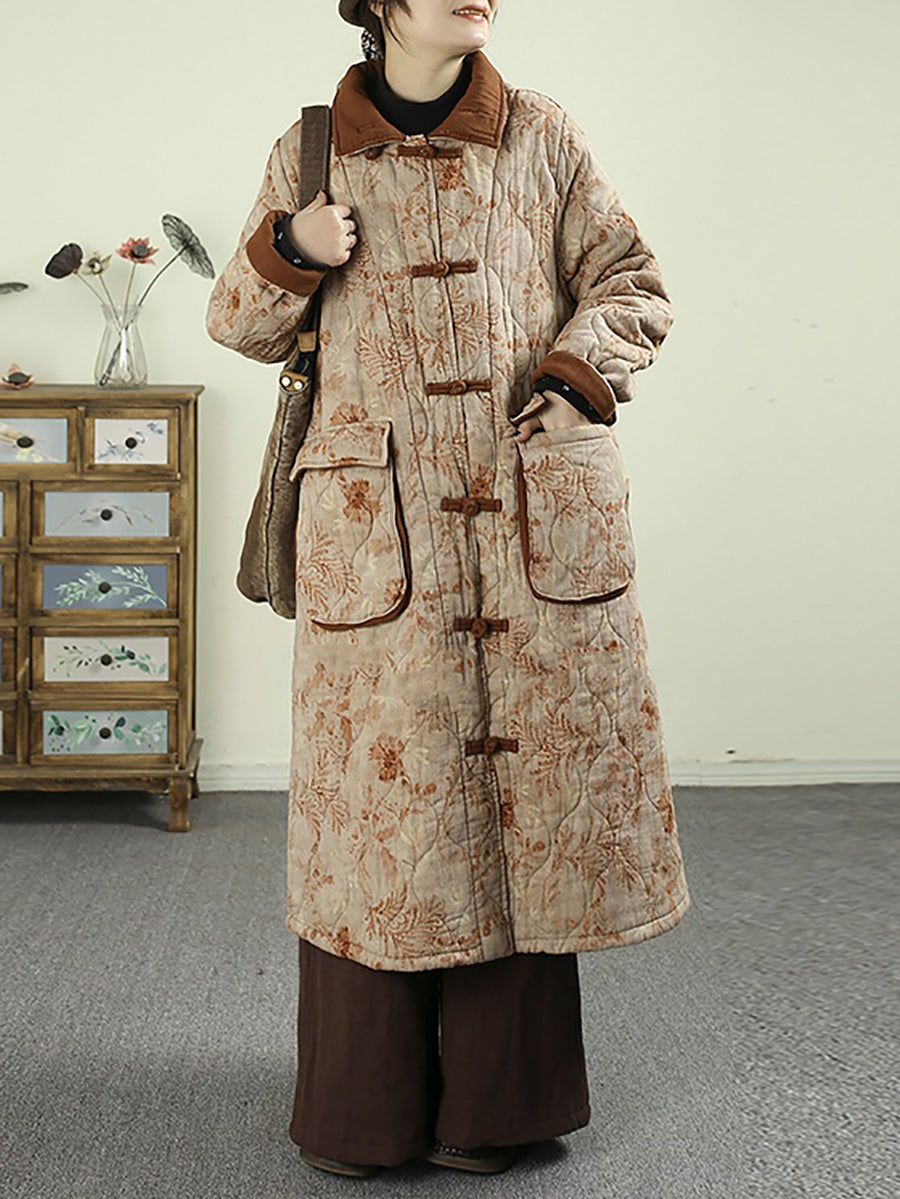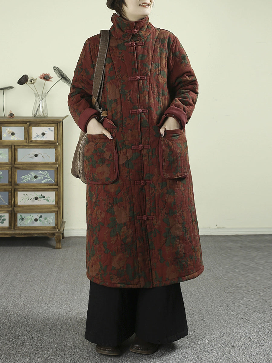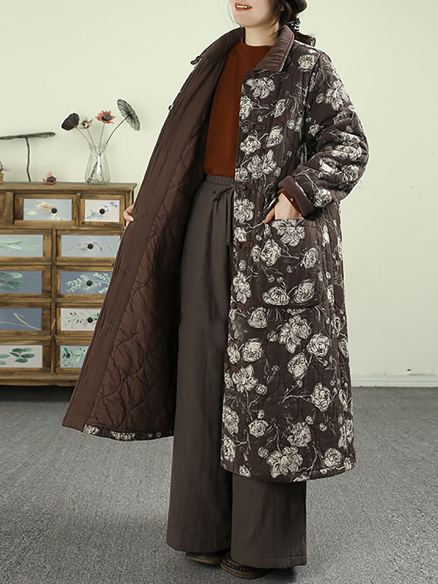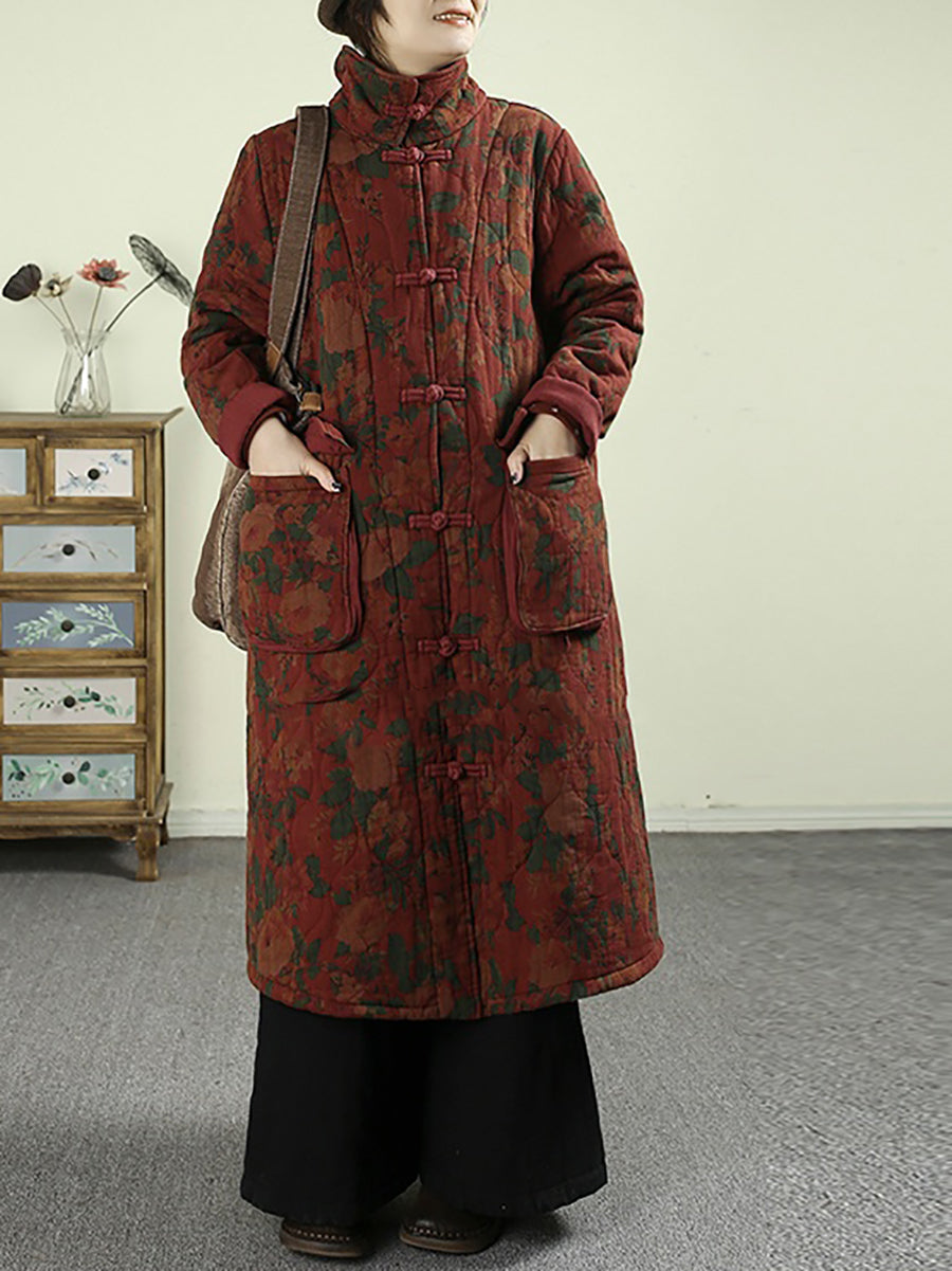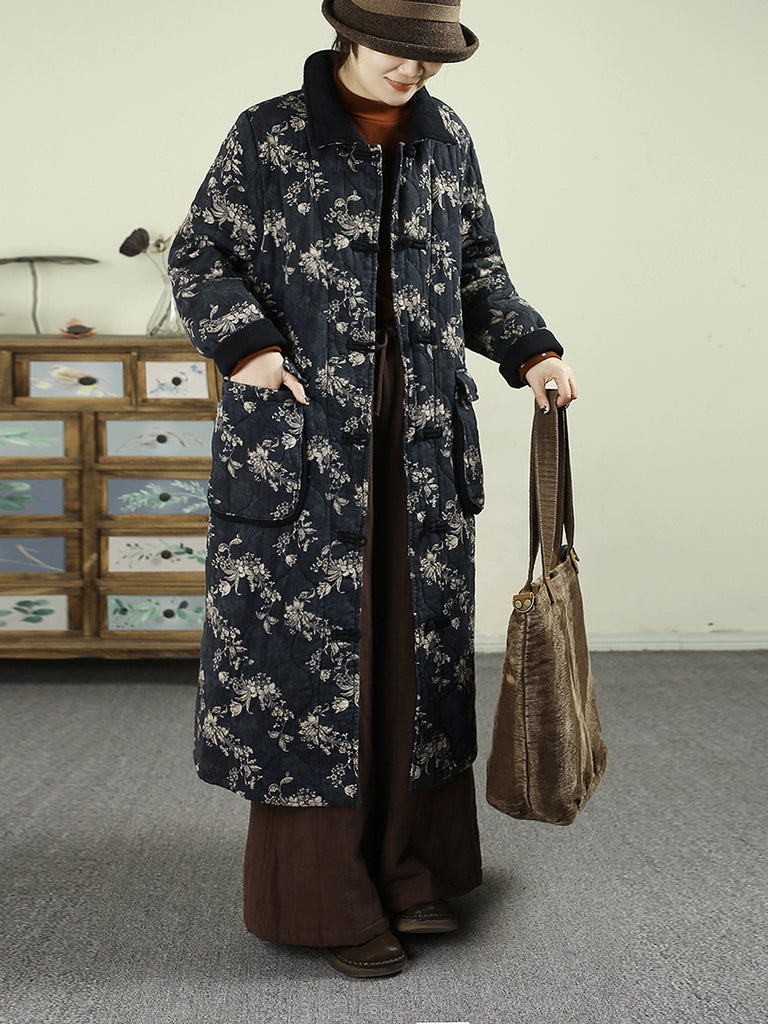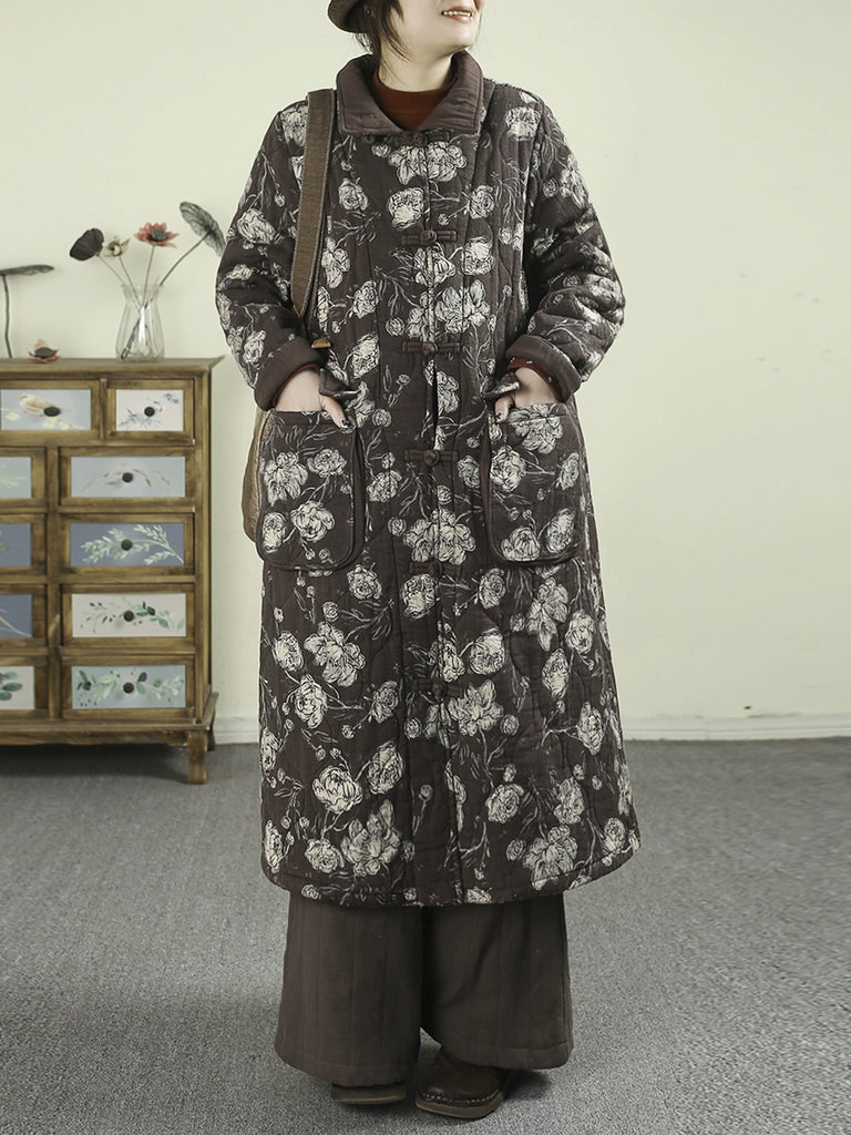 מעיל חורף רטרו פרחוני מרופד עם צווארון מתקפל