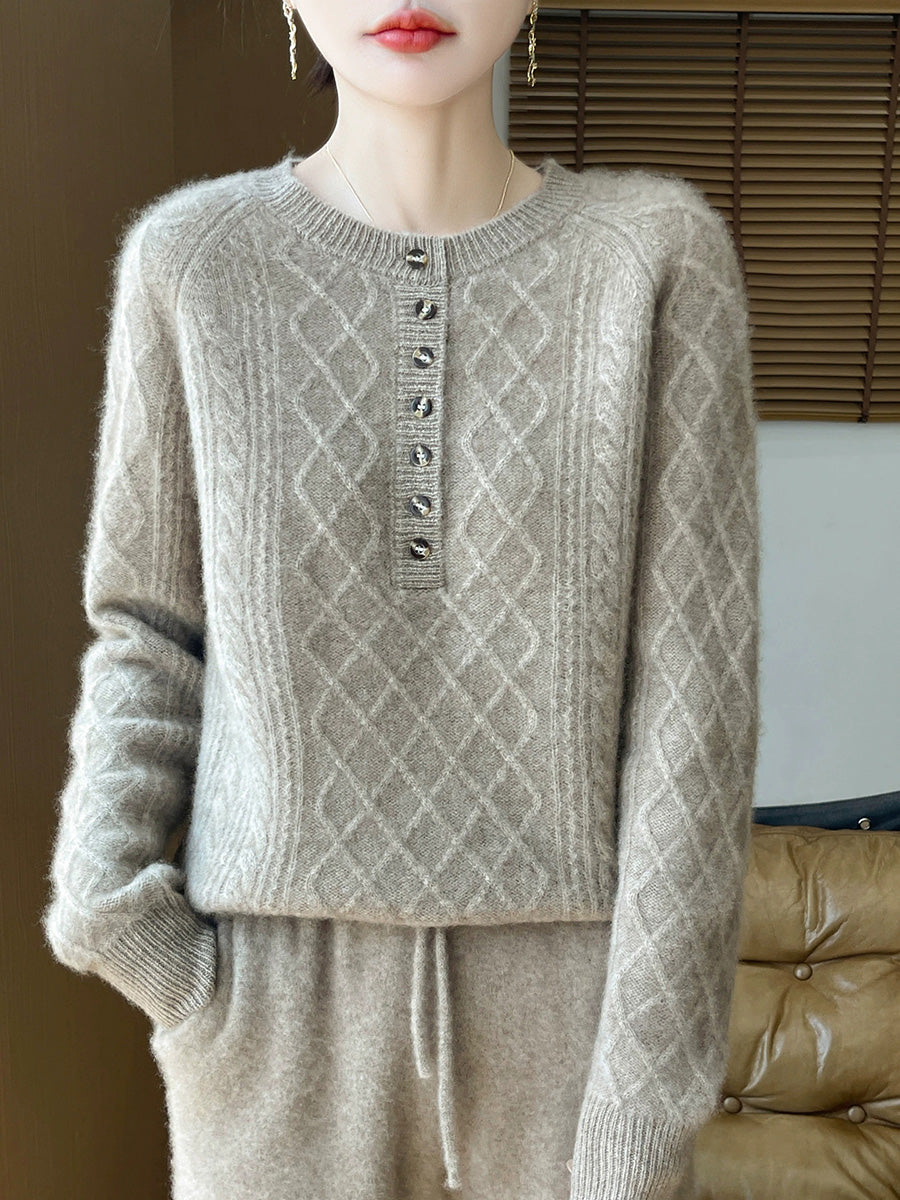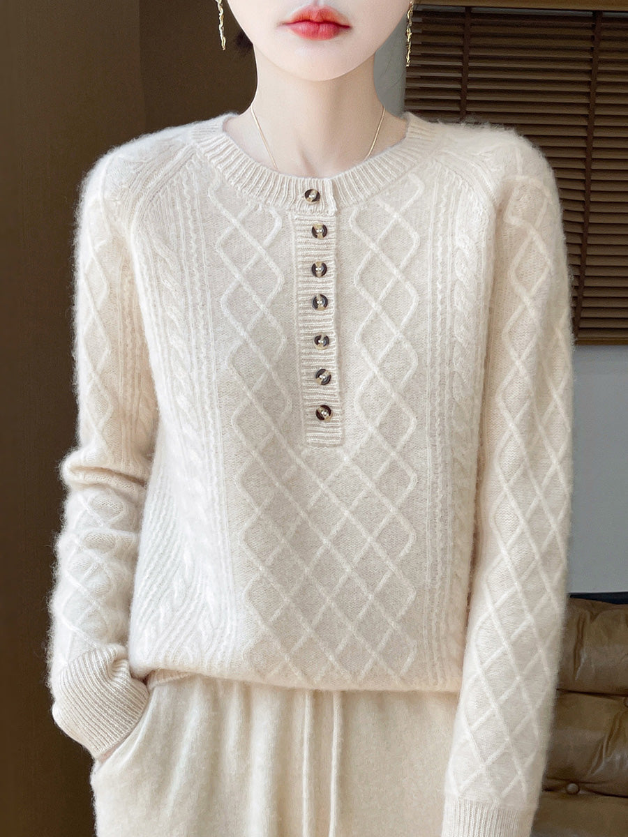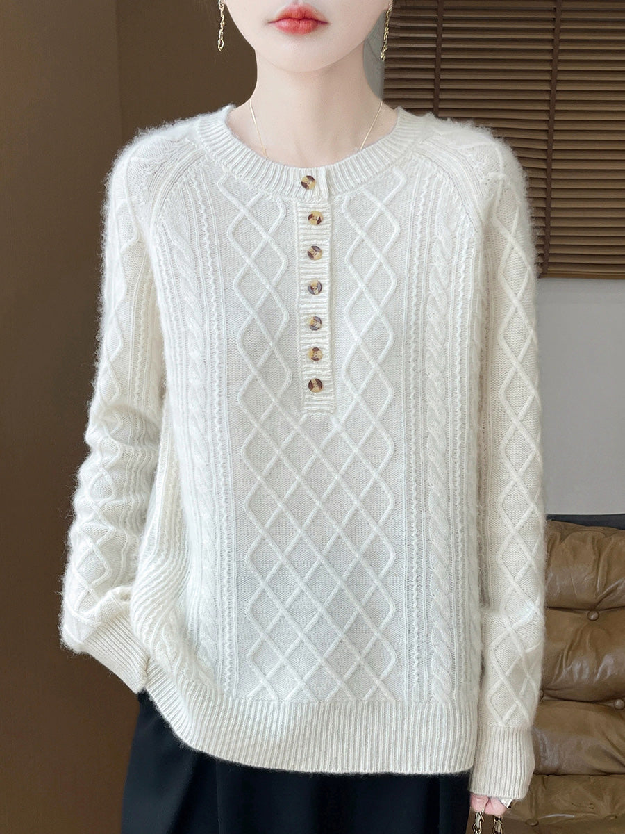 סוודר צמר סרוג עם צווארון O וצווארון, צווארון O, בסגנון אומנותי לנשים, סתיו