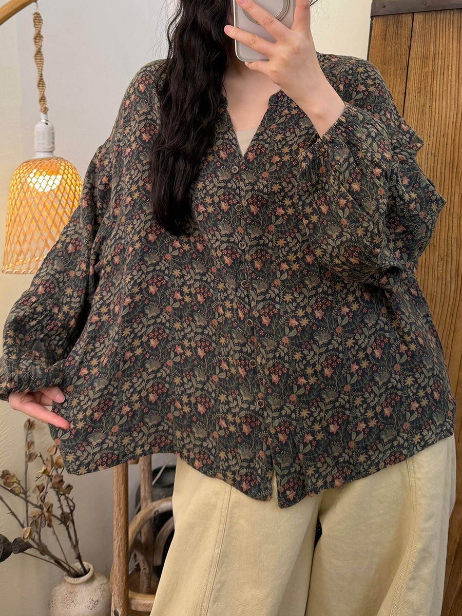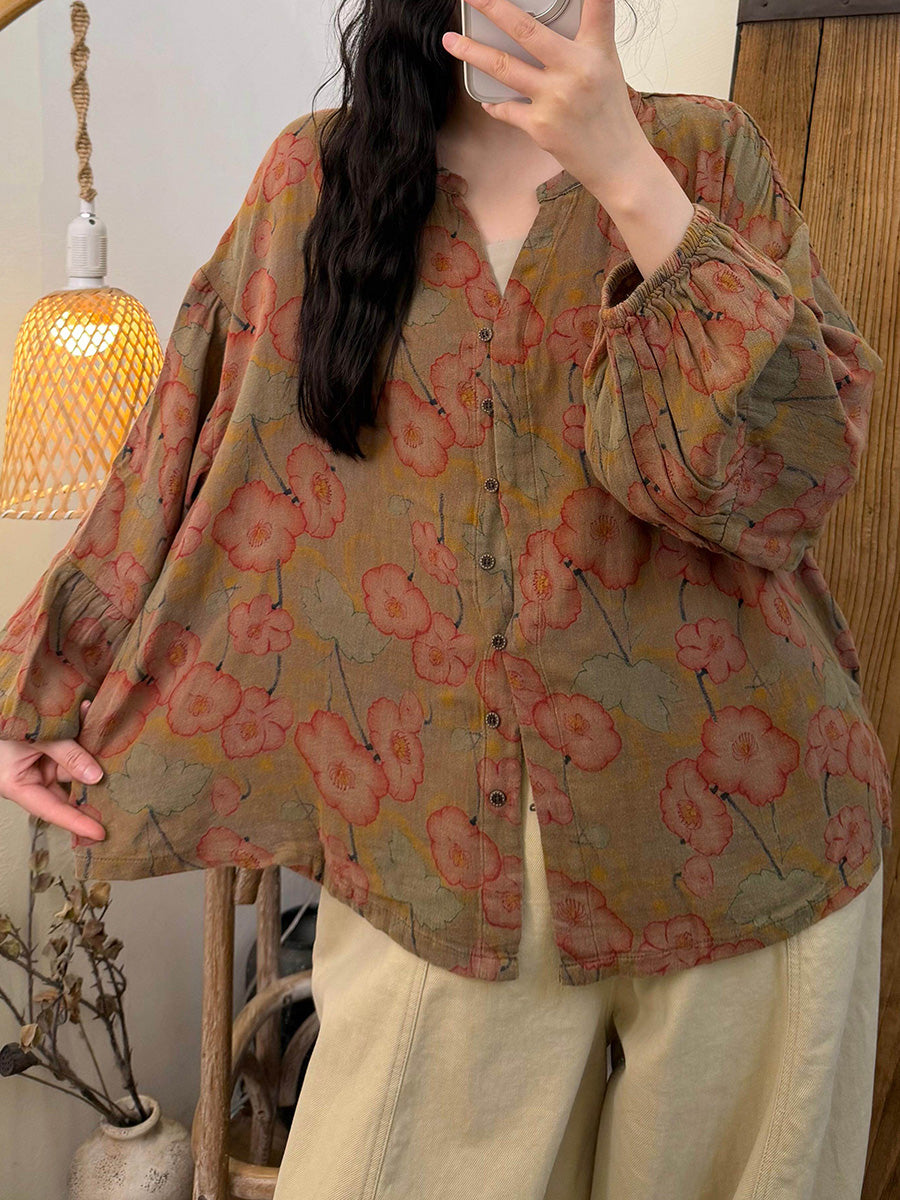 חולצת כותנה עם צווארון V פרחוני ואמנותי לנשים באביב