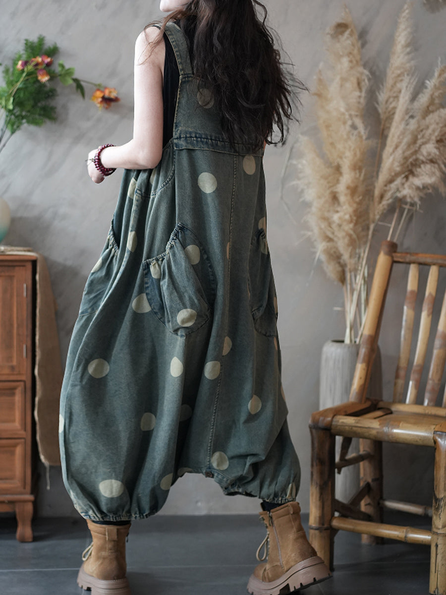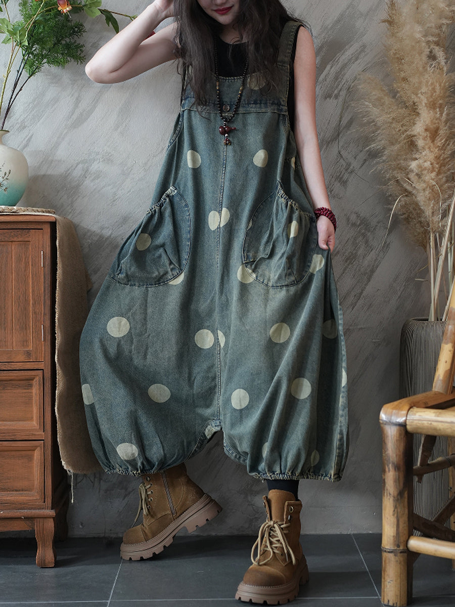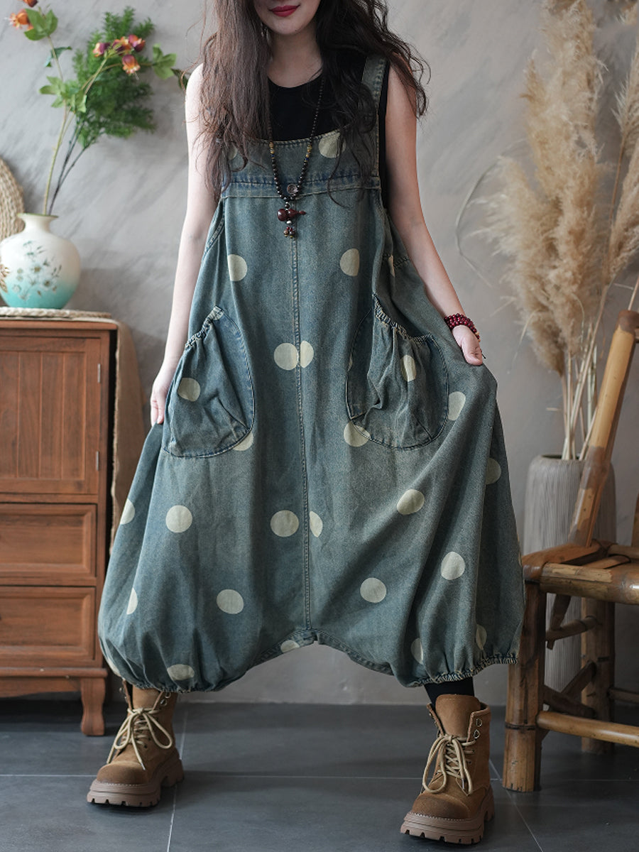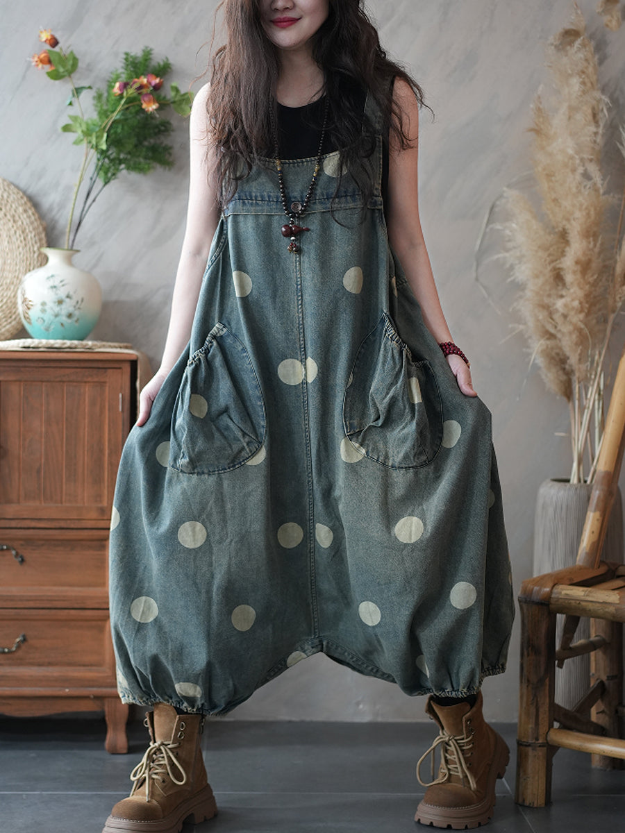 Ženski ležeran traper kombinezon s točkama i niskim međunožjem