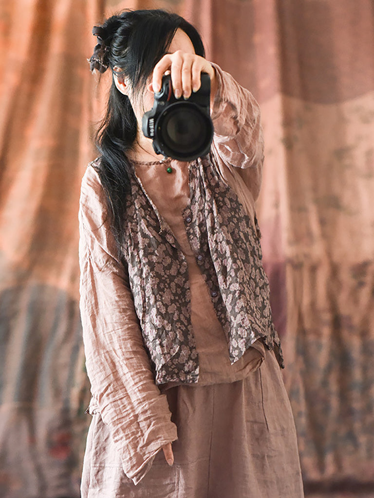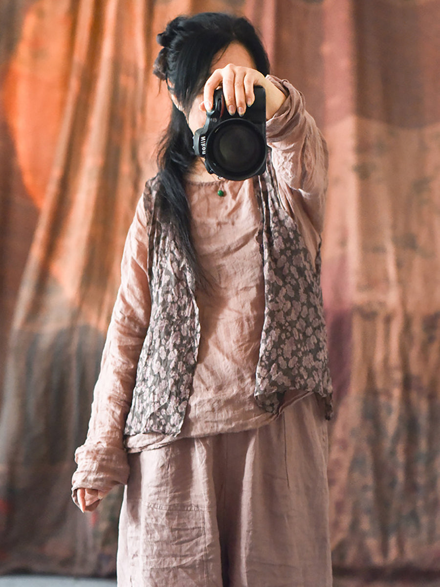 Izrađen u potpunosti od 100% ramija, ovaj prsluk bez rukava ima šarmantan cvjetni uzorak i klasični ovratnik s V-izrezom. S vintage stilom savršenim za proljetne i ljetne sezone, ovaj prsluk je nezaobilazan dio svake modno napredne garderobe.