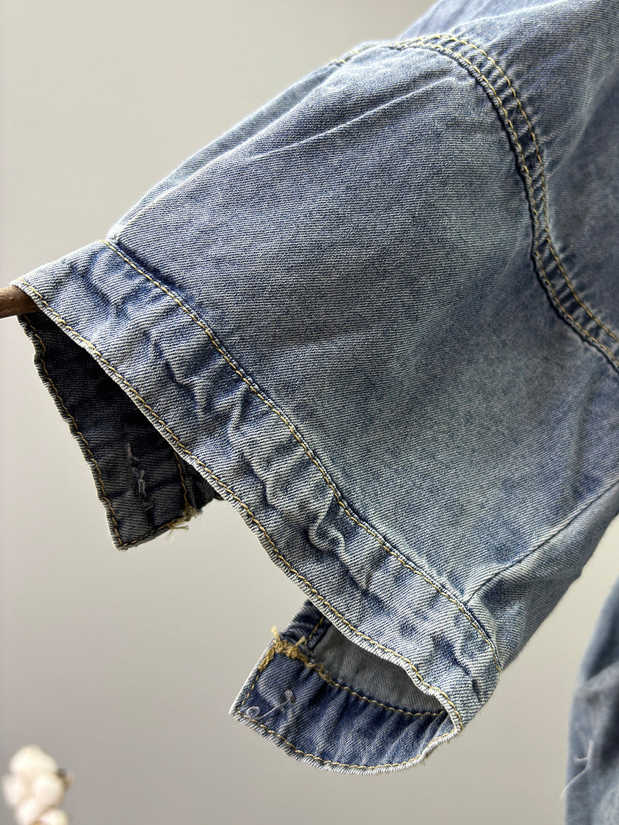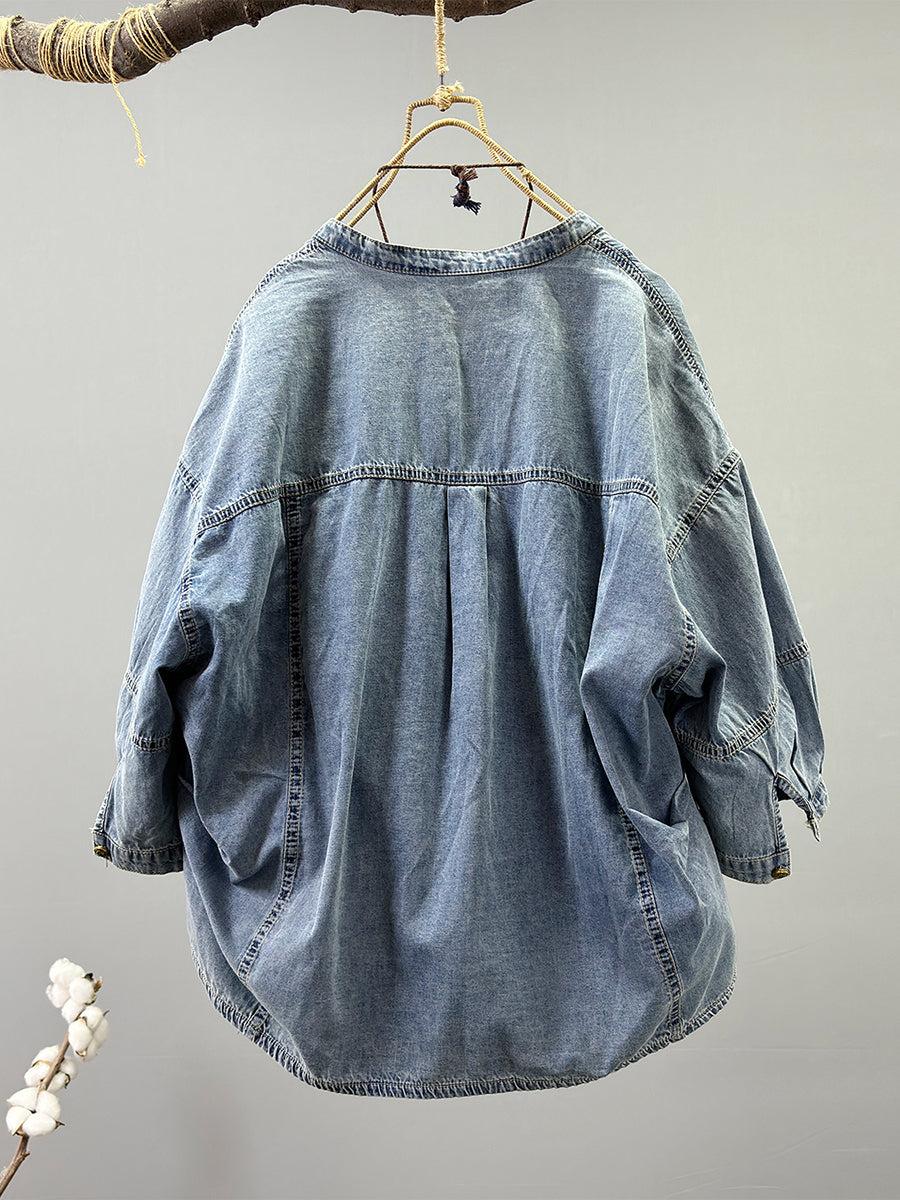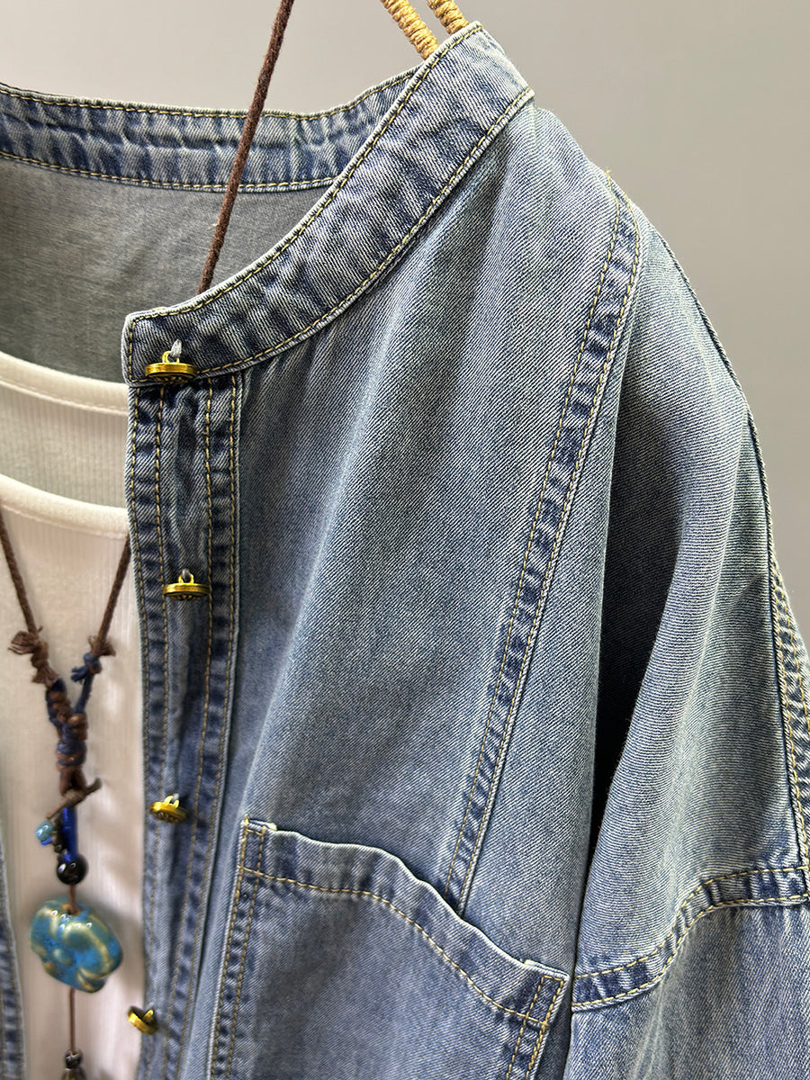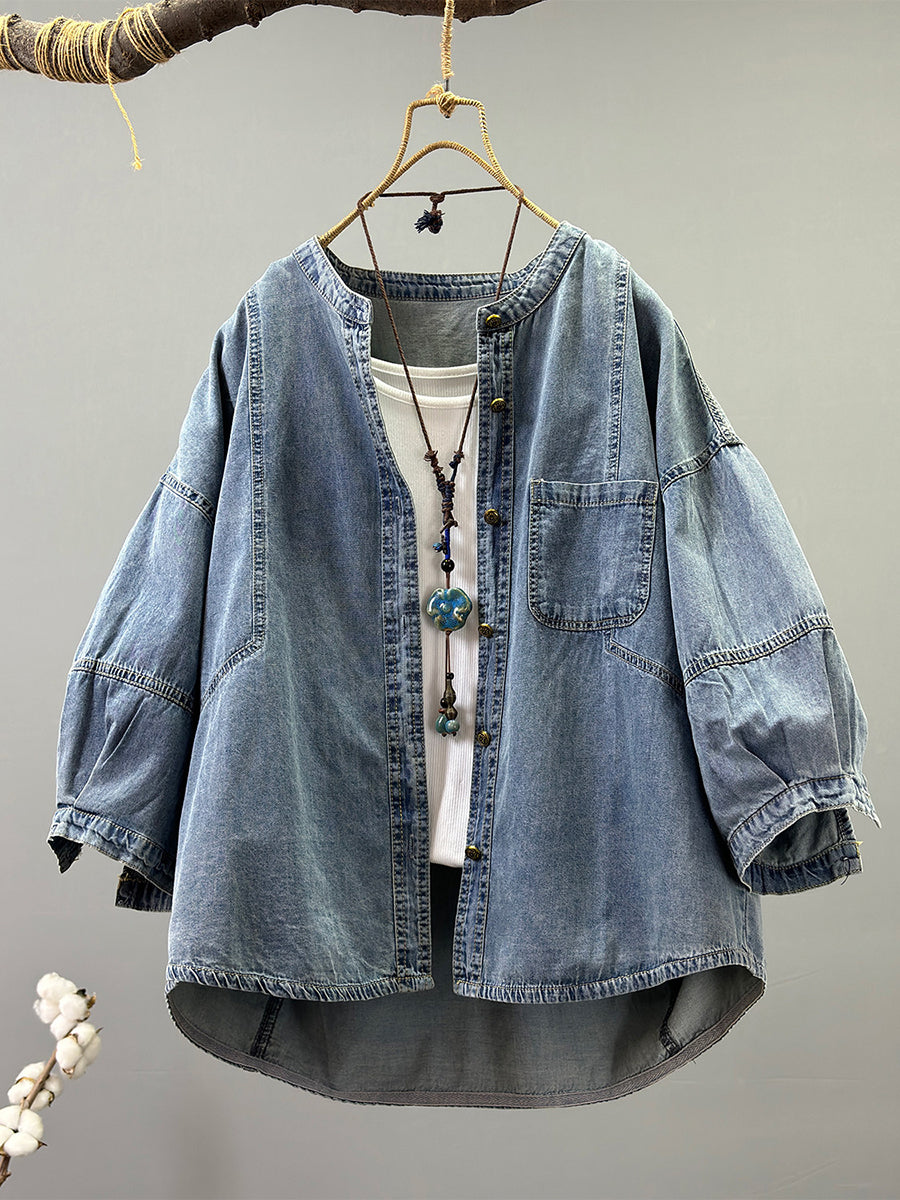 Ženska proljetna retro traper jakna čiste boje s O-izrezom