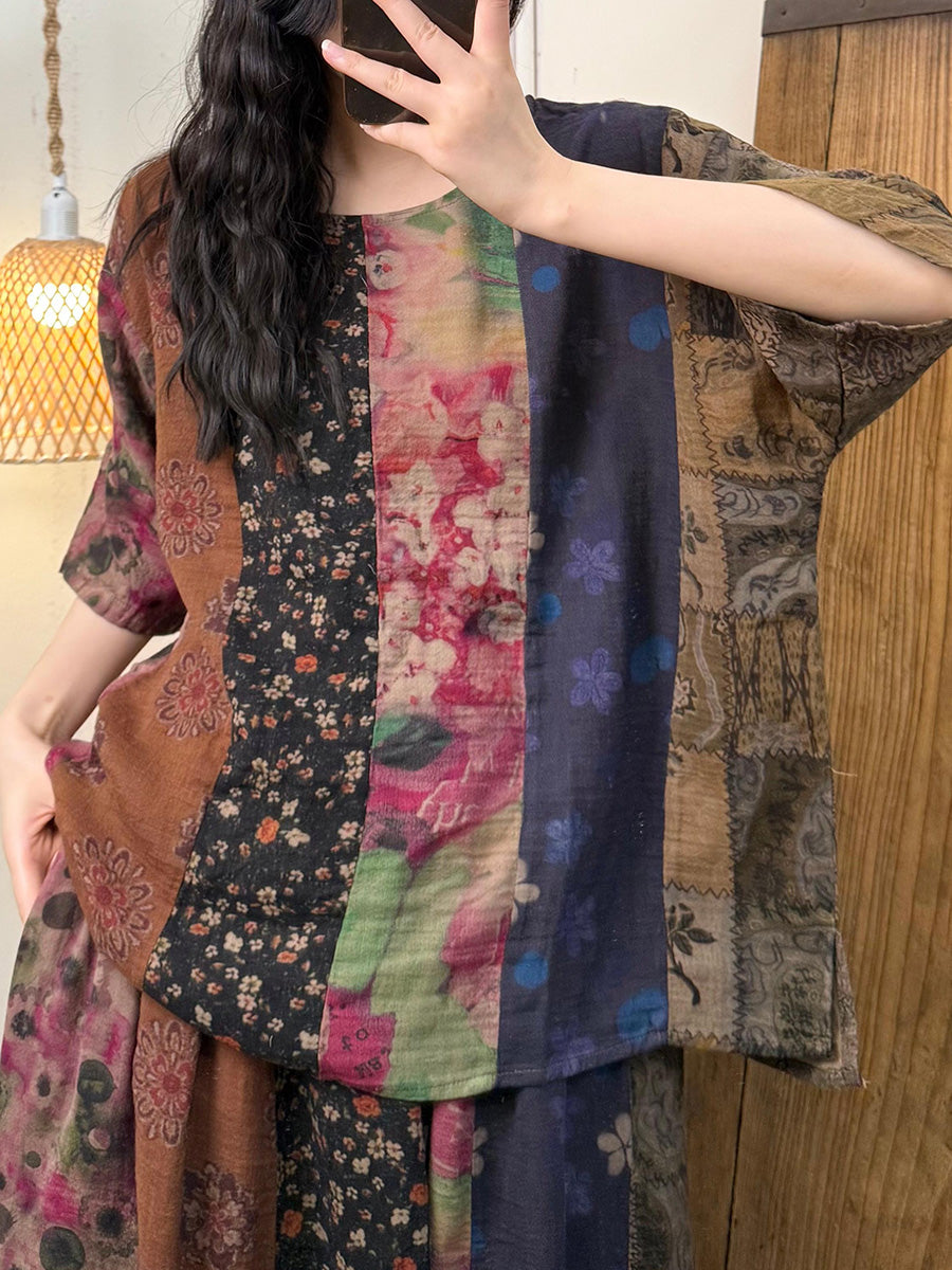 Női nyári, művészi, virágmintás, O-nyakú pamuting