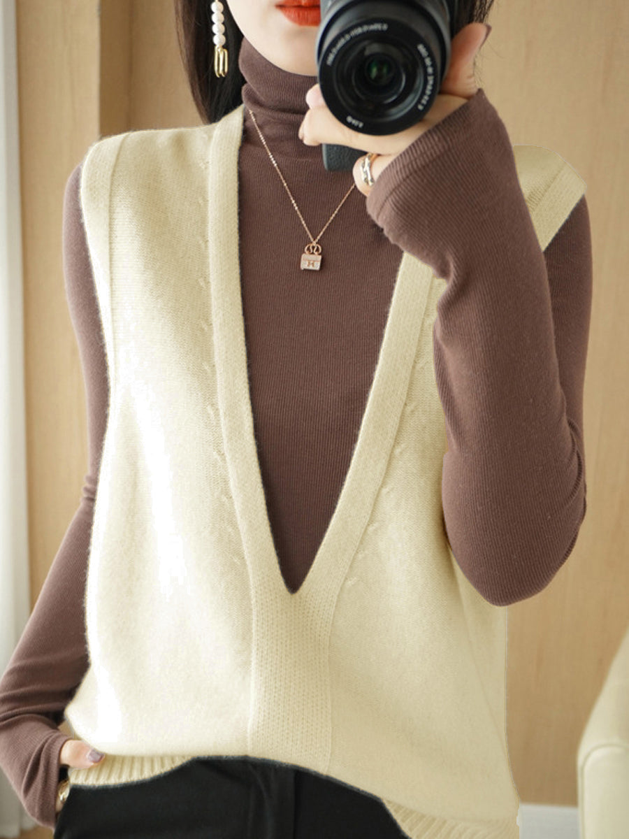 Női őszi lezser tiszta színű V-nyakú kötött mellény
