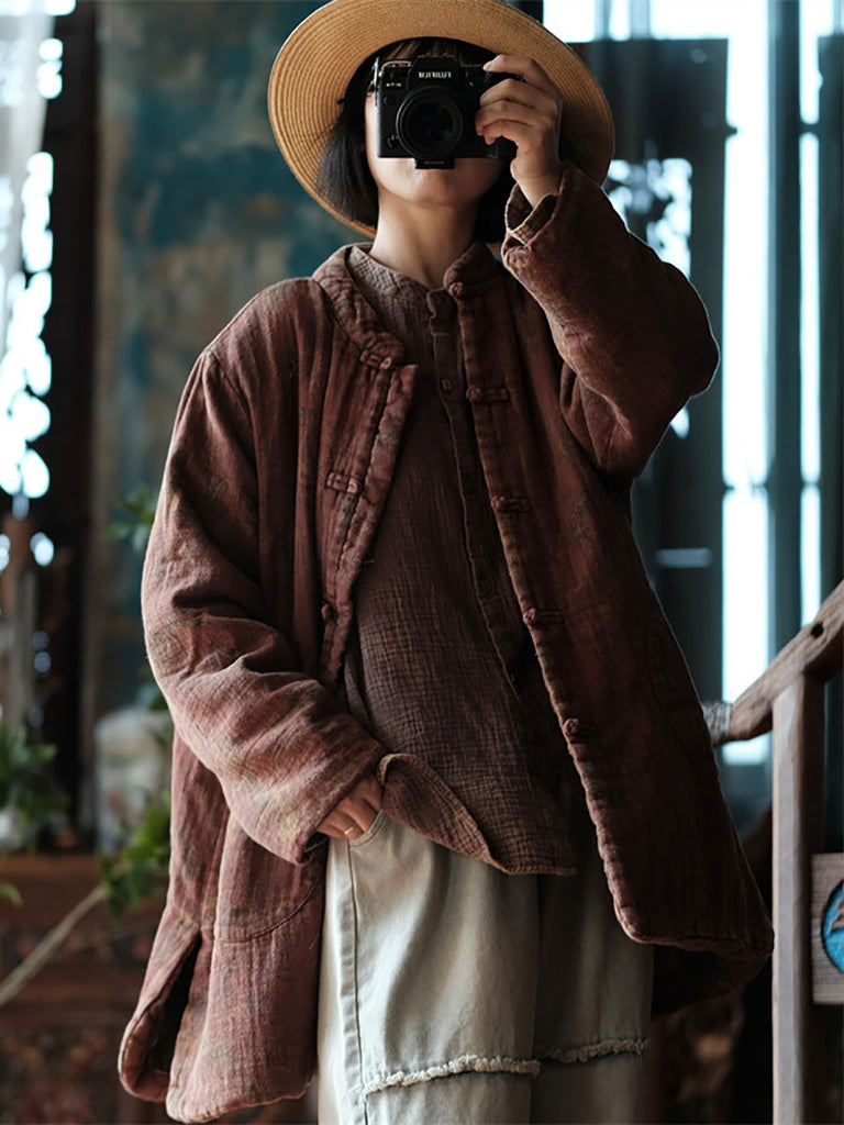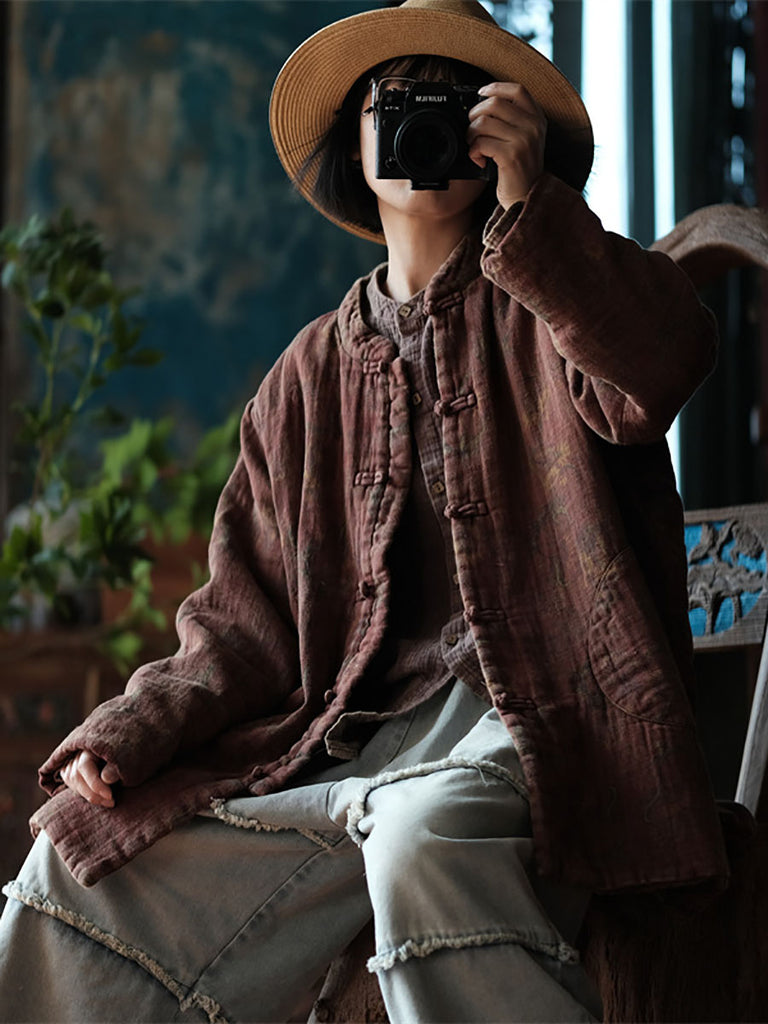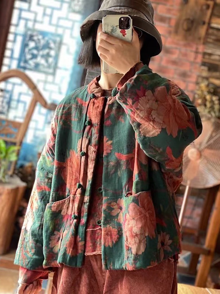 Női őszi etnikai virágos gombos pamutkabát