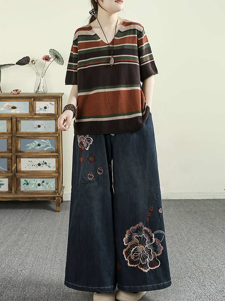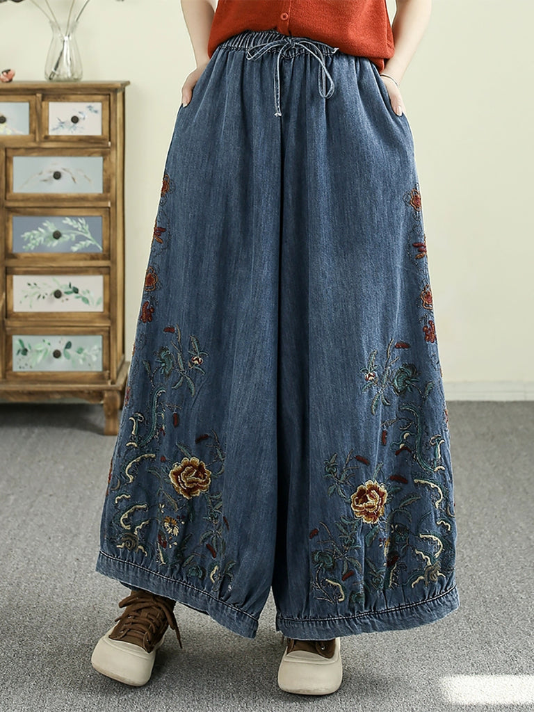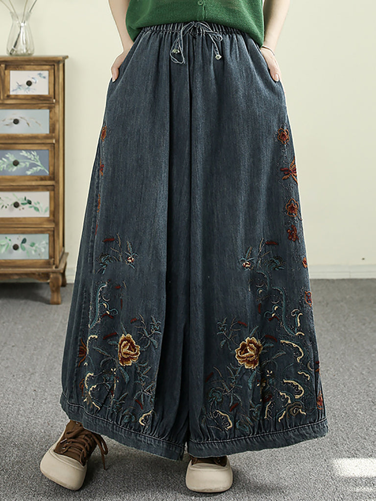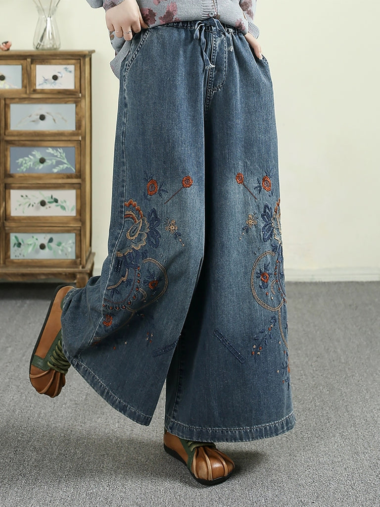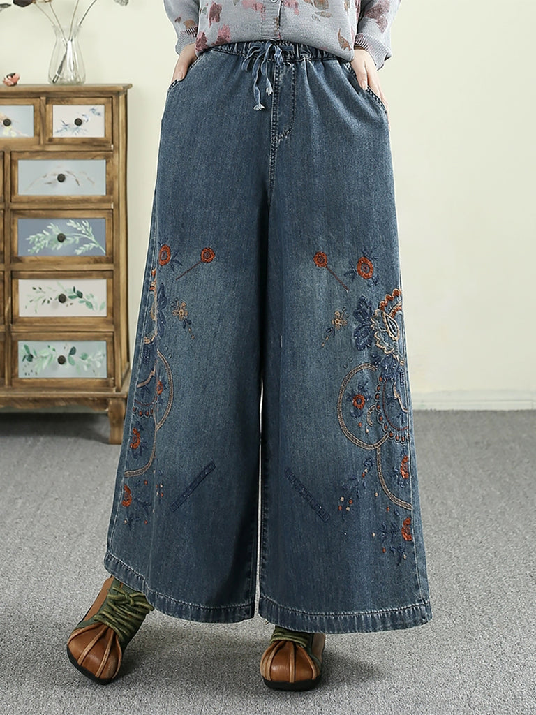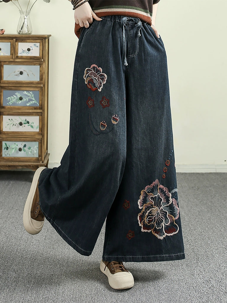 Női tavaszi virág hímzés farmer széles szárú nadrág