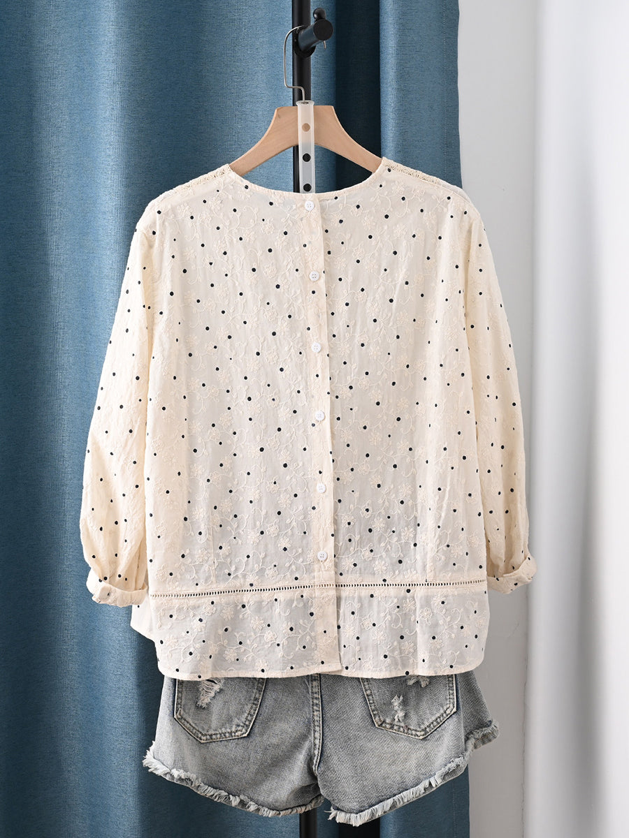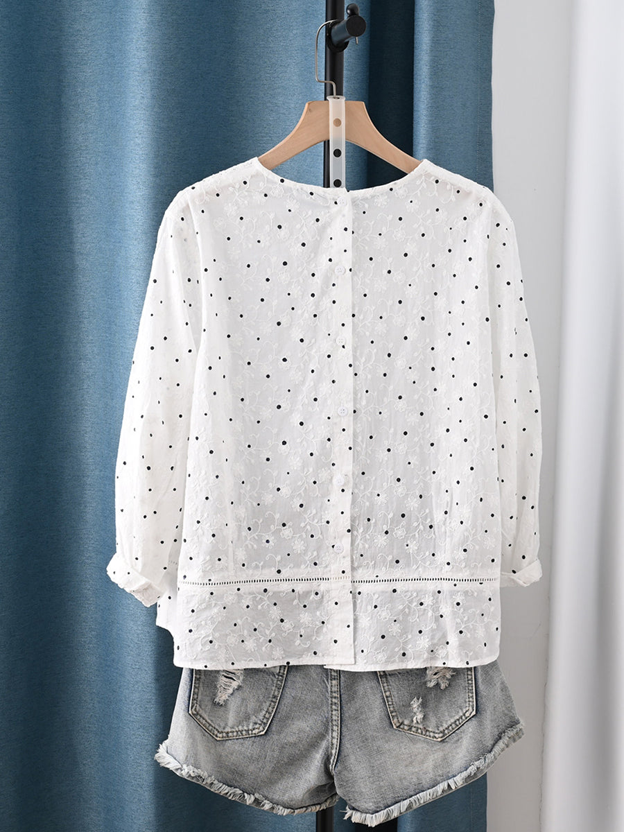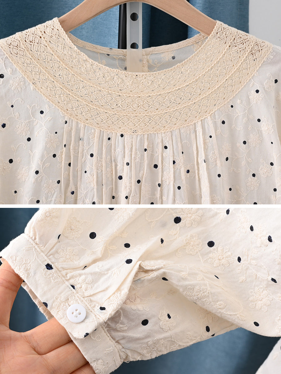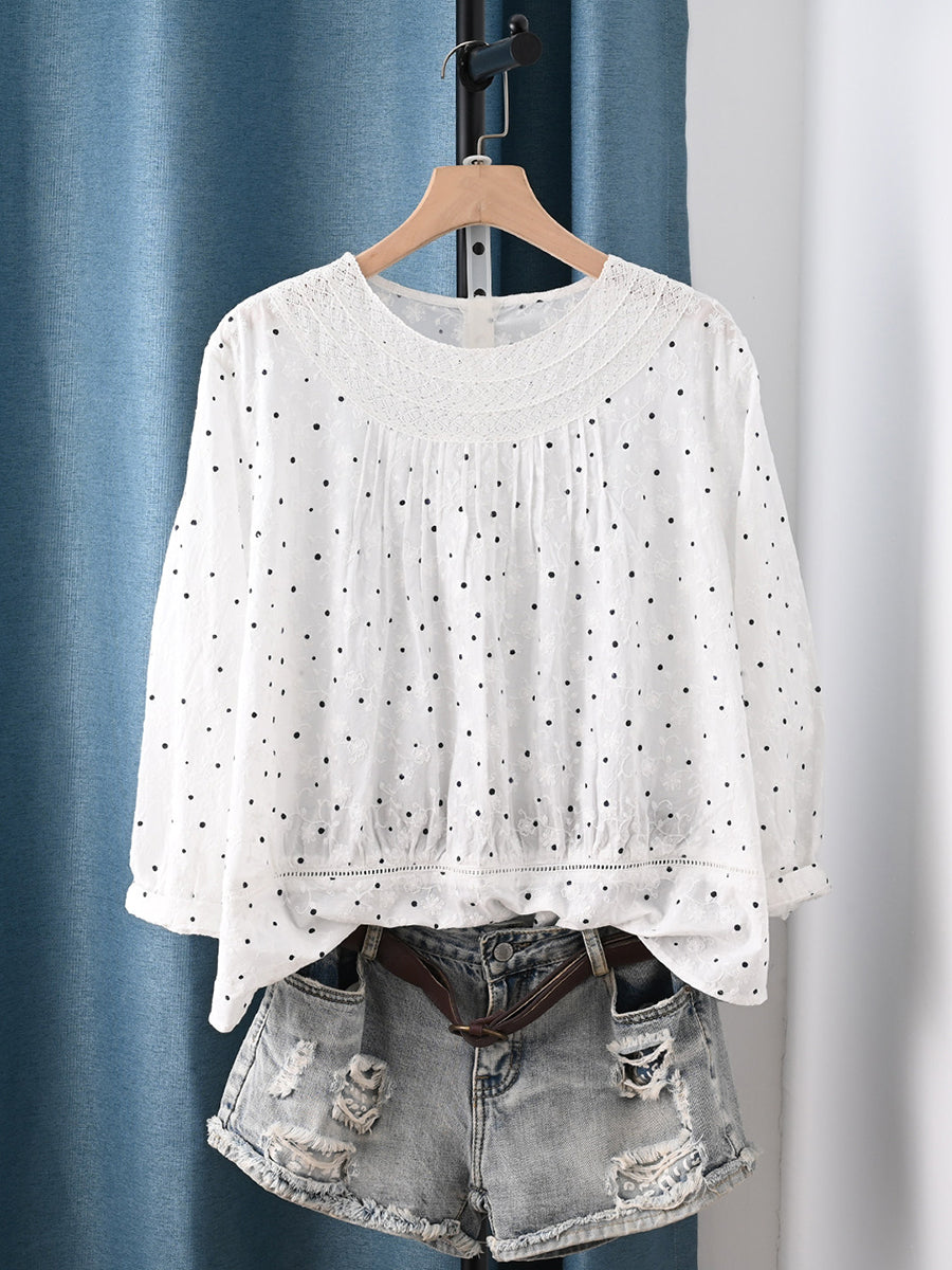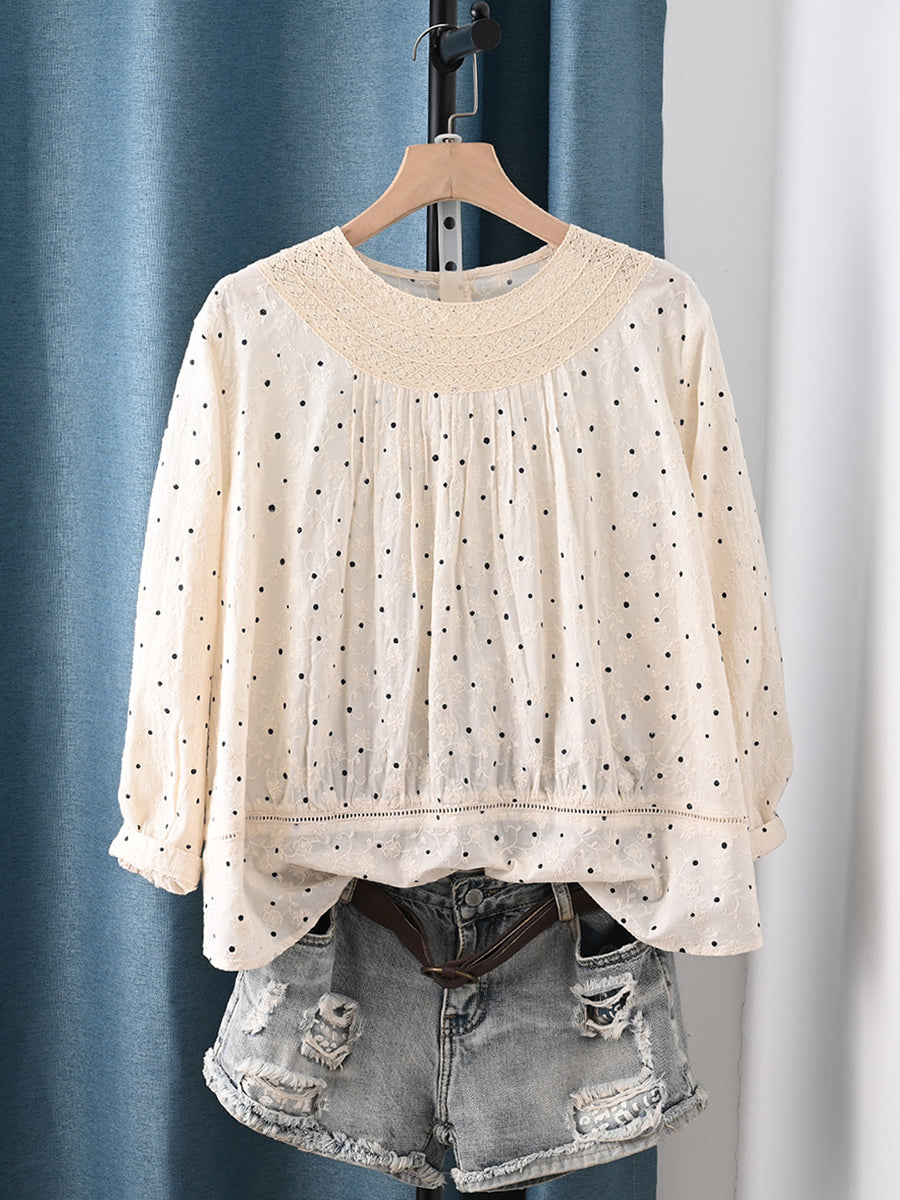 Női művészi tavaszi pöttyös hímzett csipke 100% pamut blúz