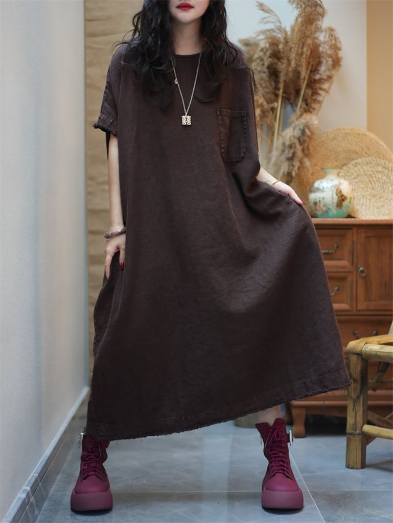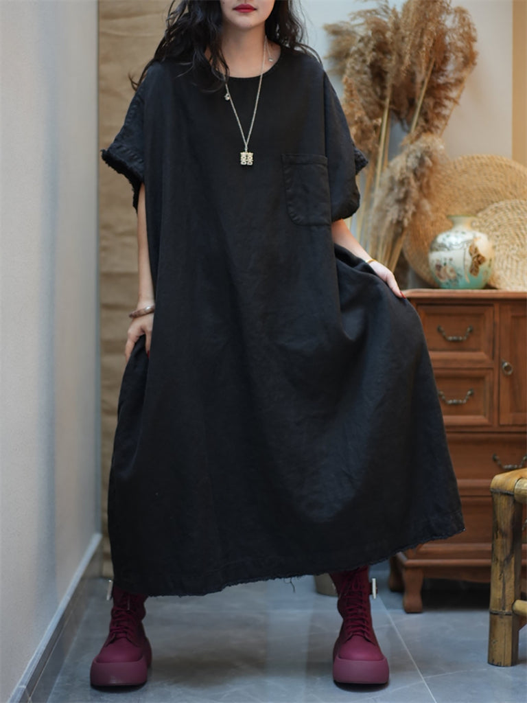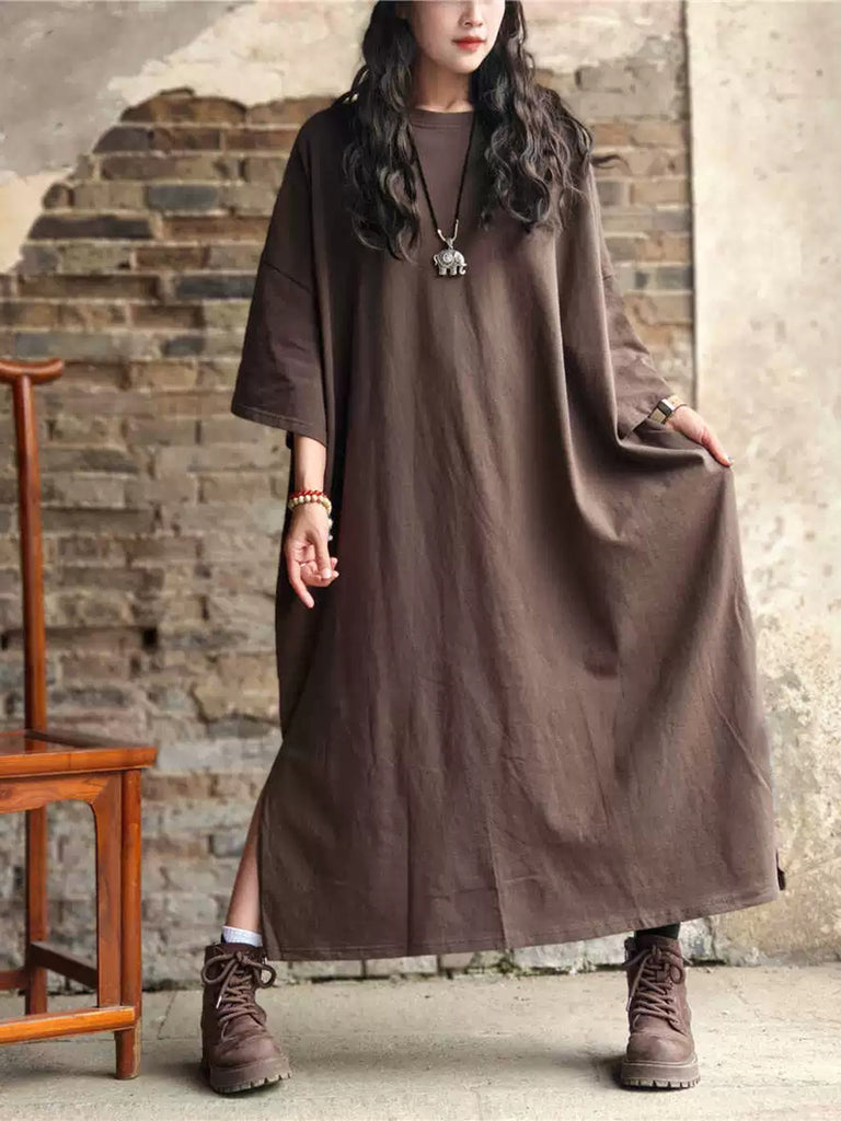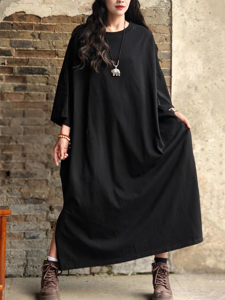 Ez a ruha pamutszövetből készült, egyszínű mintával, O-nyakú gallérral, raglán stílusú, teljes ujjúval és vádliig érő kialakítással. Művészi stílusa tökéletes az őszi és tavaszi szezonra.