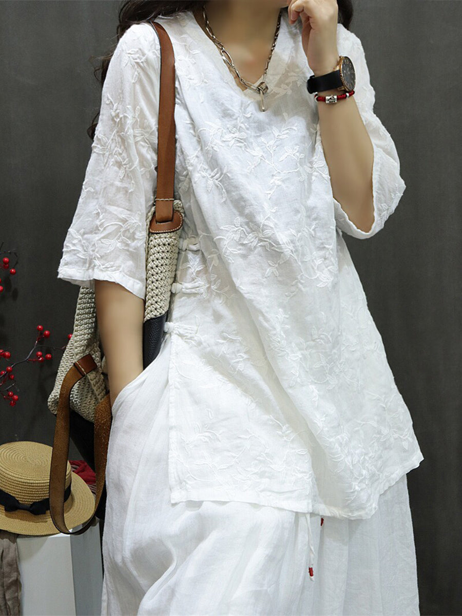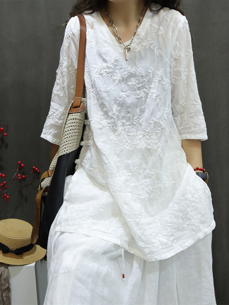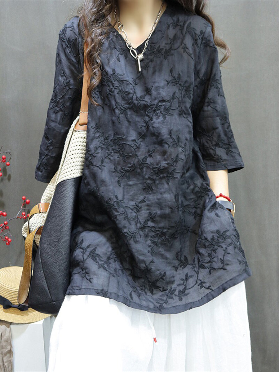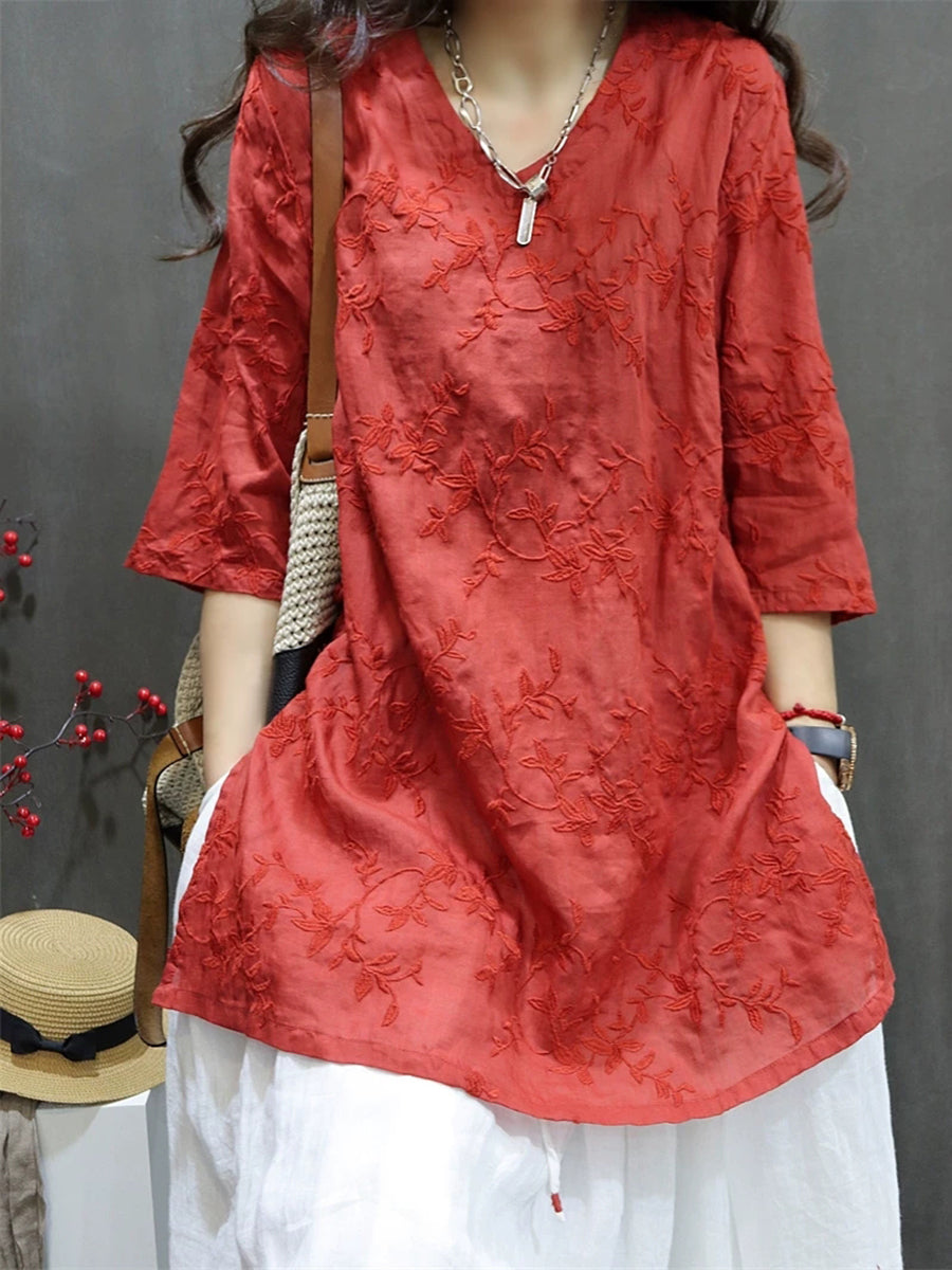 Női Nyári Művészi Hímzésű 100% Rami V-nyakú Blúz
