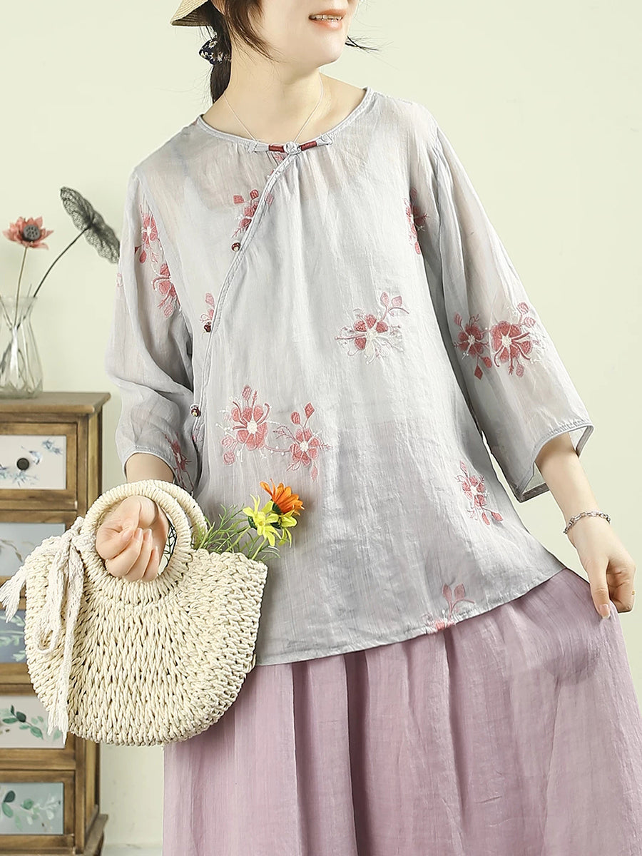 Női Nyári Művészi O-nyakú Hímzéses 100% Rami Blúz