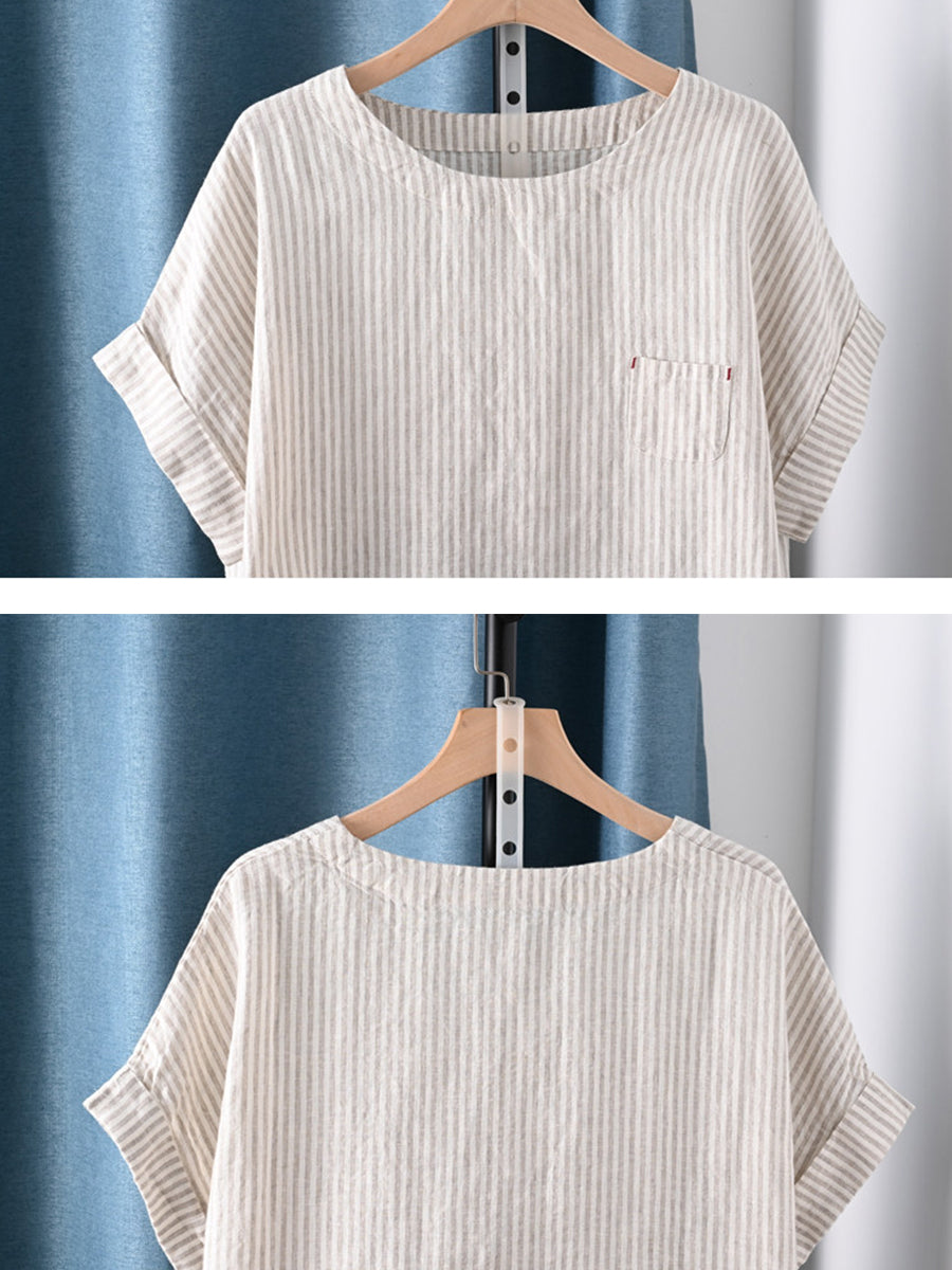 Női Nyári Művészi Csíkos O-nyakú 100% Pamut Blúz