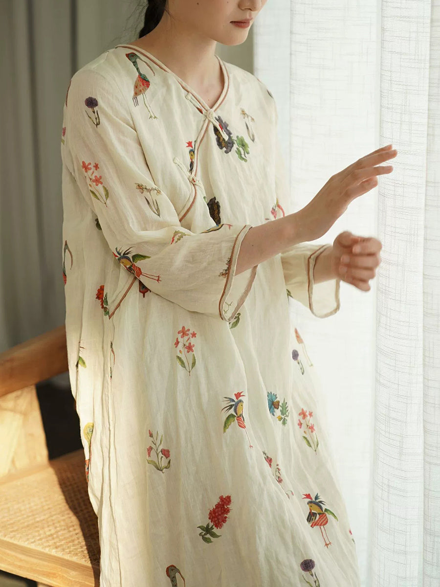 Női nyári vintage mintás, 100% rami V-nyakú ruha