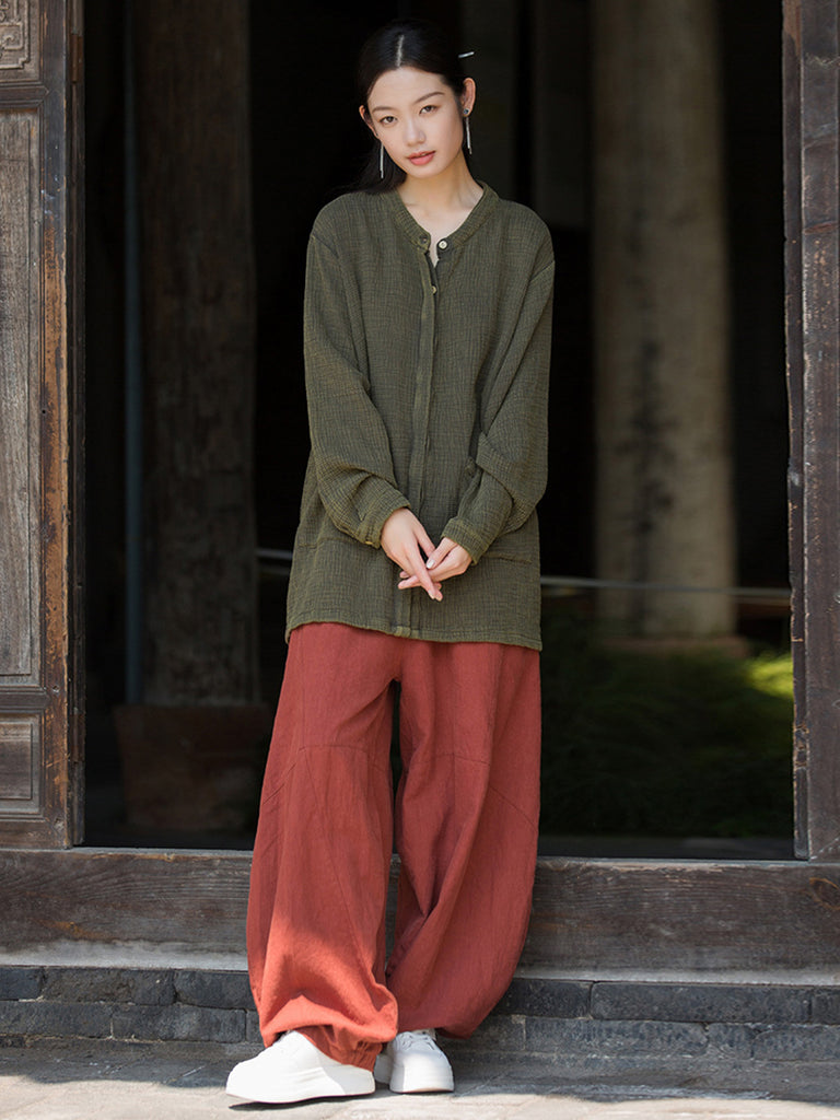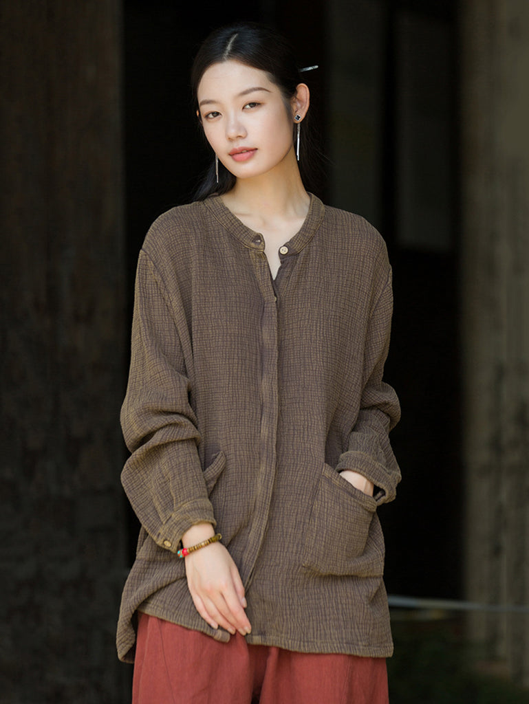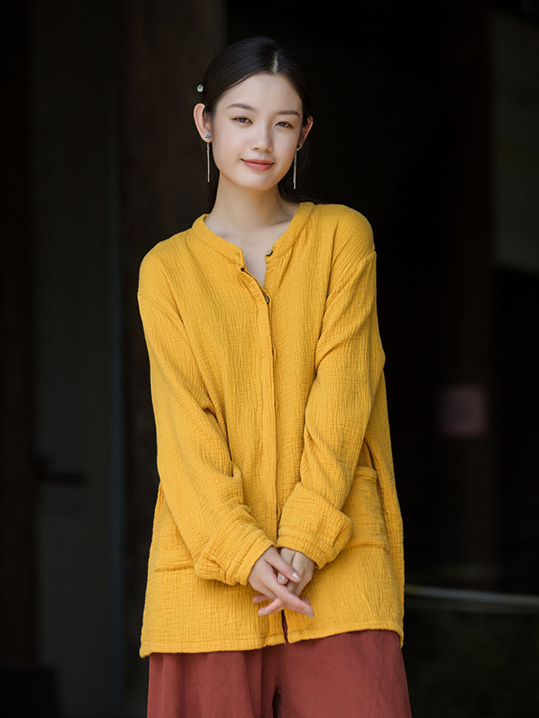 Ez az ing ramiból készült, tömör mintával, lehajtható gallérral és telt, szabályos ujjakkal. Művészi stílusának köszönhetően tökéletes viselet a tavaszi és őszi szezonban.