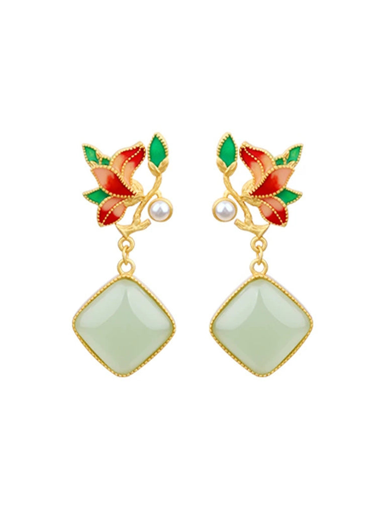 Női Vintage Virágos Zománc S925 Ezüst Jade Fülbevaló