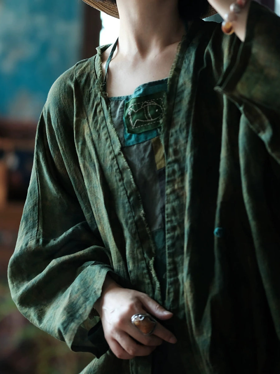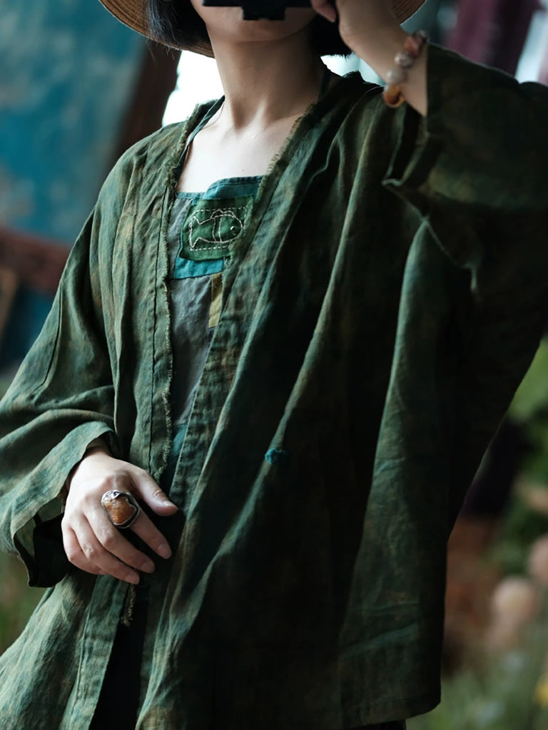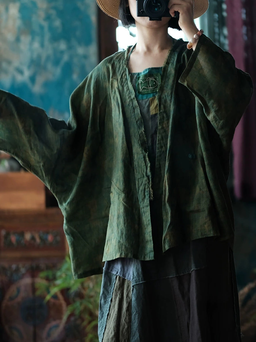 Sumar Retro Tie-dye Linen V-háls skyrtufrakki fyrir konur