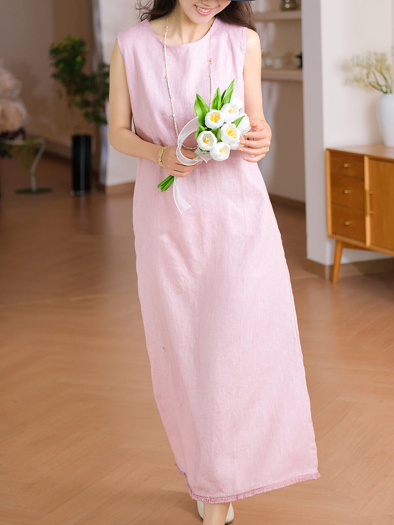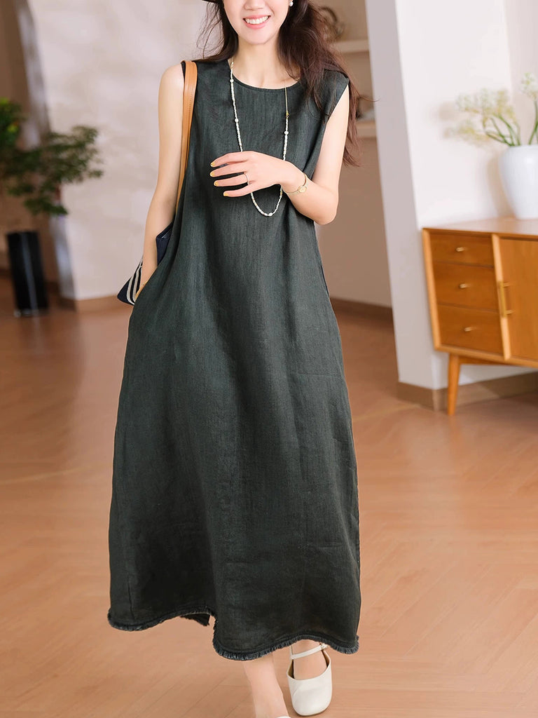 Sumar frjálslegur kjóll fyrir konur með hreinum lit og O-hálsmáli, 100% hör