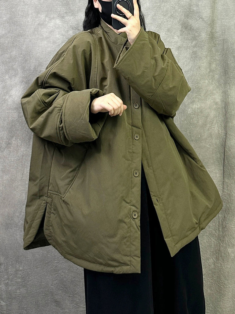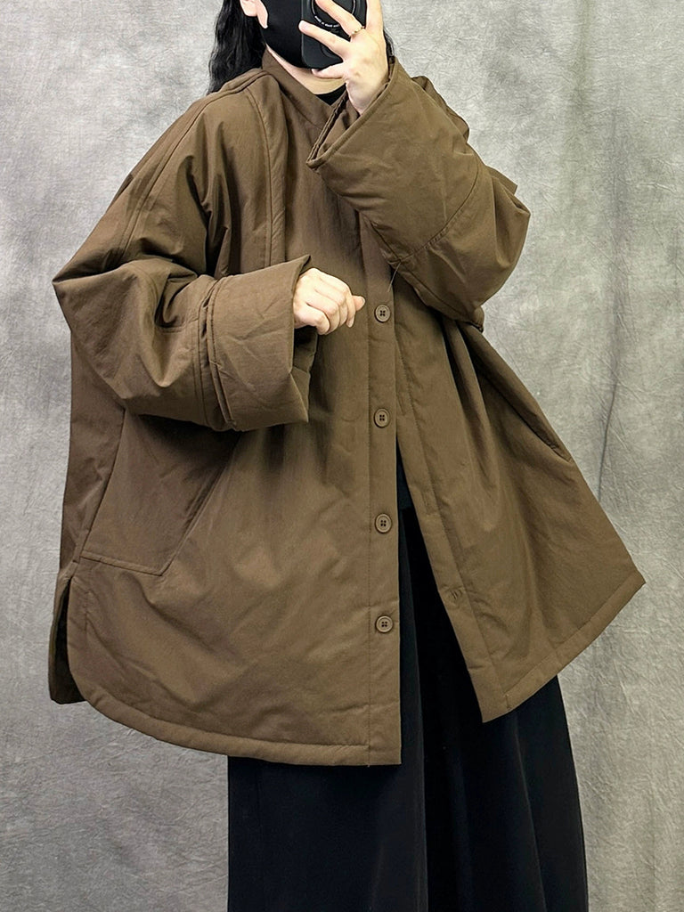 Vetrarfrakki úr flís úr vintage-efni með O-hálsmáli úr bómullarefni fyrir konur
