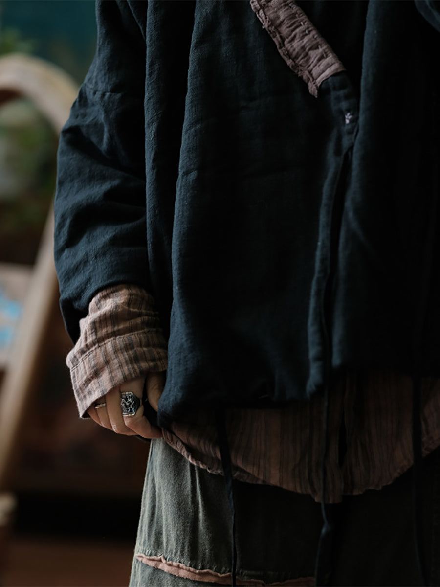 Þetta stykki er úr hör með traustu mynstri og v-hálskraga. Með fullum laskalínu ermum í þjóðernislegum stíl er hann fullkominn fyrir haust- og vetrartímabilið.
