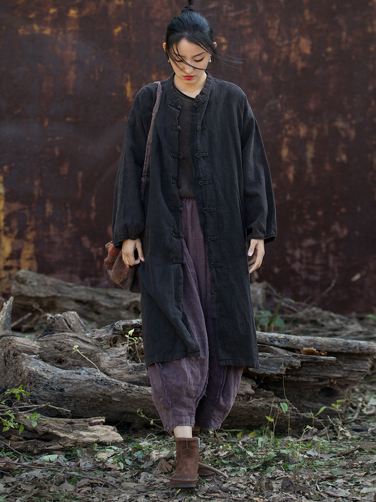 Þessi langa skyrtufrakki gefur flíkinni vintage tilfinningu. Alhliða liturinn og standkraginn bæta við tímalausu aðdráttaraflið, en laskalínuermarnar passa vel. Fullkomið fyrir vorið og sumarið.