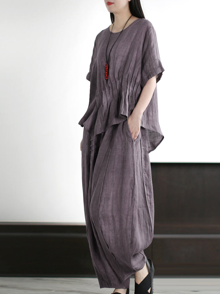 Plus Stærð Kvenna Vintage Solid Len Cotton Skyrta+Buxur