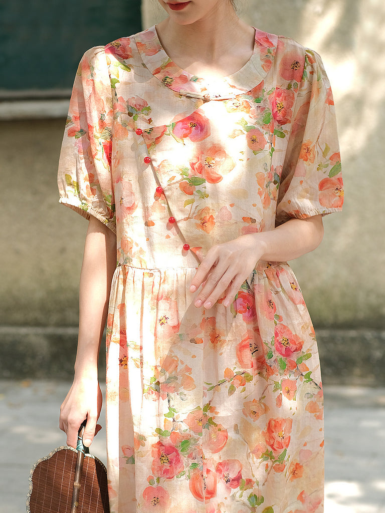 Plus Stærð Kvenna Vintage Summer Floral Button Laus Ramie Dress