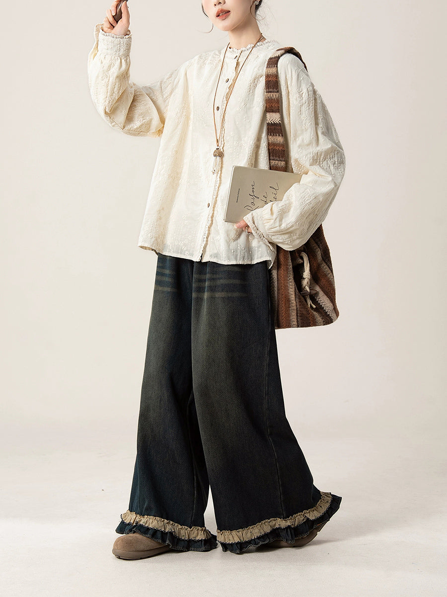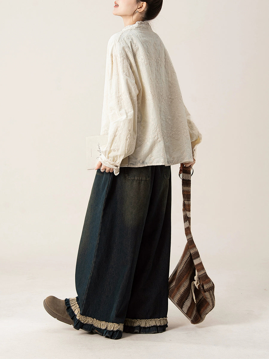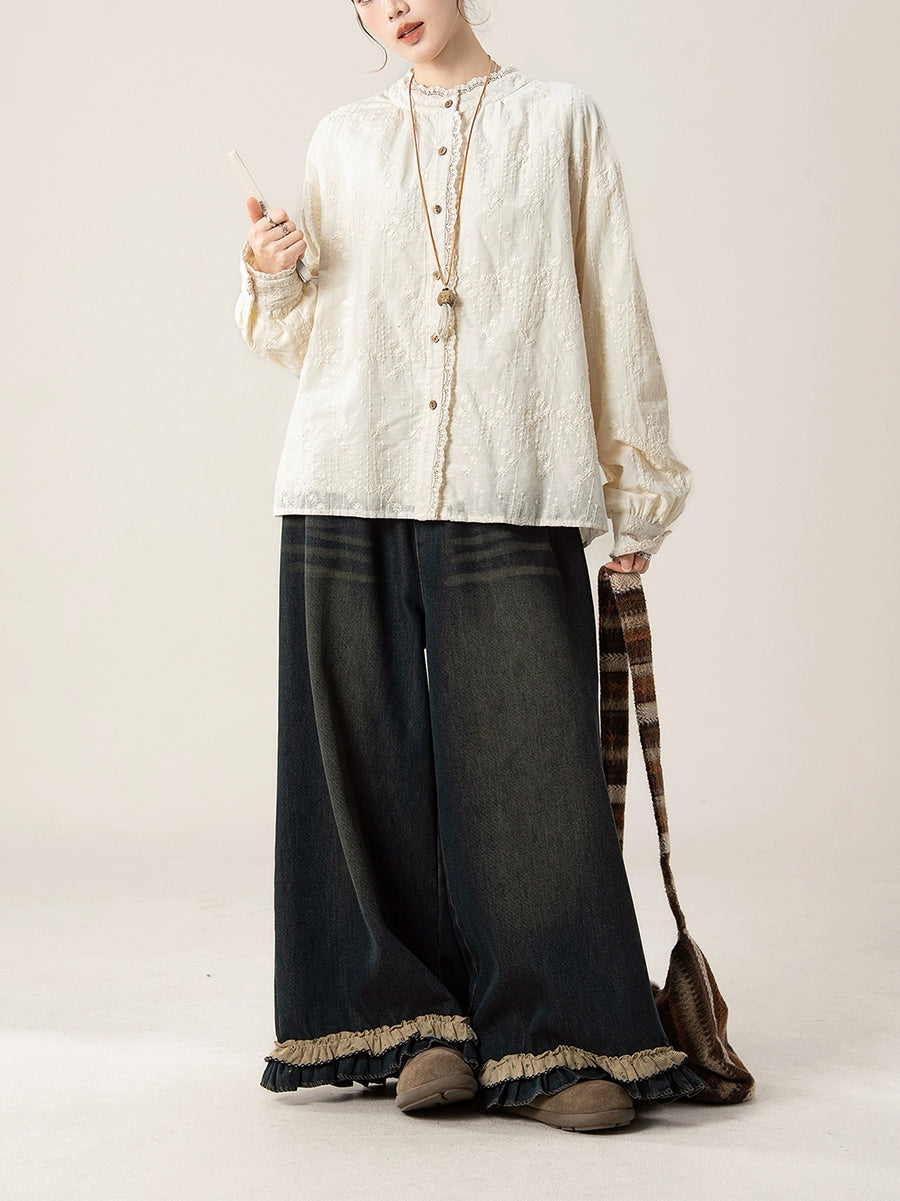 Listræn haustskyrta með útsaumi úr blúndukraga fyrir konur