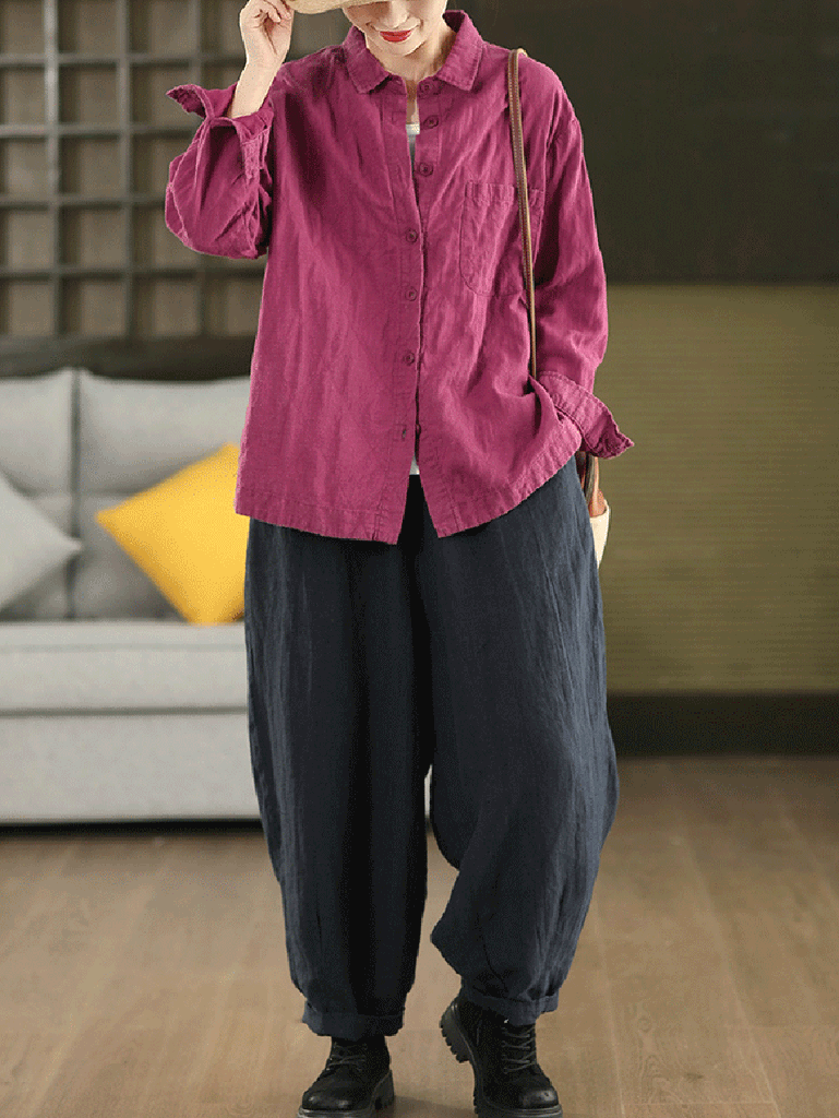 Haustskyrta fyrir konur, 100% hör, með niðurfelldum kraga