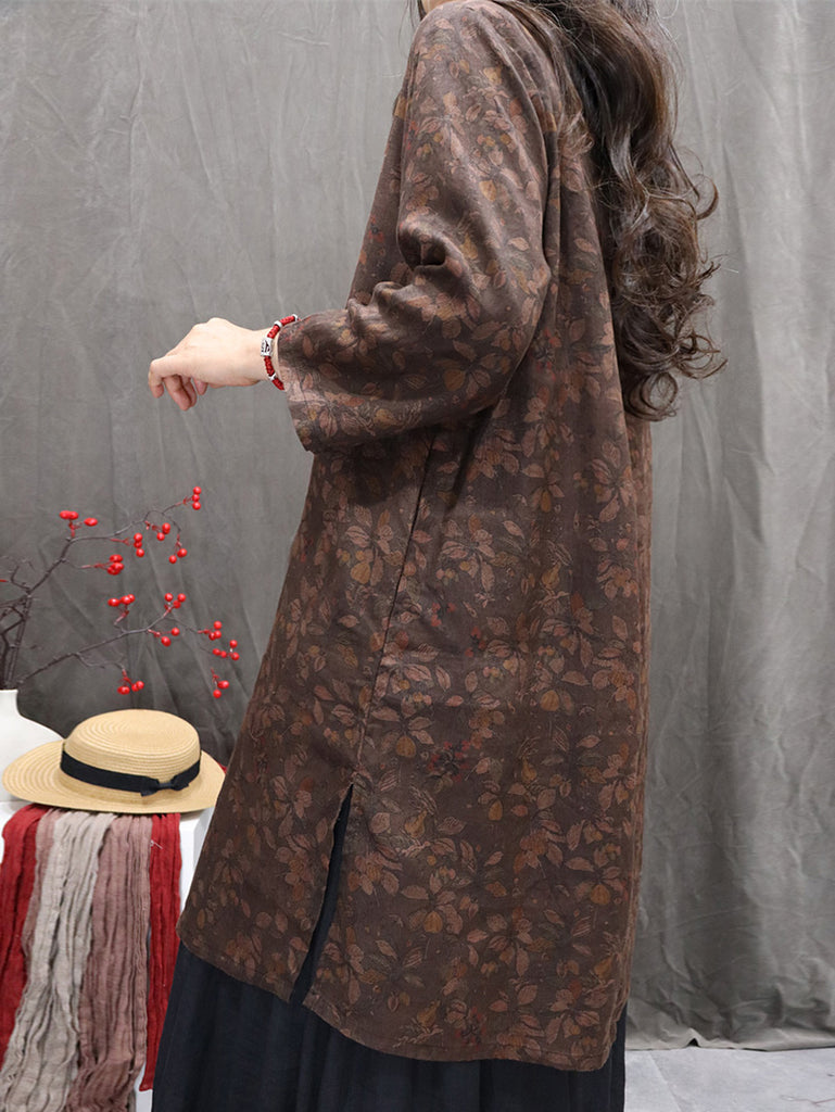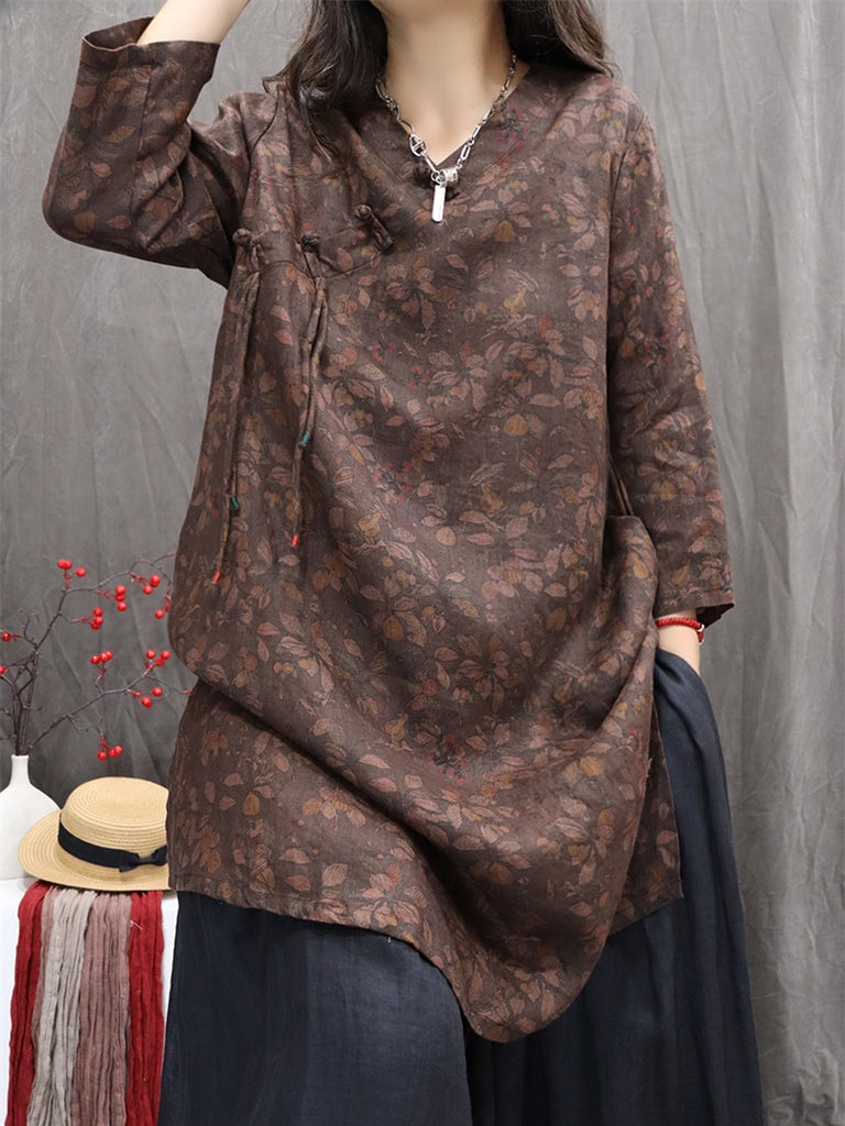 Haustskyrta með V-hálsmáli úr 100% hör, blómamynstri fyrir konur