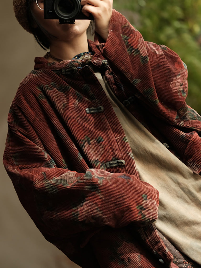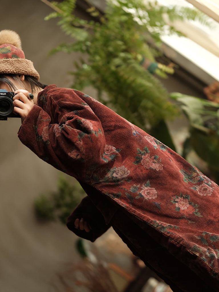 Kvenna þjóðernisblóm corduroy laus bólstraður kápu
