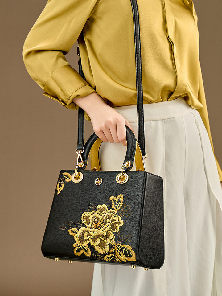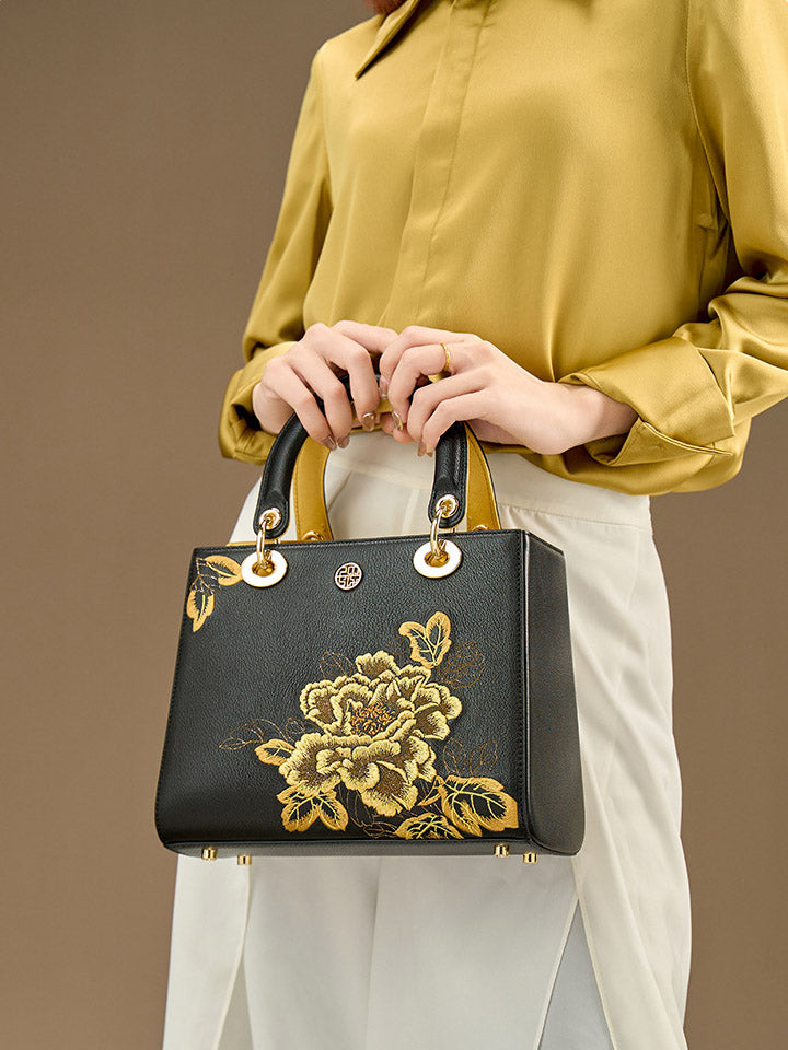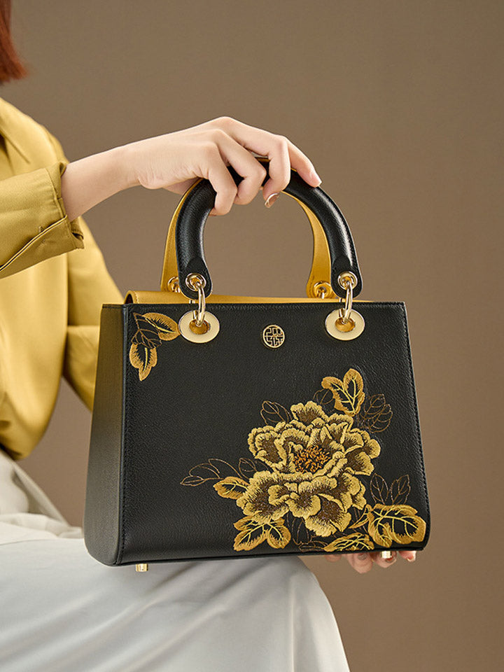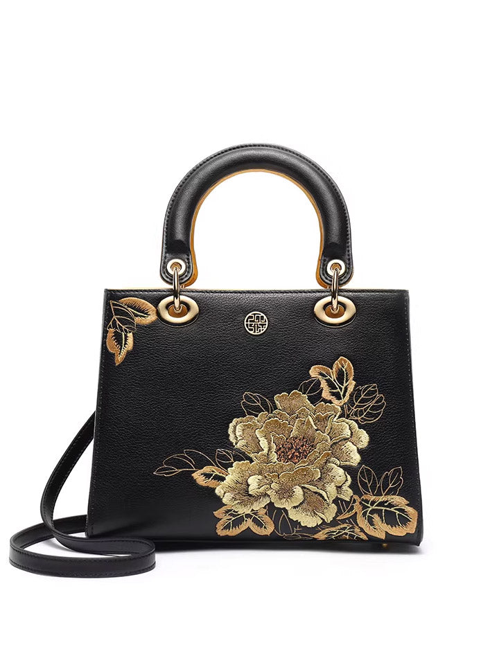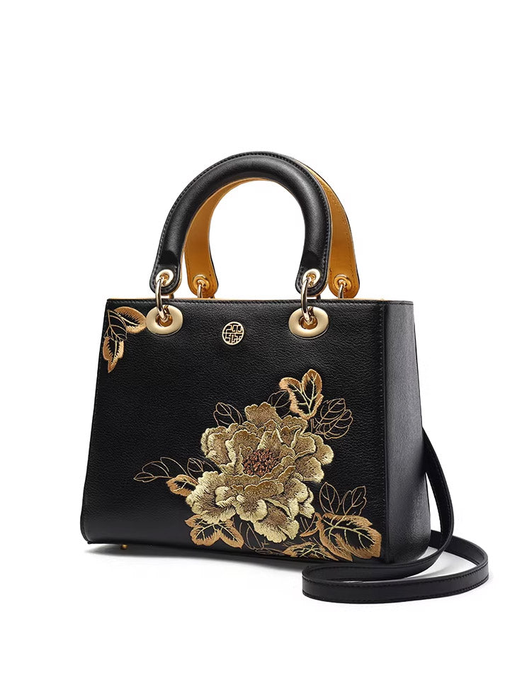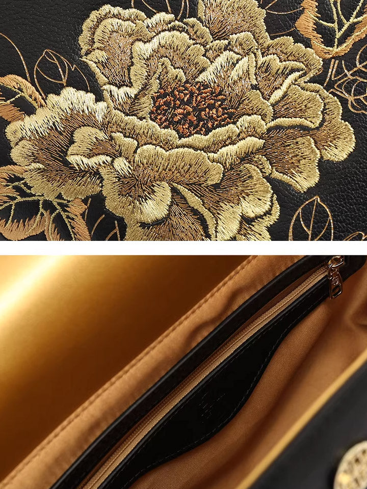 Kvenhandtaska úr leðri með útsaumi úr etnískum blómum