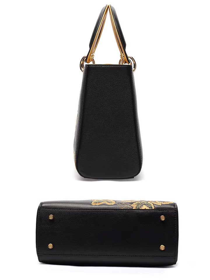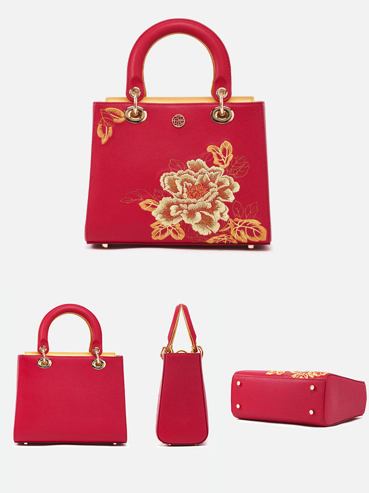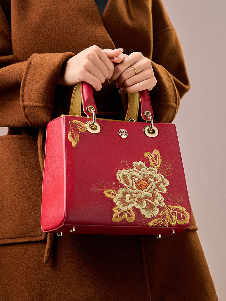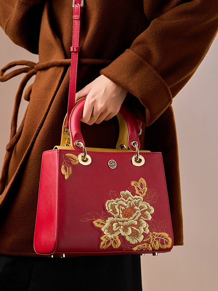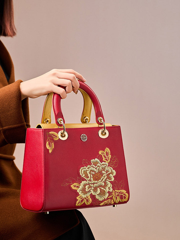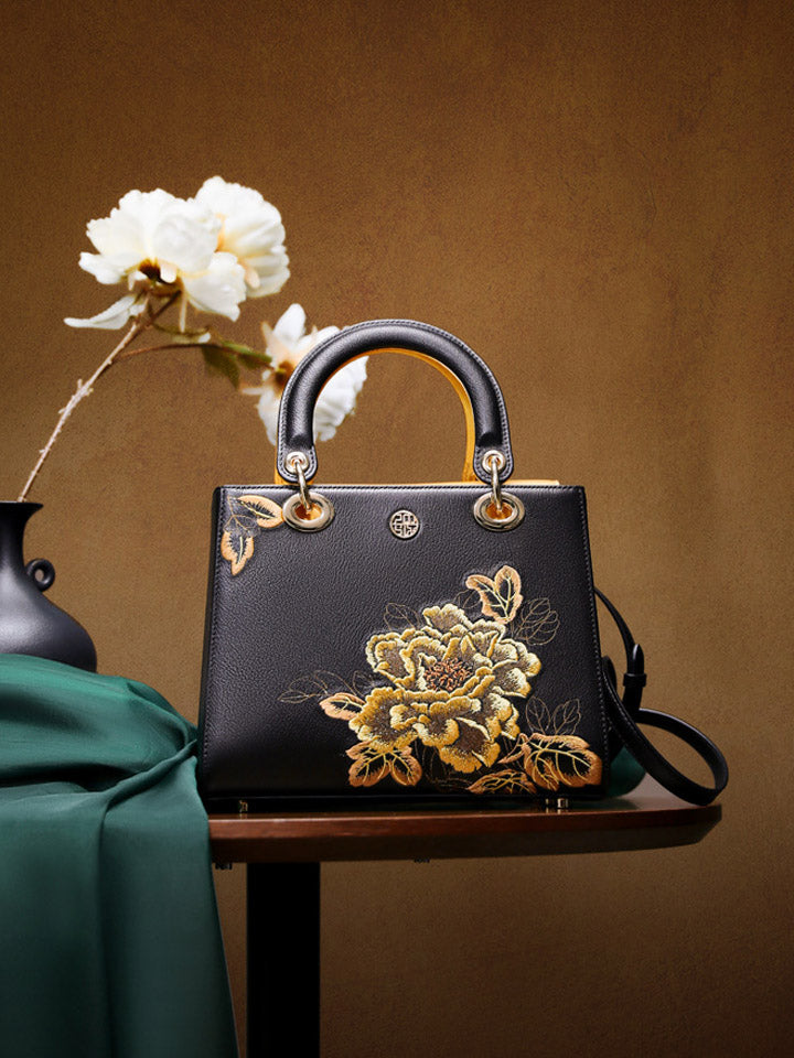 Kvenhandtaska úr leðri með útsaumi úr etnískum blómum