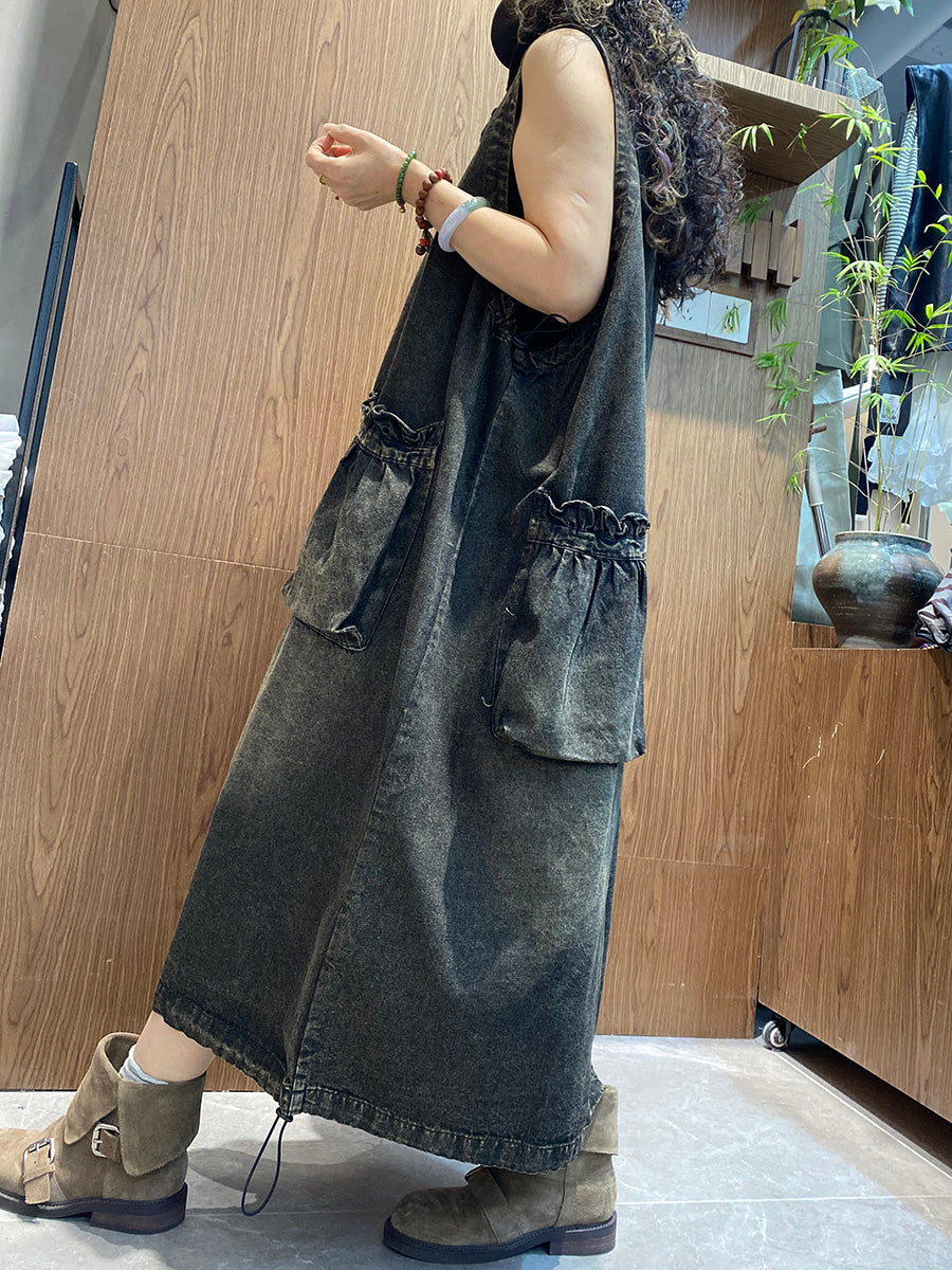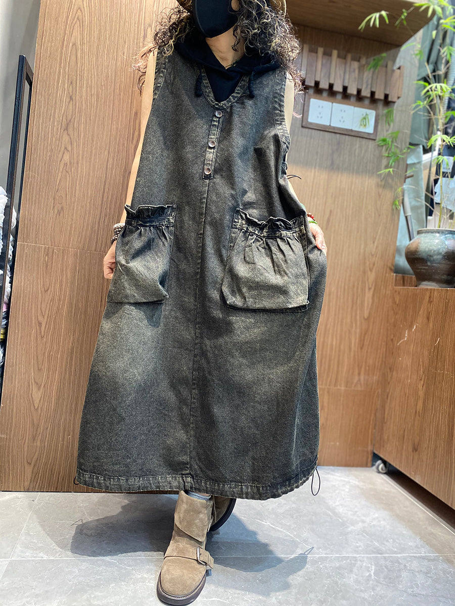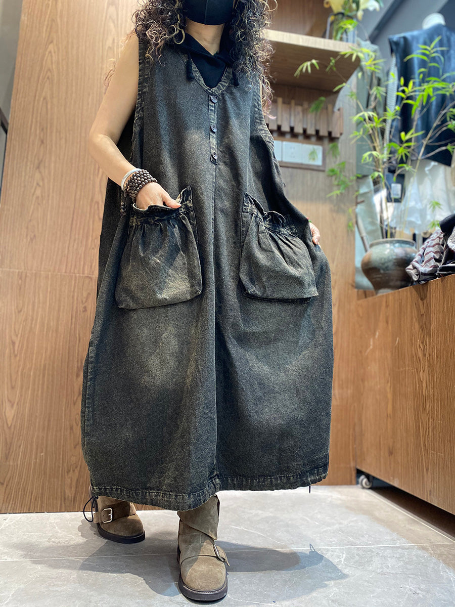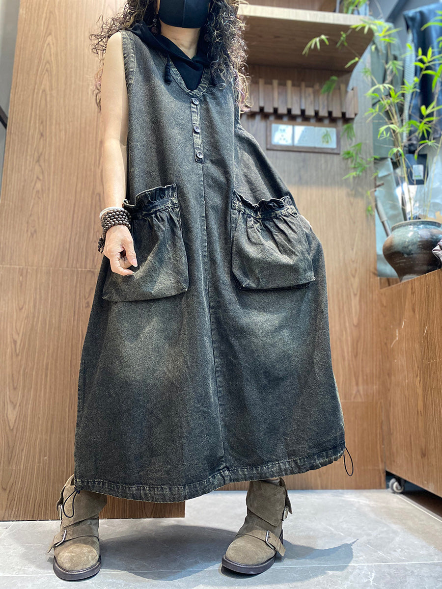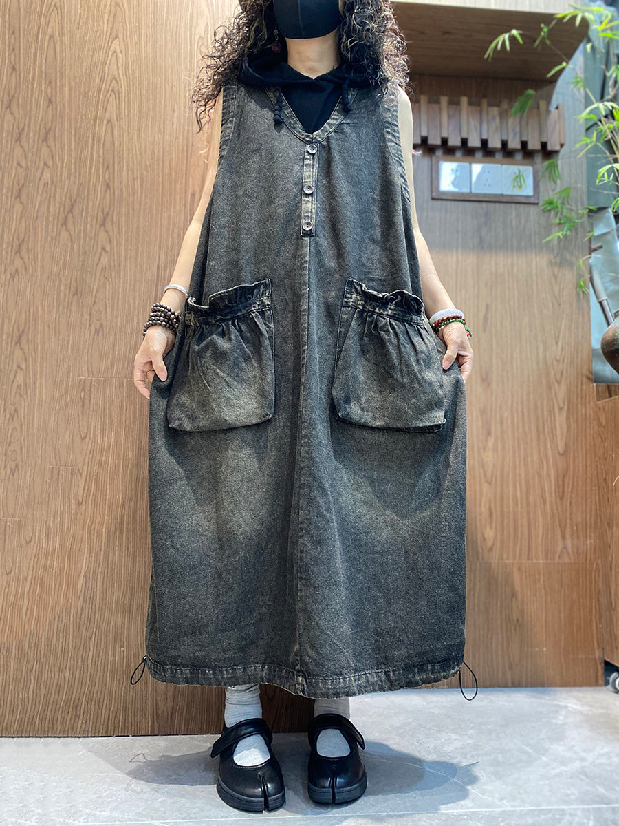 Kvenkyns sumarkjóll með V-hálsmáli úr denim