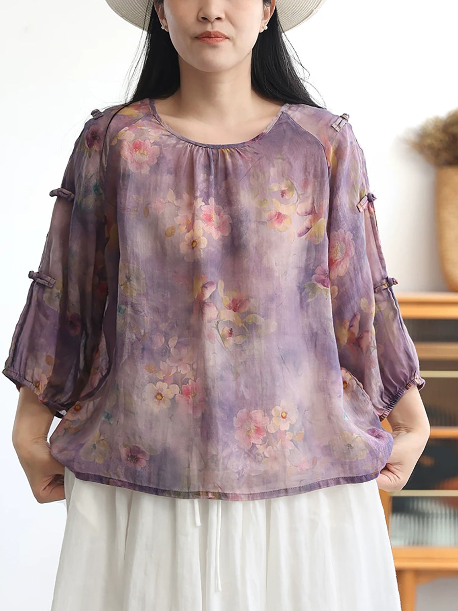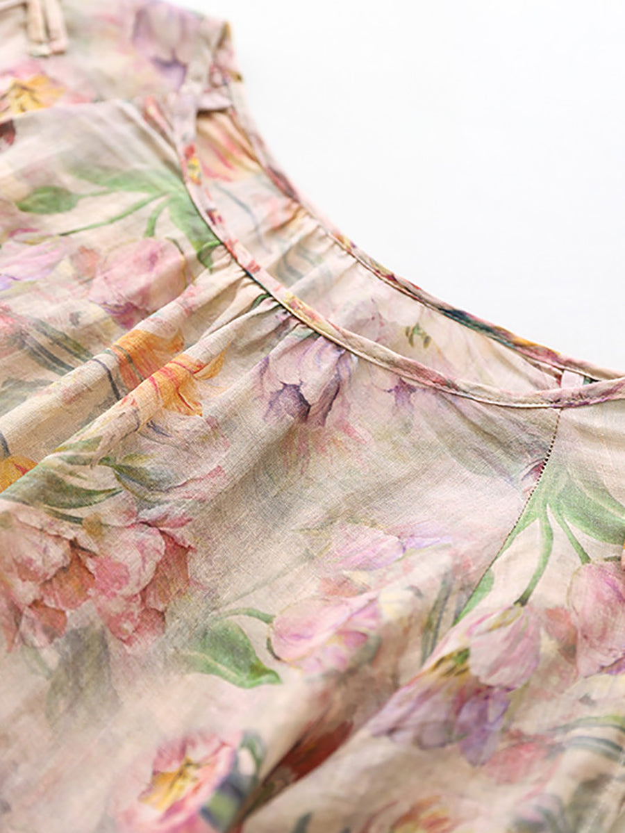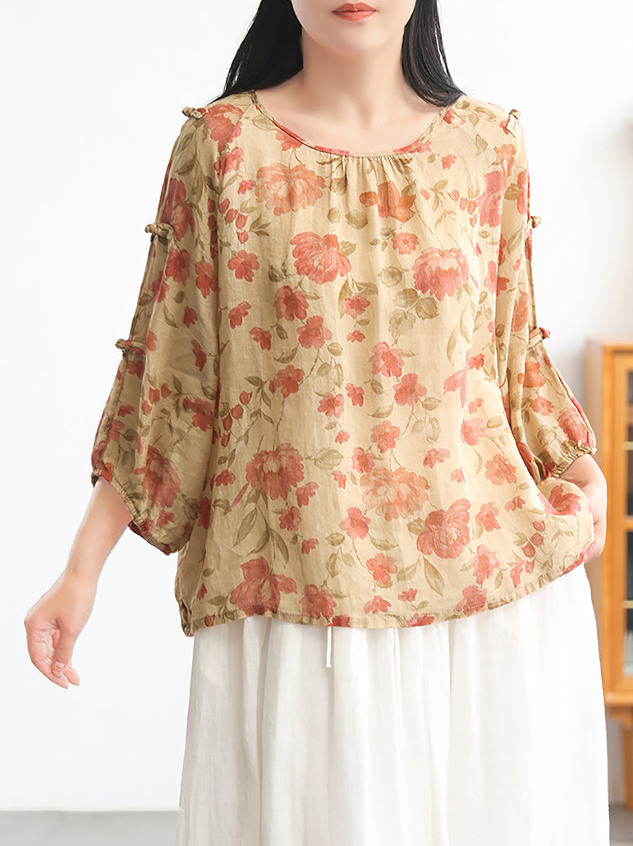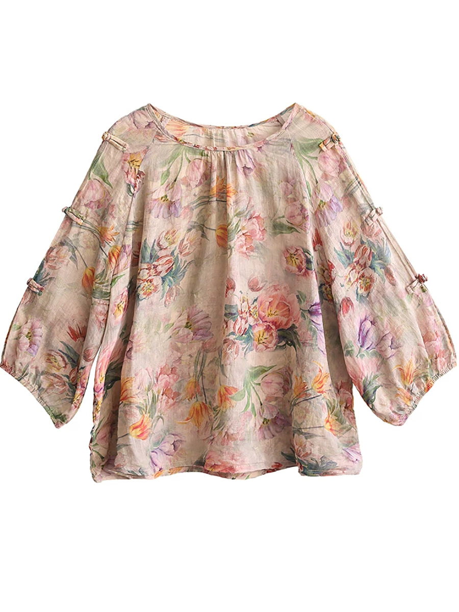 Blusa estiva da donna con scollo a V, motivo etnico floreale, 100% lino