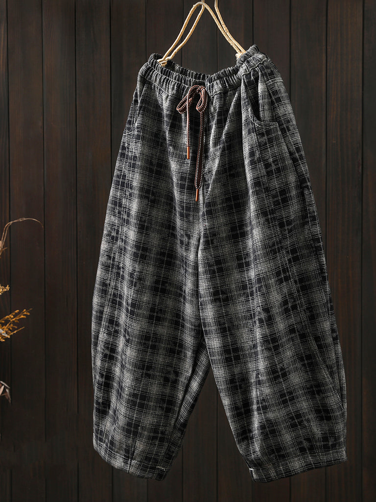 Pantaloni harem invernali da donna con fodera in pile a quadri retrò