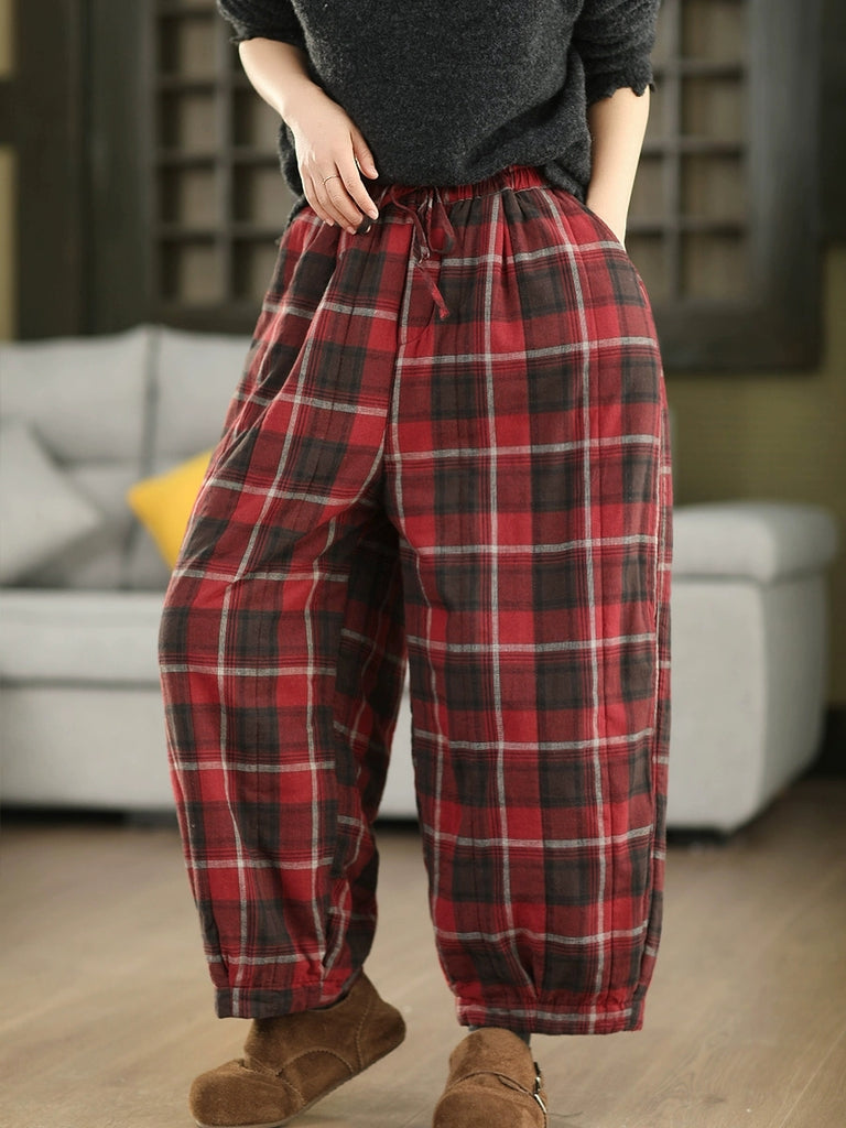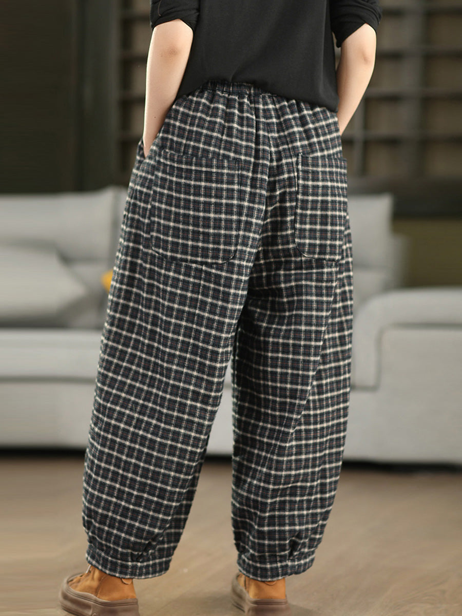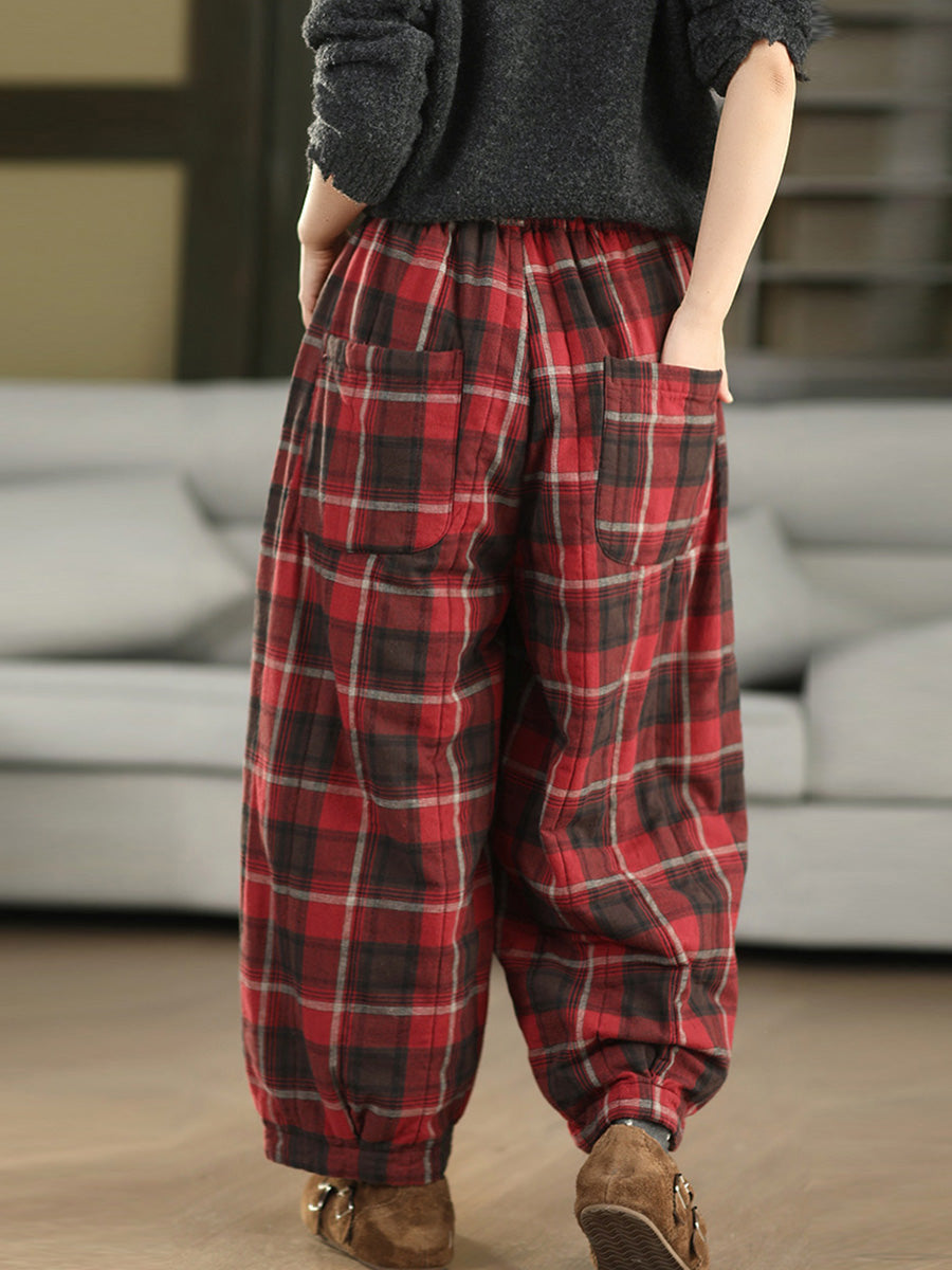Pantaloni harem imbottiti in 100% cotone con motivo scozzese retrò invernale da donna
