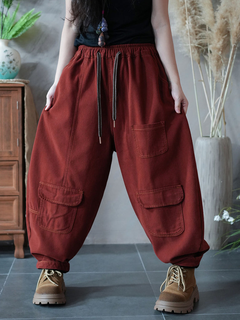 Pantaloni harem in denim vintage invernali da donna, di colore puro